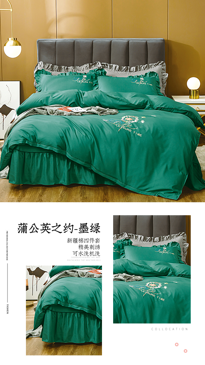 商品名称:伊而梦蚊帐 2023新款仿真丝刺绣四件套--蒲公英之约 蒲公英之约-墨绿