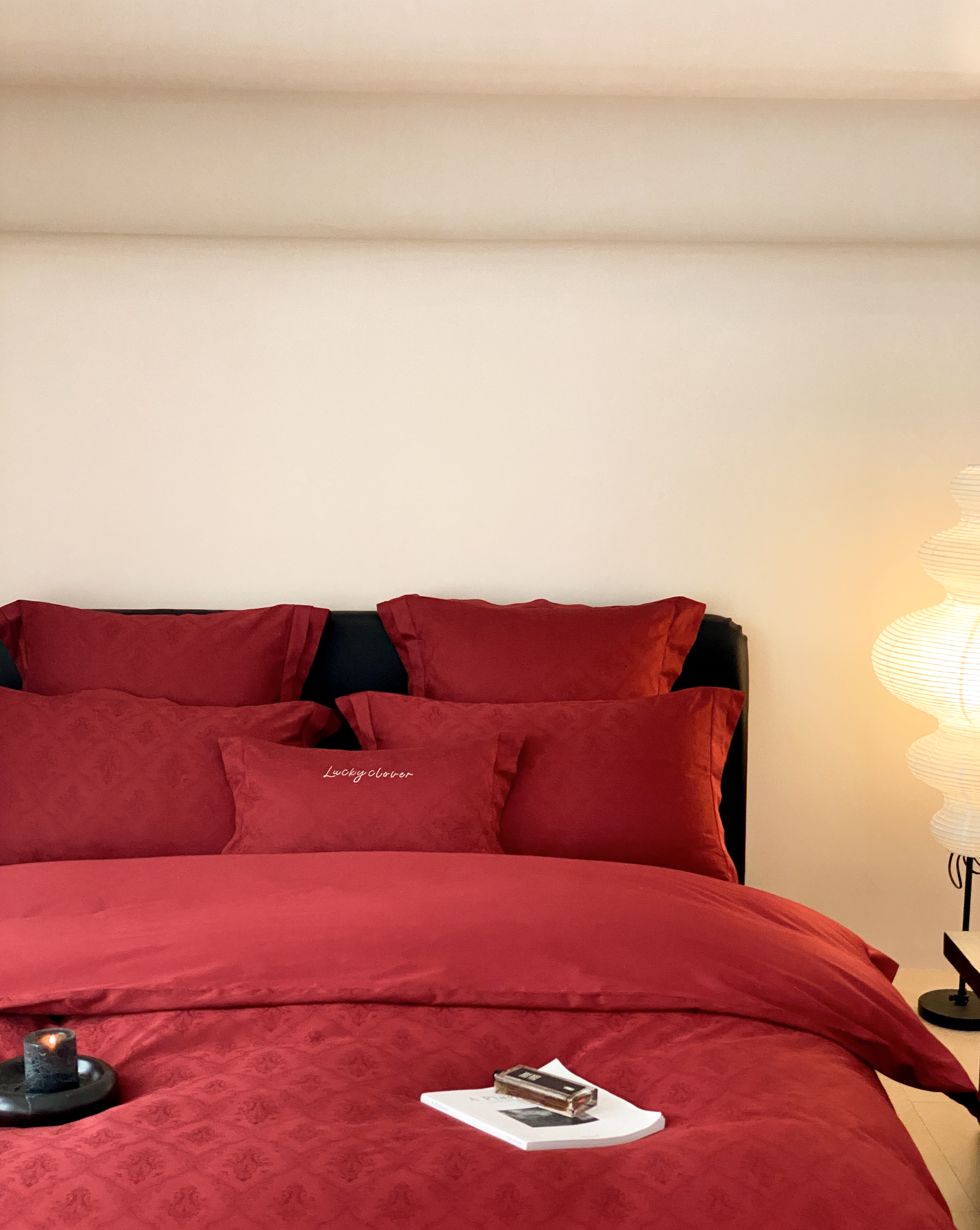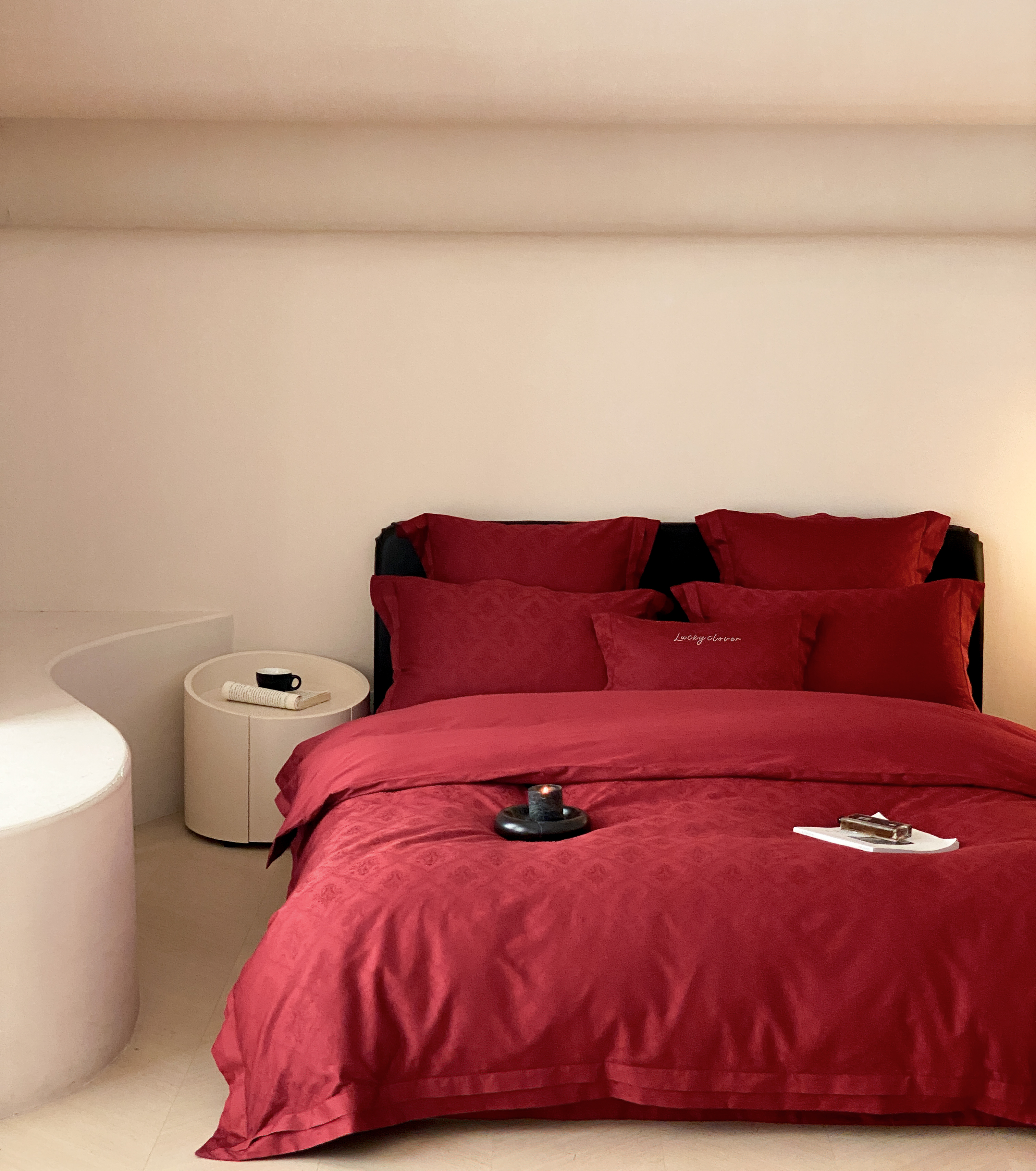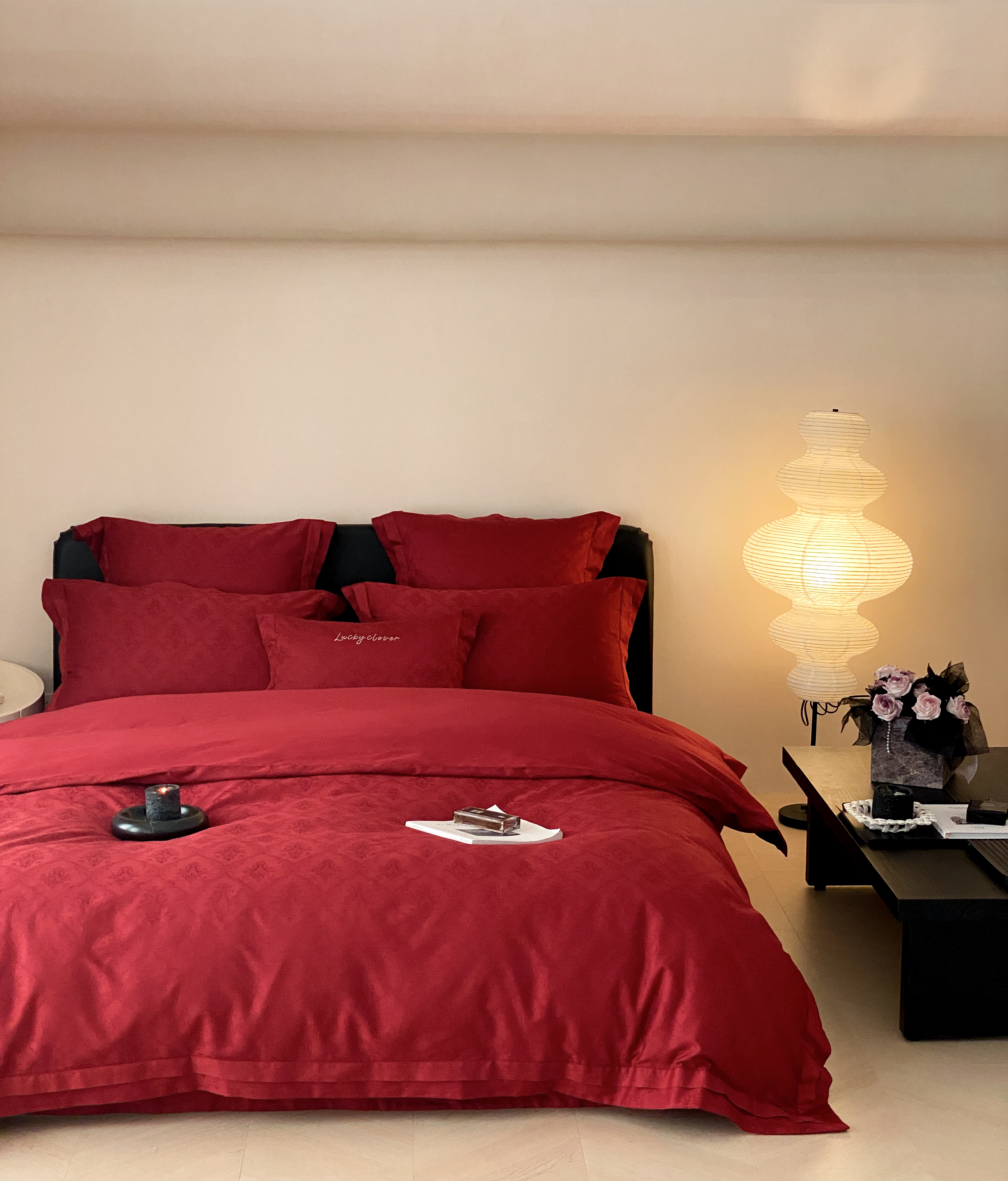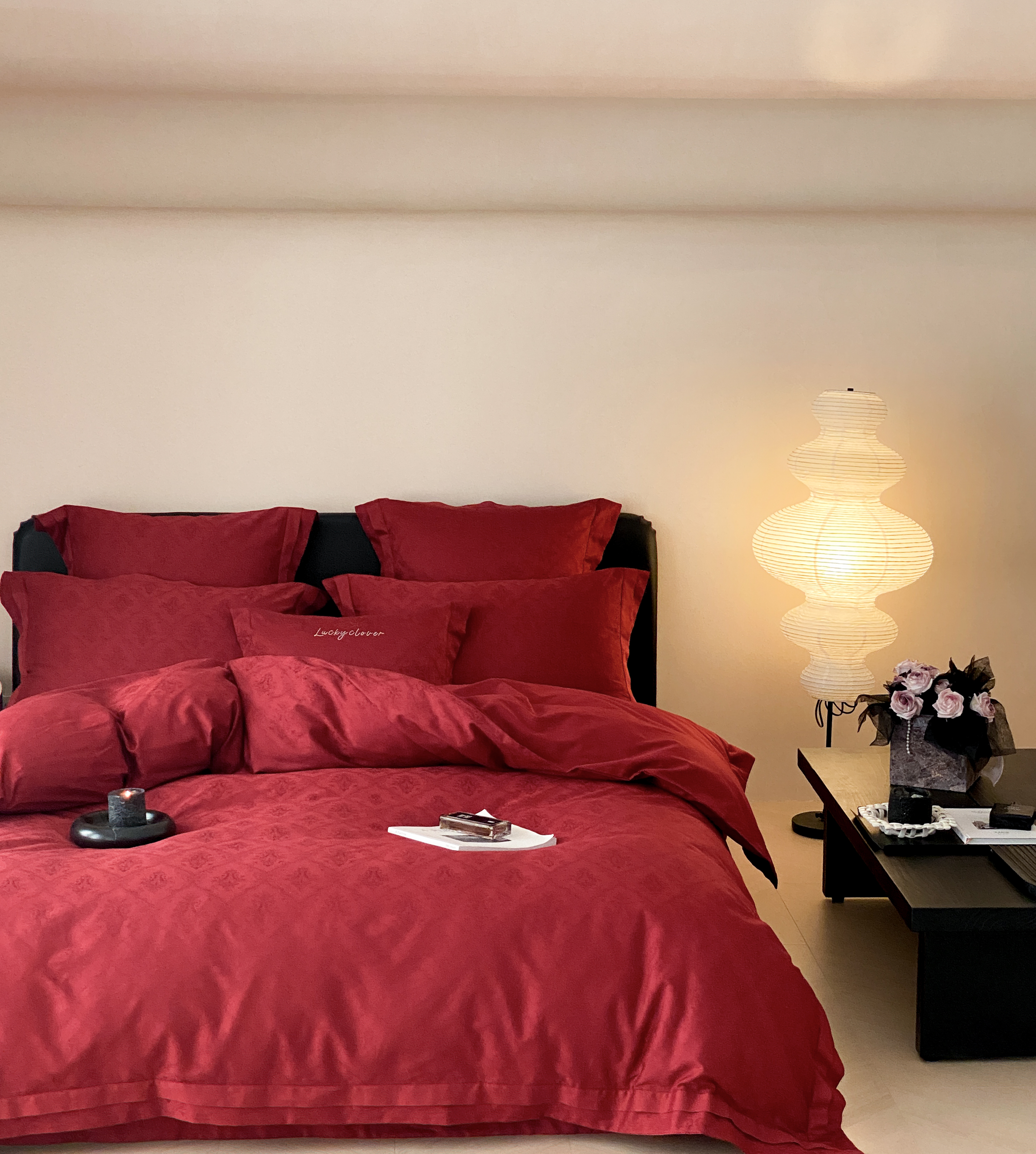 (总)优然居家纺 2025春夏新款木耳边喜字蝴蝶结小爱心复古红四件套-小欢喜,小欢喜