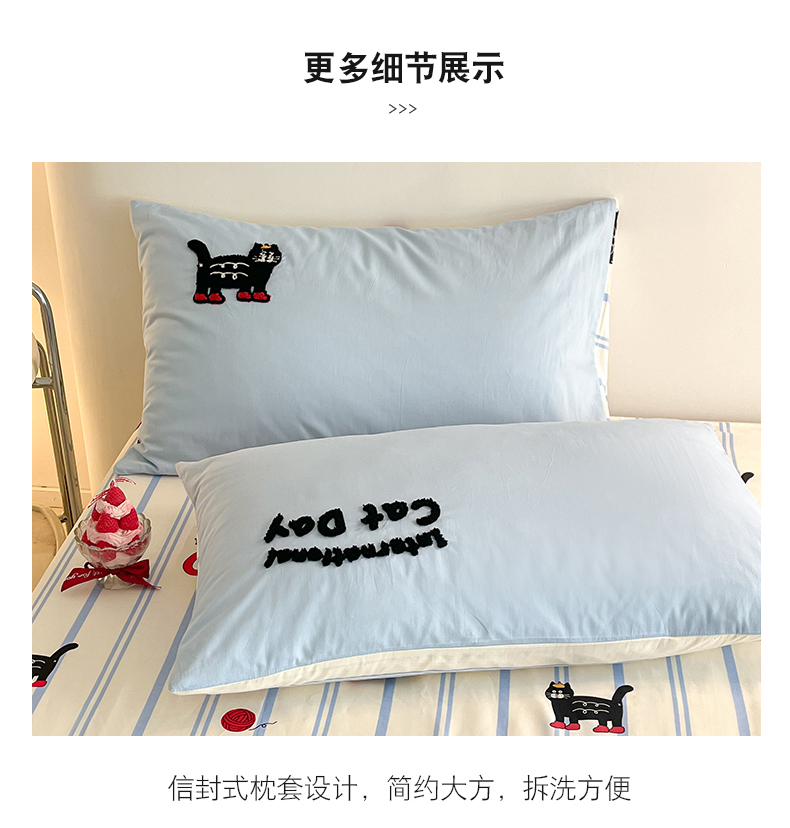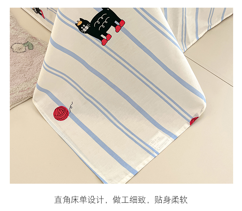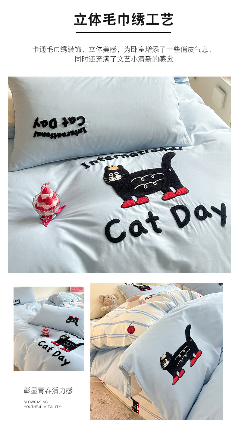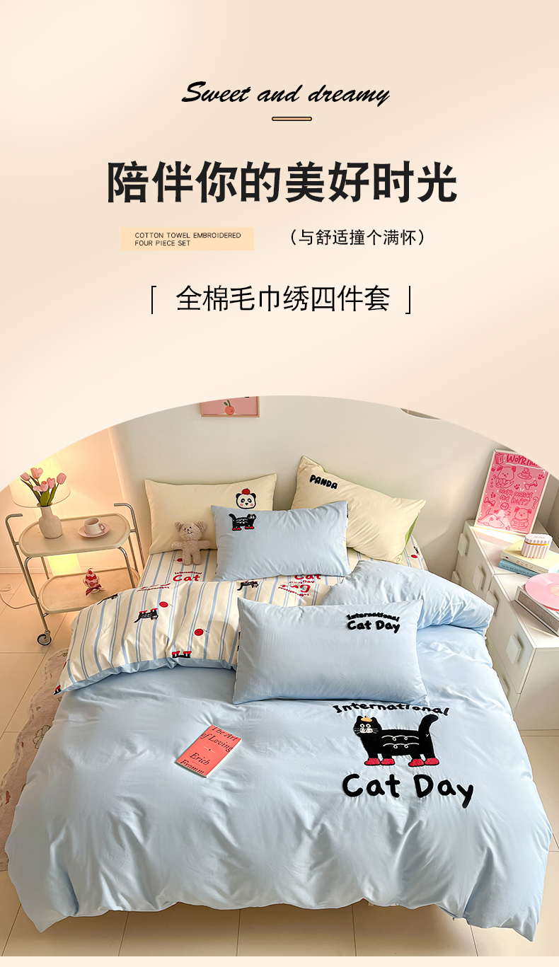 商品名称:金丝鸟家纺 2024新款全棉混搭毛巾绣四件套可爱卡通库洛米系列 蓝色条纹猫