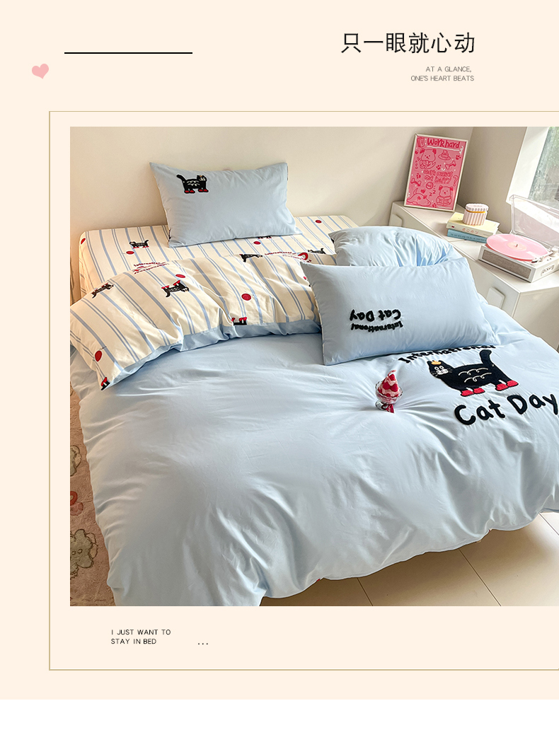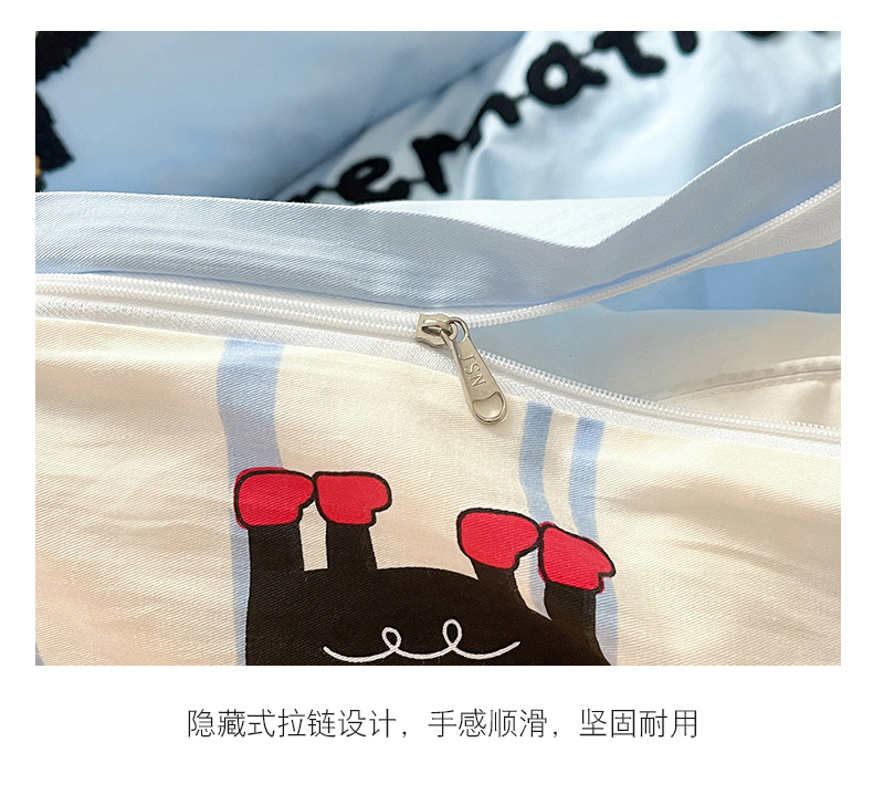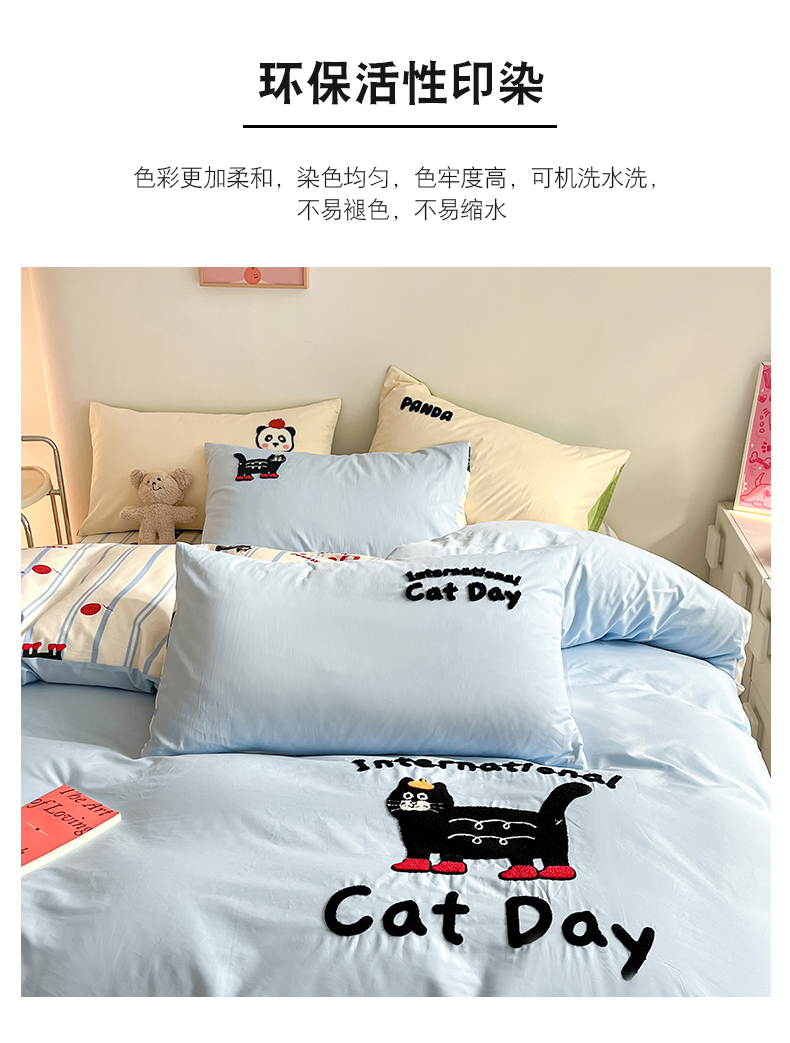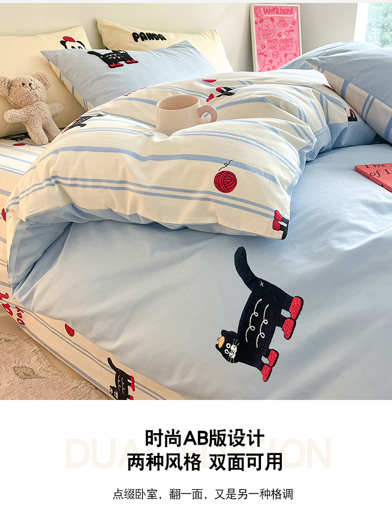商品名称:金丝鸟家纺 2024新款全棉混搭毛巾绣四件套可爱卡通库洛米系列 蓝色条纹猫