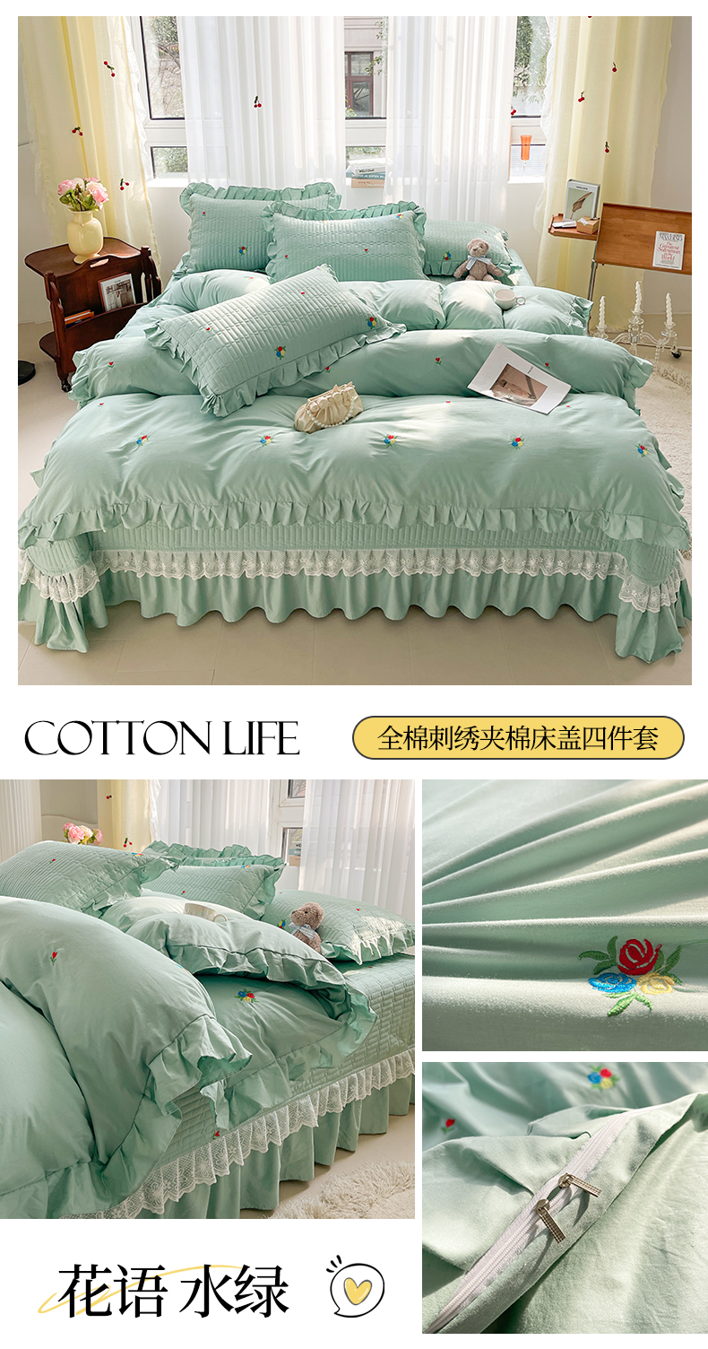 宜凡家纺 2024新款全棉夹棉绣花花边系列床盖四件套 花语 水绿