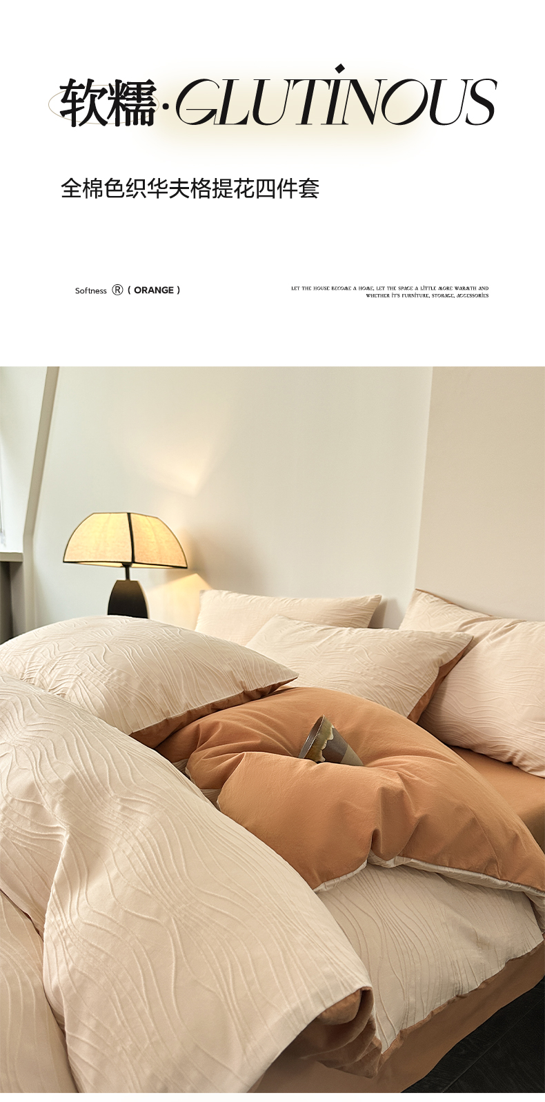 (总)雅居纺家纺 2022新款华夫格花边款四件套,梦幻蓝,橙色,纯白,米咖,浅粉,浅灰,优雅灰