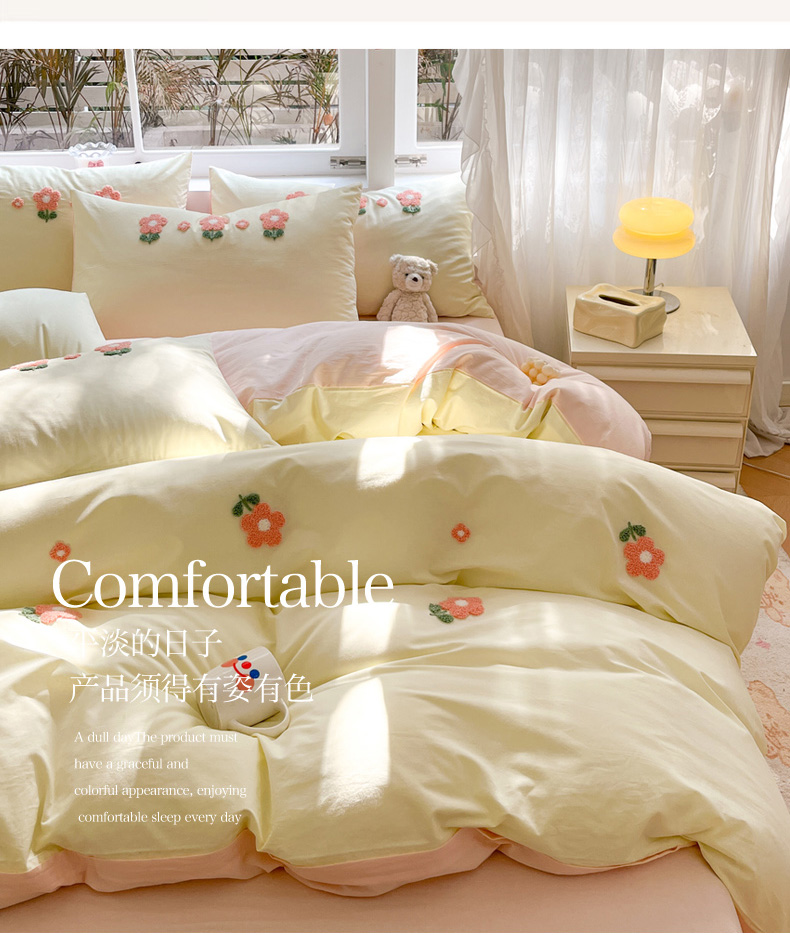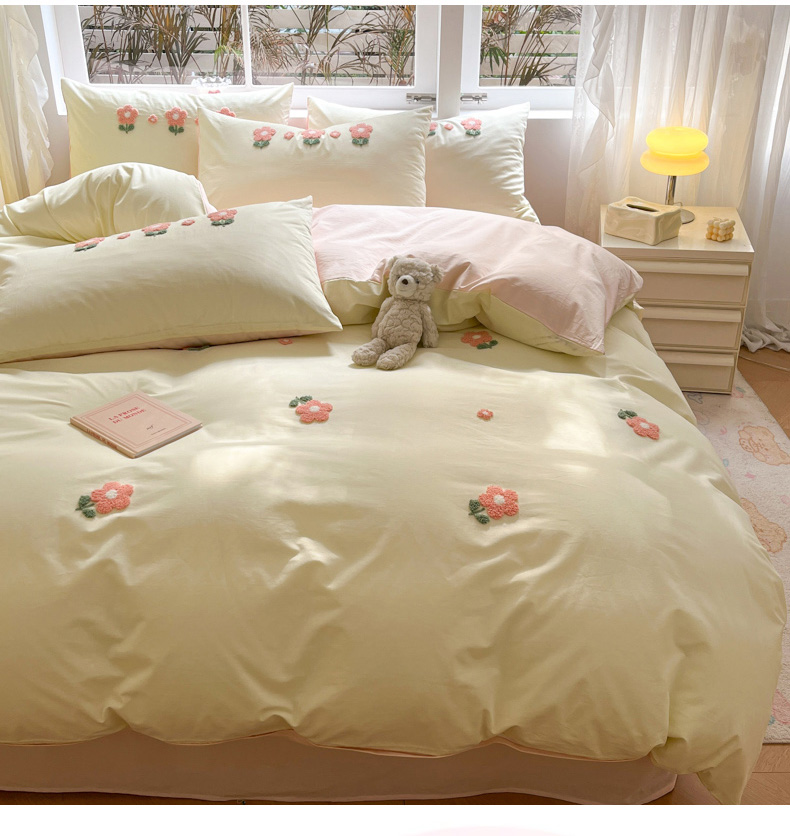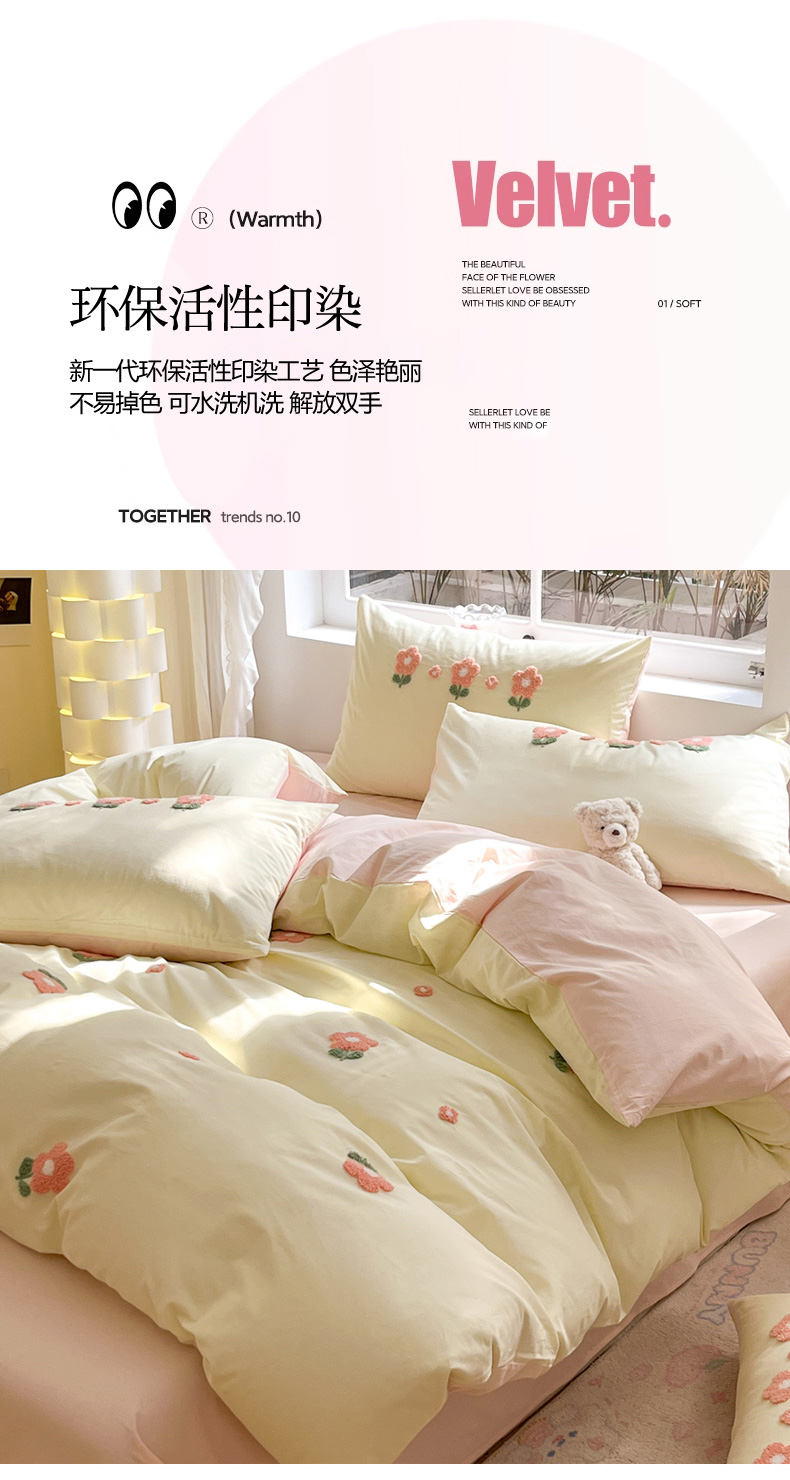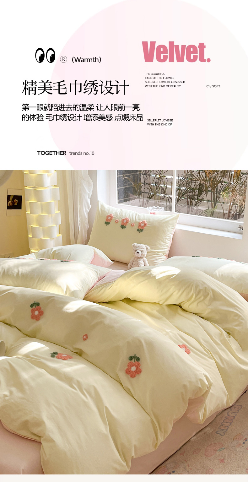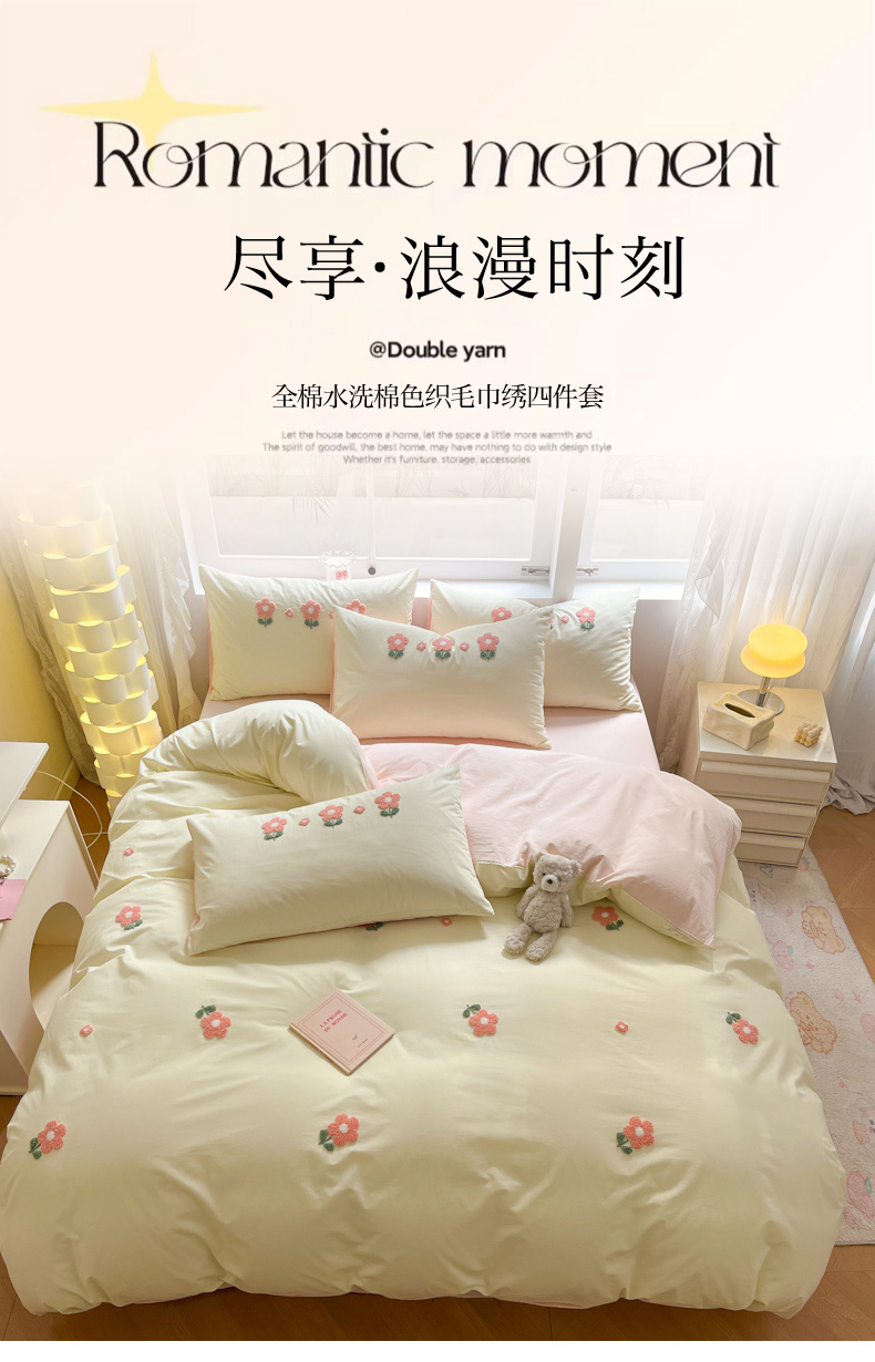 商品名称:寐居家纺 2024新款全棉水洗棉毛巾绣色织四件套 花儿朵朵-米黄