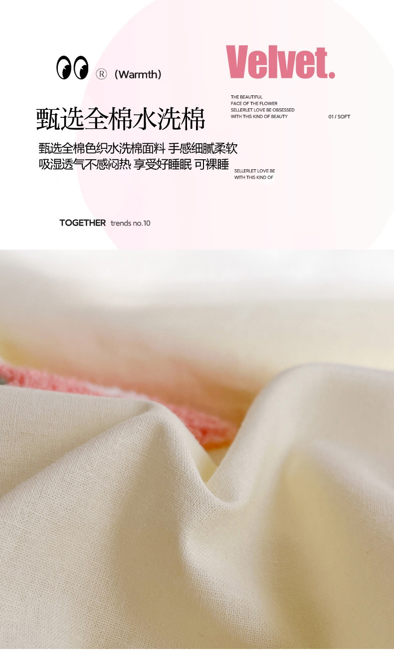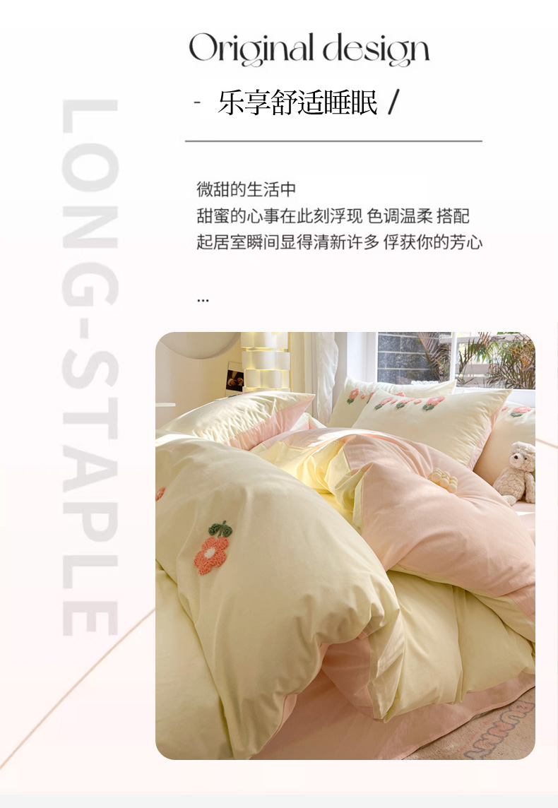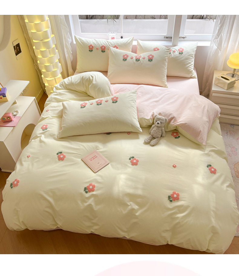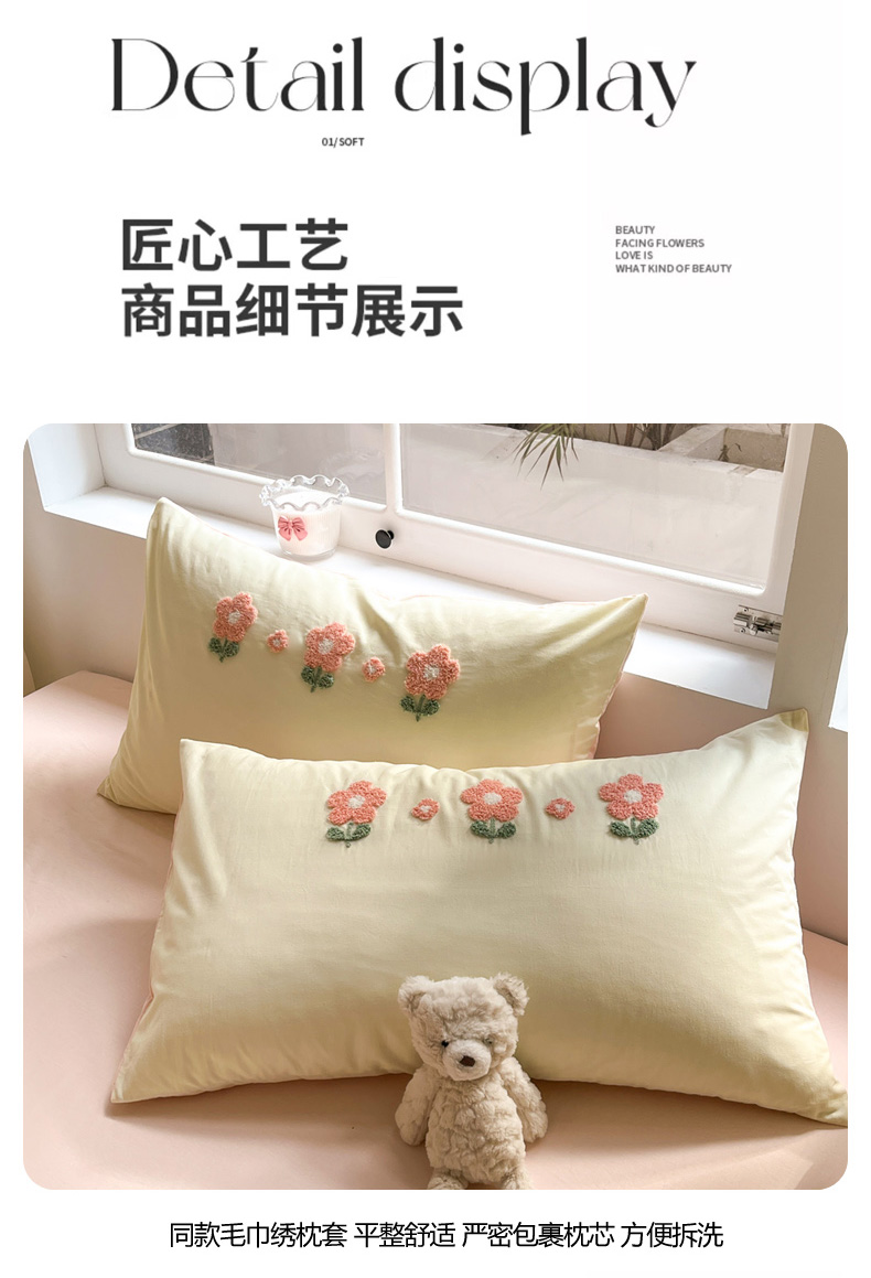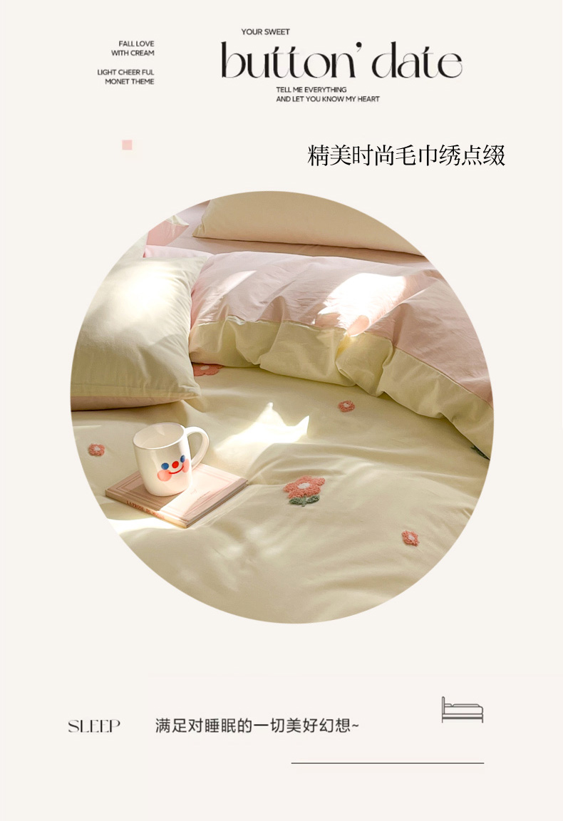 商品名称:寐居家纺 2024新款全棉水洗棉毛巾绣色织四件套 花儿朵朵-米黄