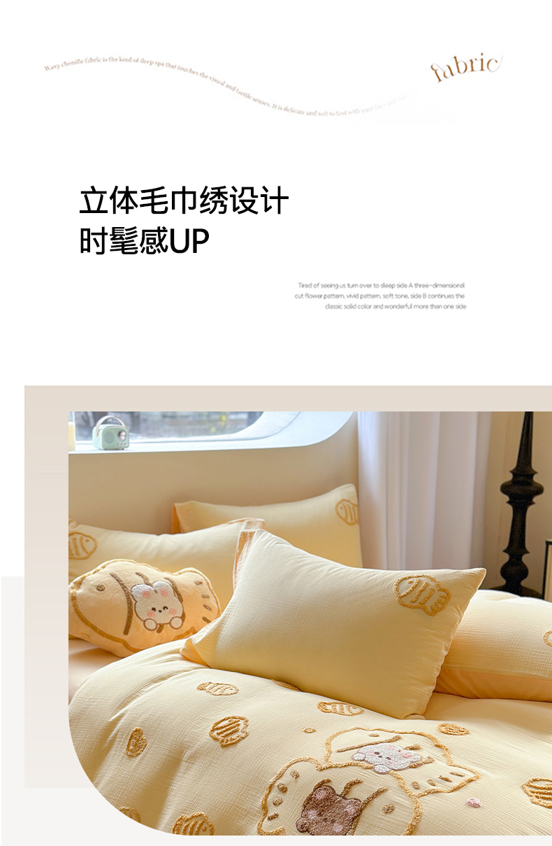 (总)眠屿家纺 2025新款加厚牛奶绒毛巾绣四件套,乐趣,面包狗,玩偶,玩泡泡