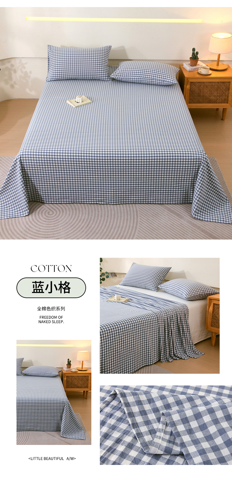 商品名称:一禾2024新款A类亲肤舒适全棉色织单品系列-单床单 蓝小格