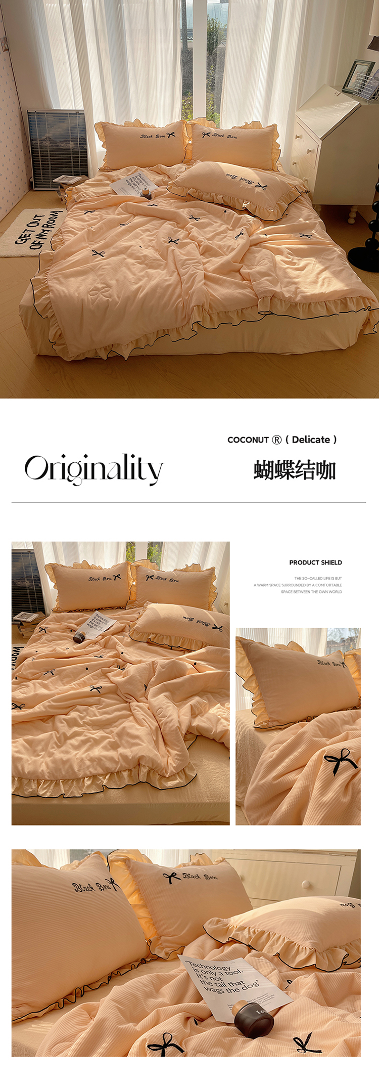 当前位置: 91家纺网 > 商品网购 > 床品套件 > 四件套 > 化纤普通四件套 > 顾里家纺 新款花边少女刺绣华夫格夏被四件套 蝴蝶结咖