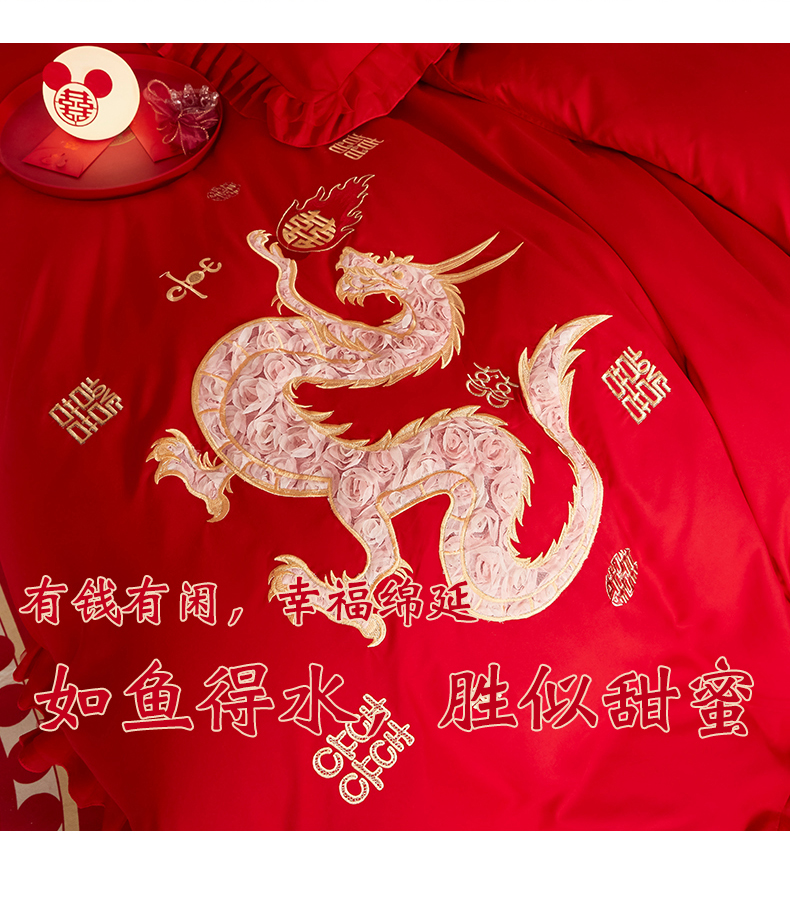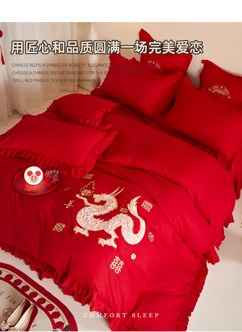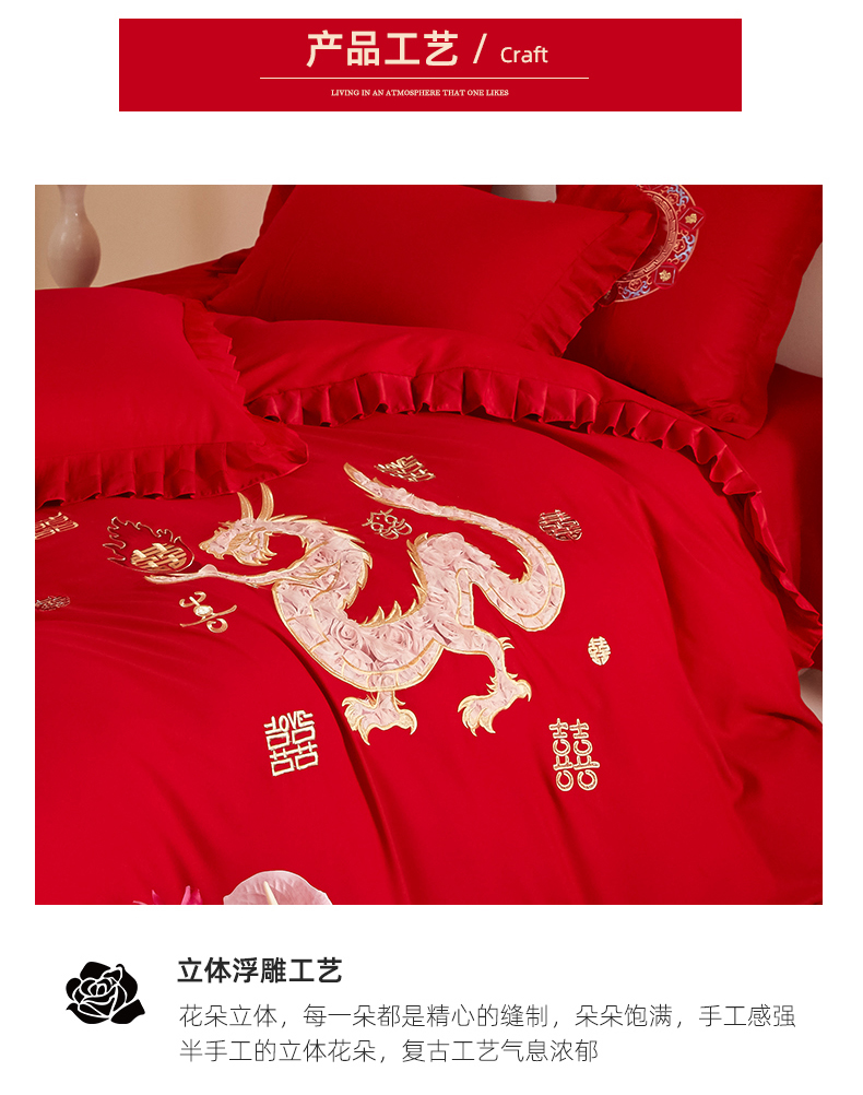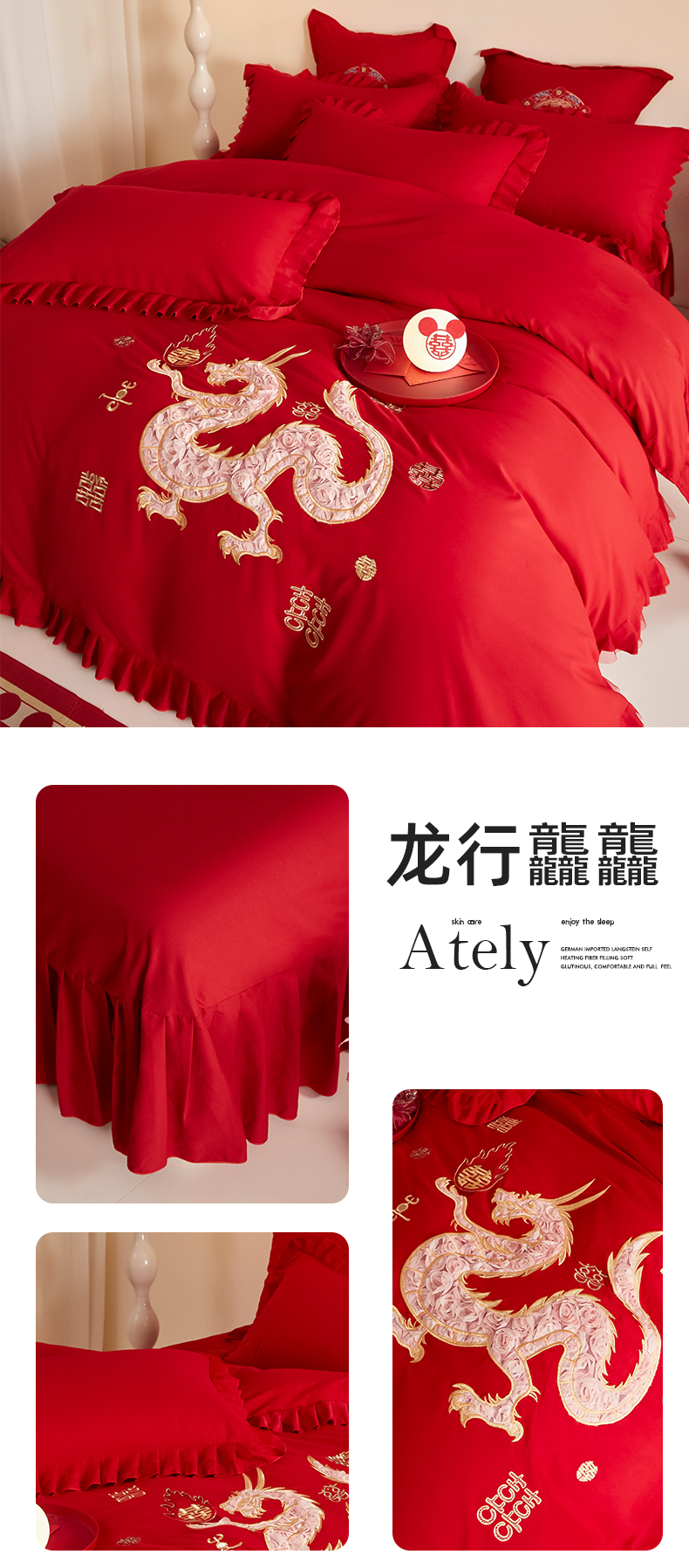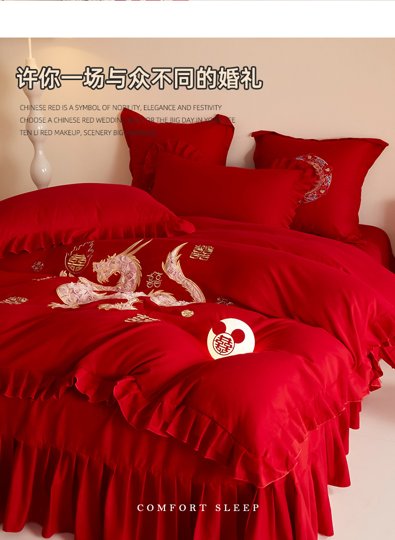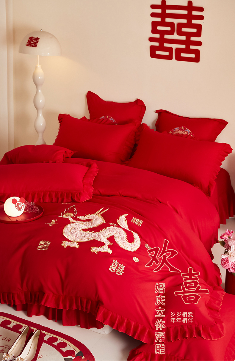 当前位置: 91家纺网 > 商品网购 > 床品套件 > 四件套 > 婚庆四件套 > 玉雅家纺 2025新款磨毛时尚浮雕花边款床裙婚庆四件套 浮雕花边款-龙行龘龘