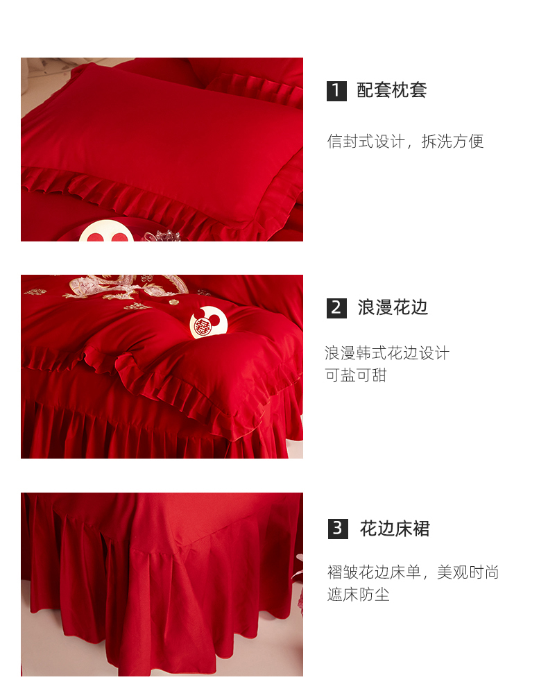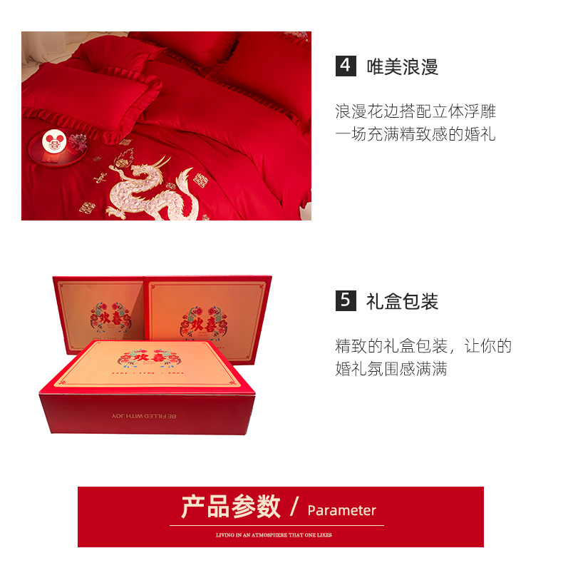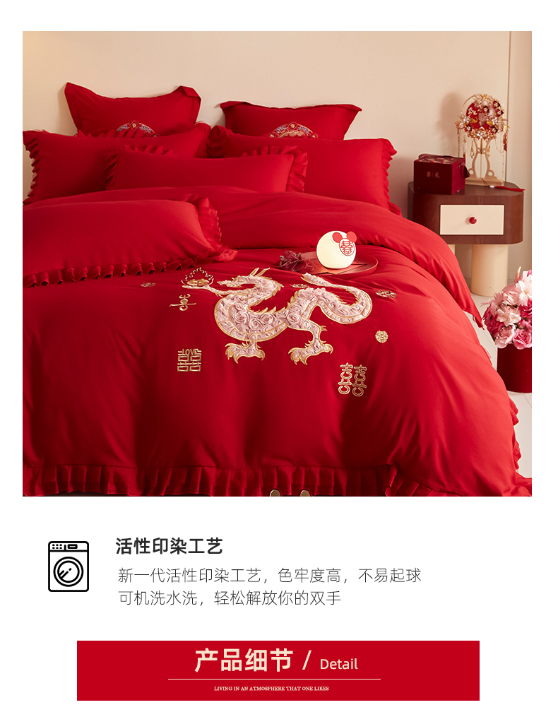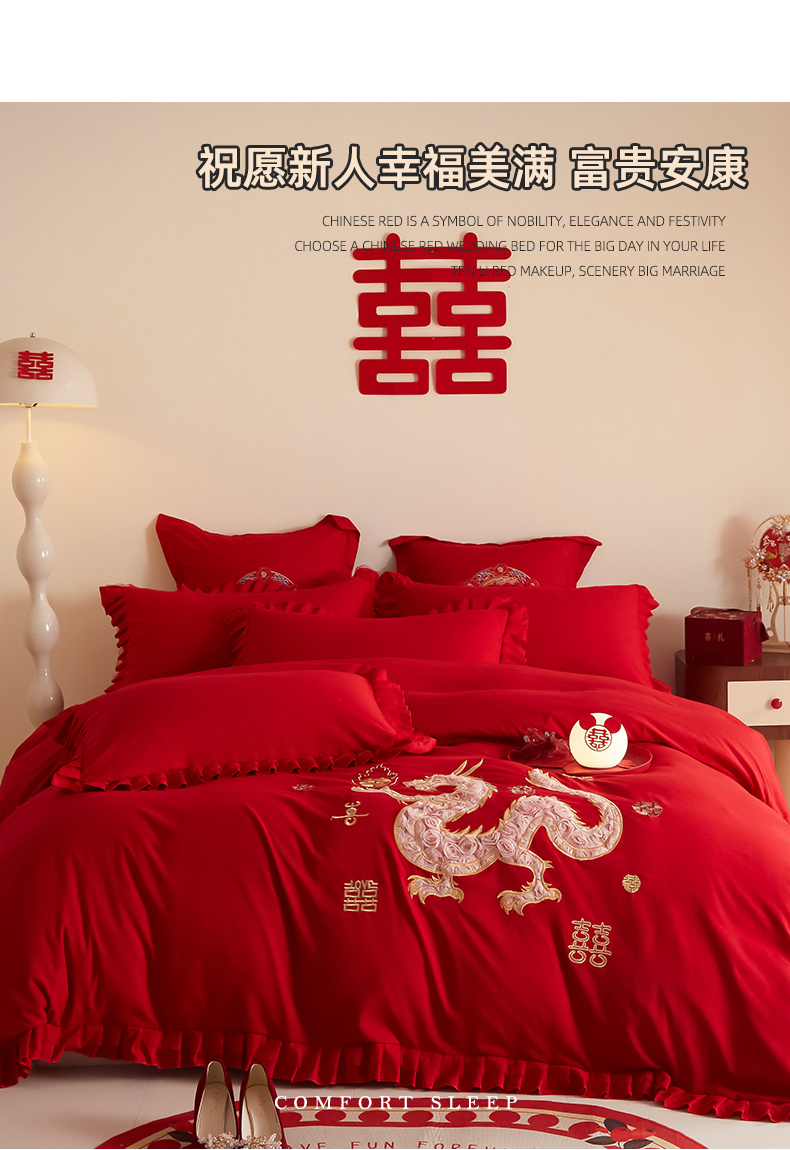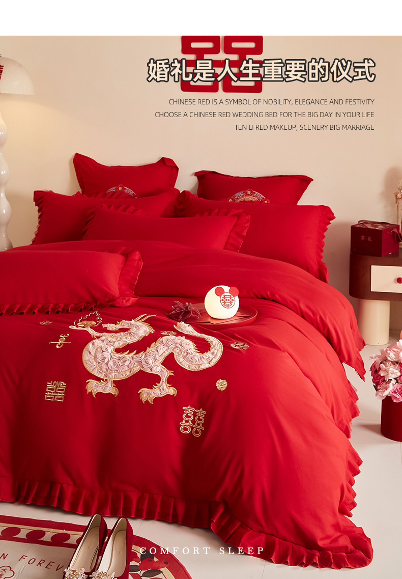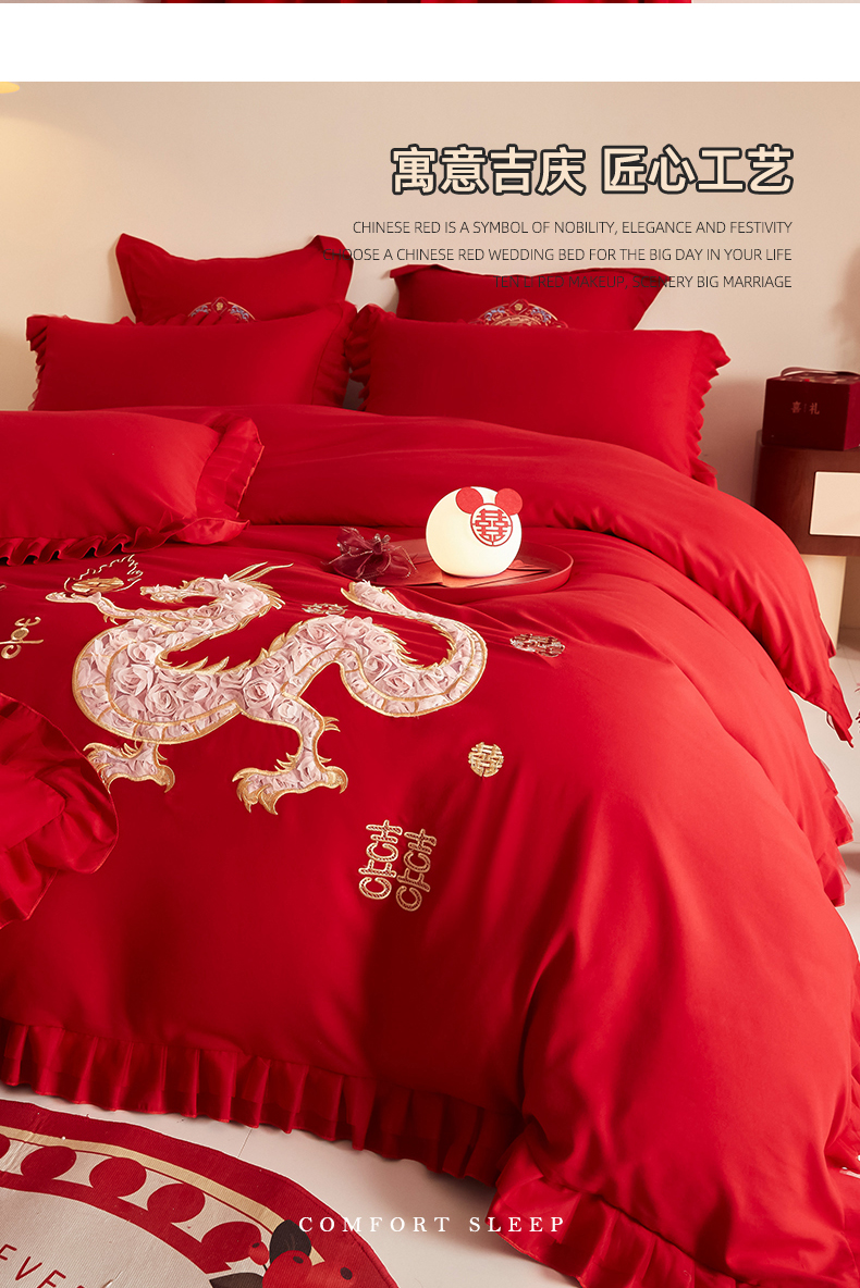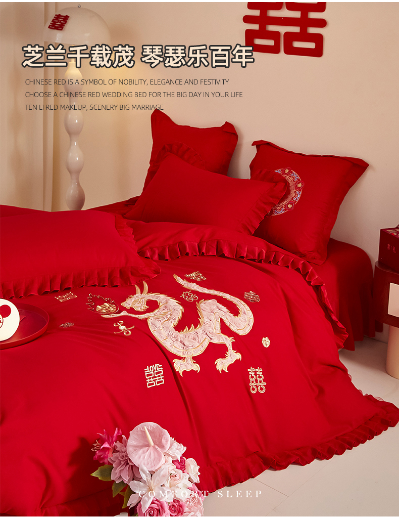 当前位置: 91家纺网 > 商品网购 > 床品套件 > 四件套 > 婚庆四件套 > 玉雅家纺 2025新款磨毛时尚浮雕花边款床裙婚庆四件套 浮雕花边款-龙行龘龘