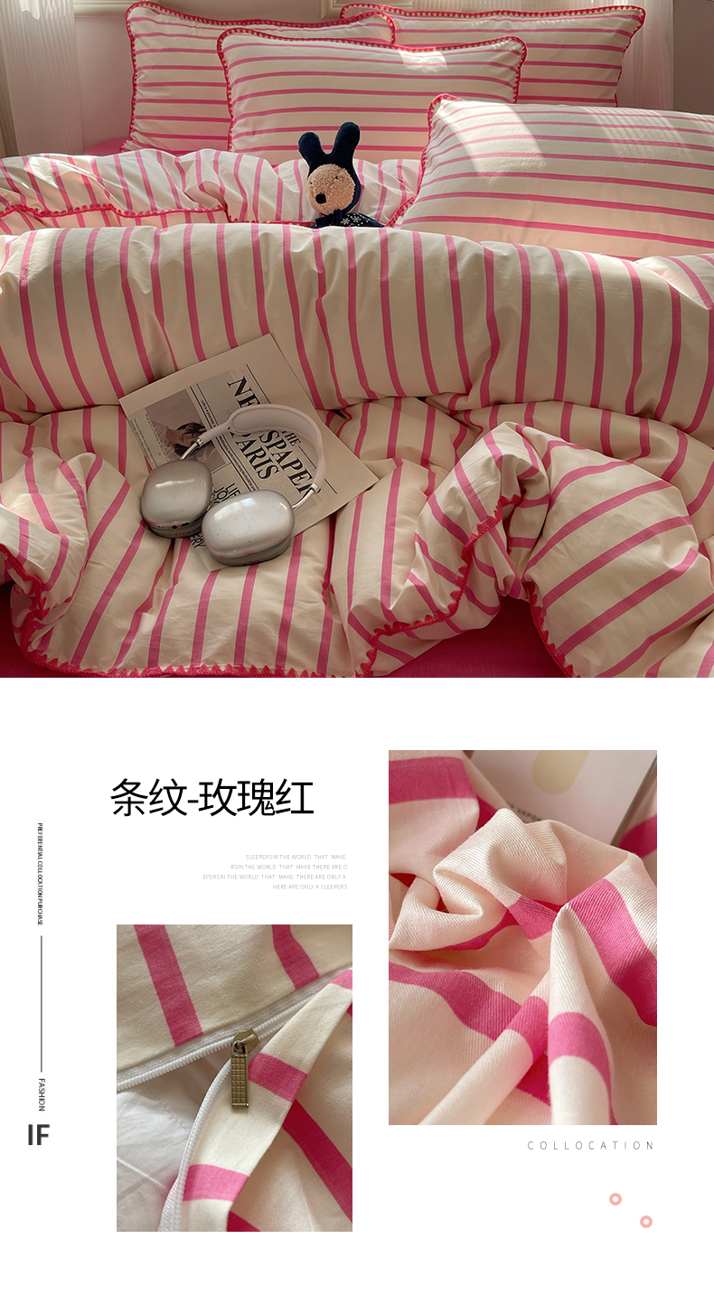 商品名称:857家居 2024新款贝壳边四件套 条纹-玫瑰红