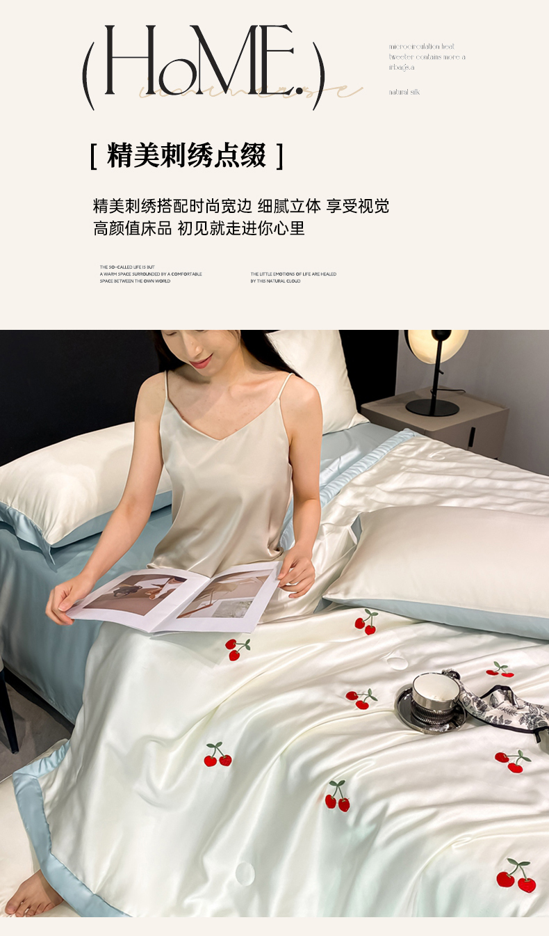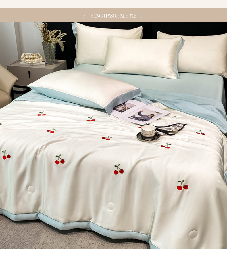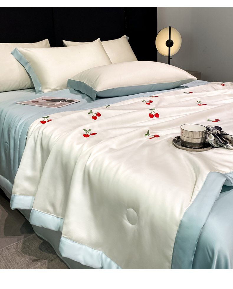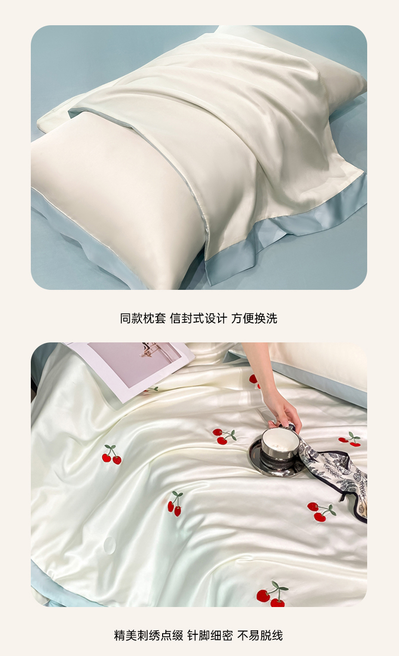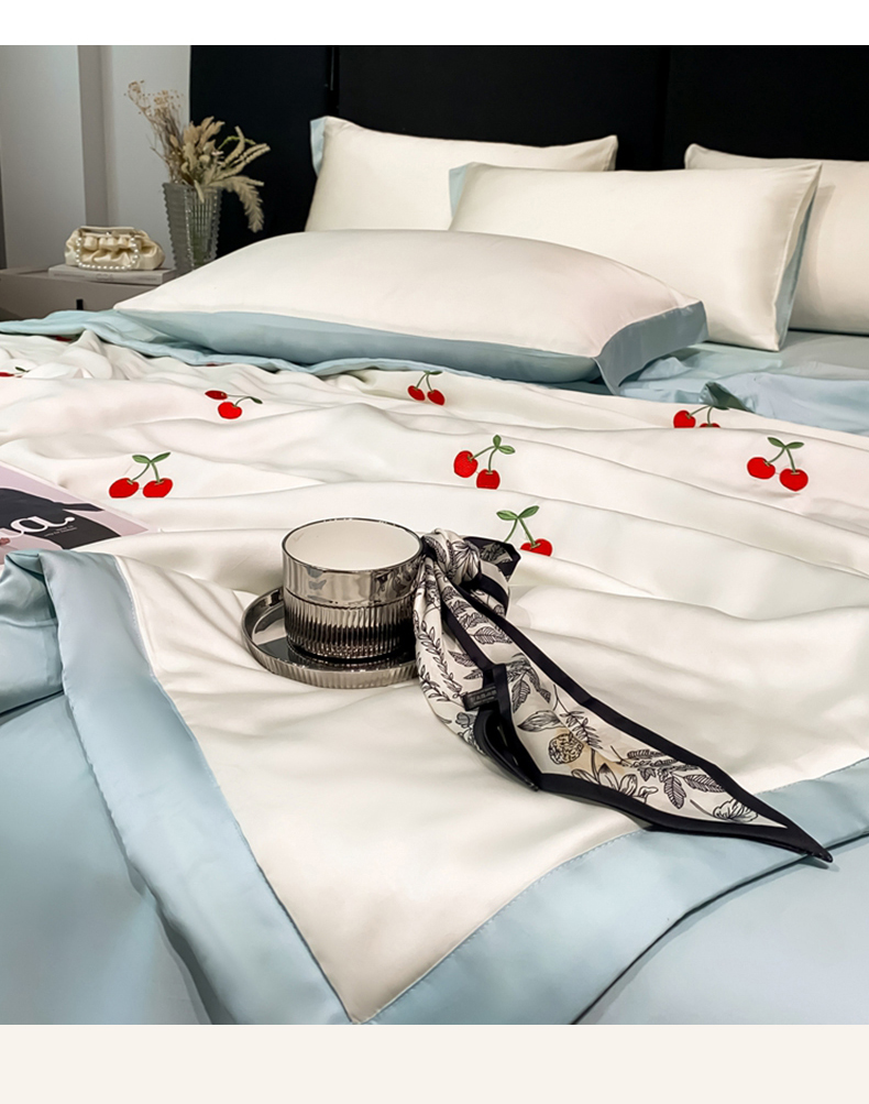 当前位置: 91家纺网 > 商品网购 > 床品套件 > 四件套 > 夏被四件套 > 利欧 2025新款刺绣水洗真丝夏被四件套 樱桃-奶白蓝