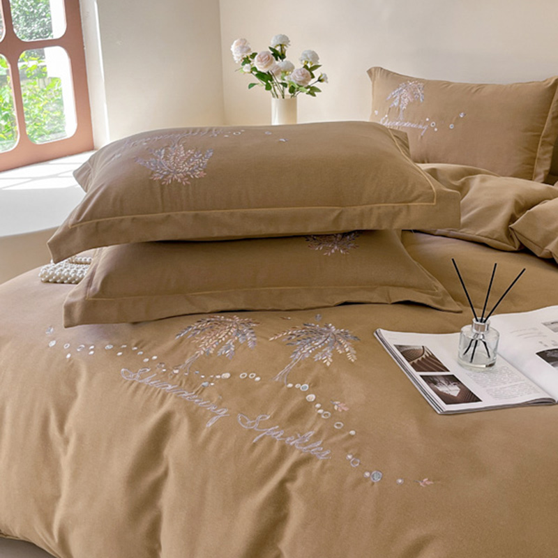 艾迪尚家纺 2025新款纯色生态磨毛绣花单枕套 幸福树-驼色