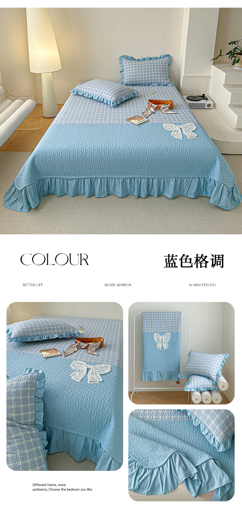 (总)源舜家纺 2025新款色织棉简约韩系花边床盖三件套,简约灰,简约粉,简约绿,简约驼,简约蓝