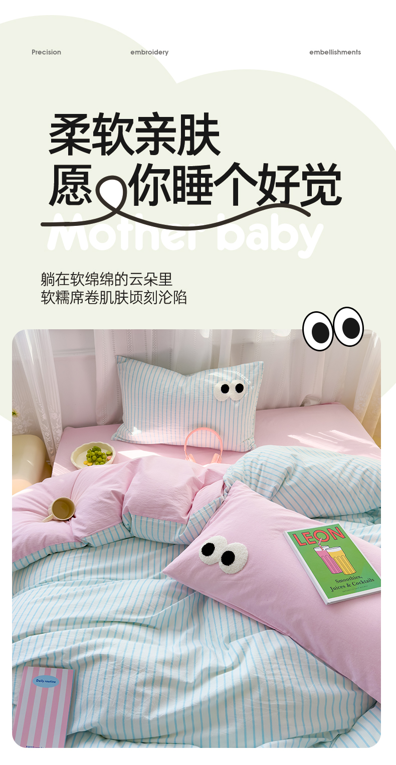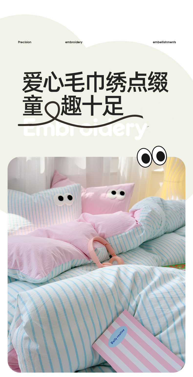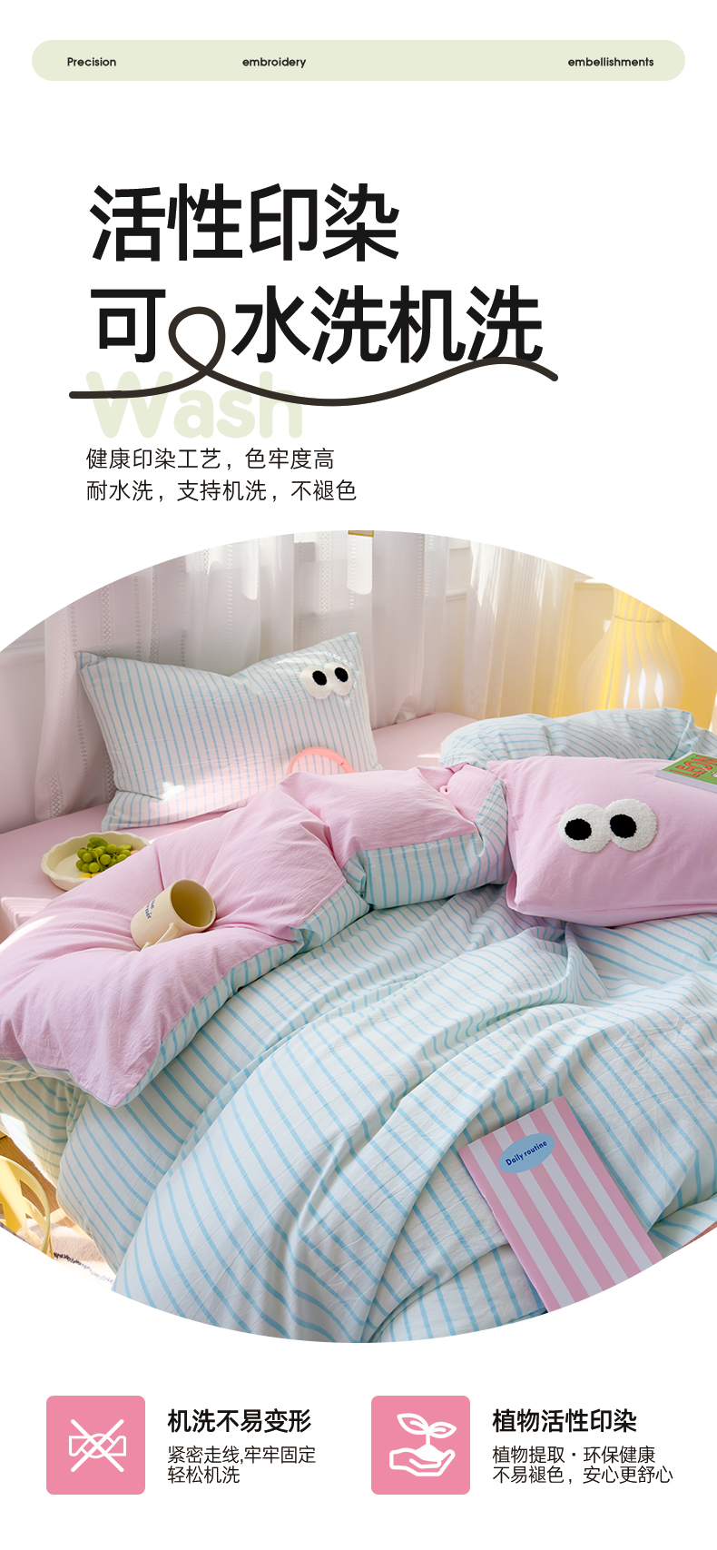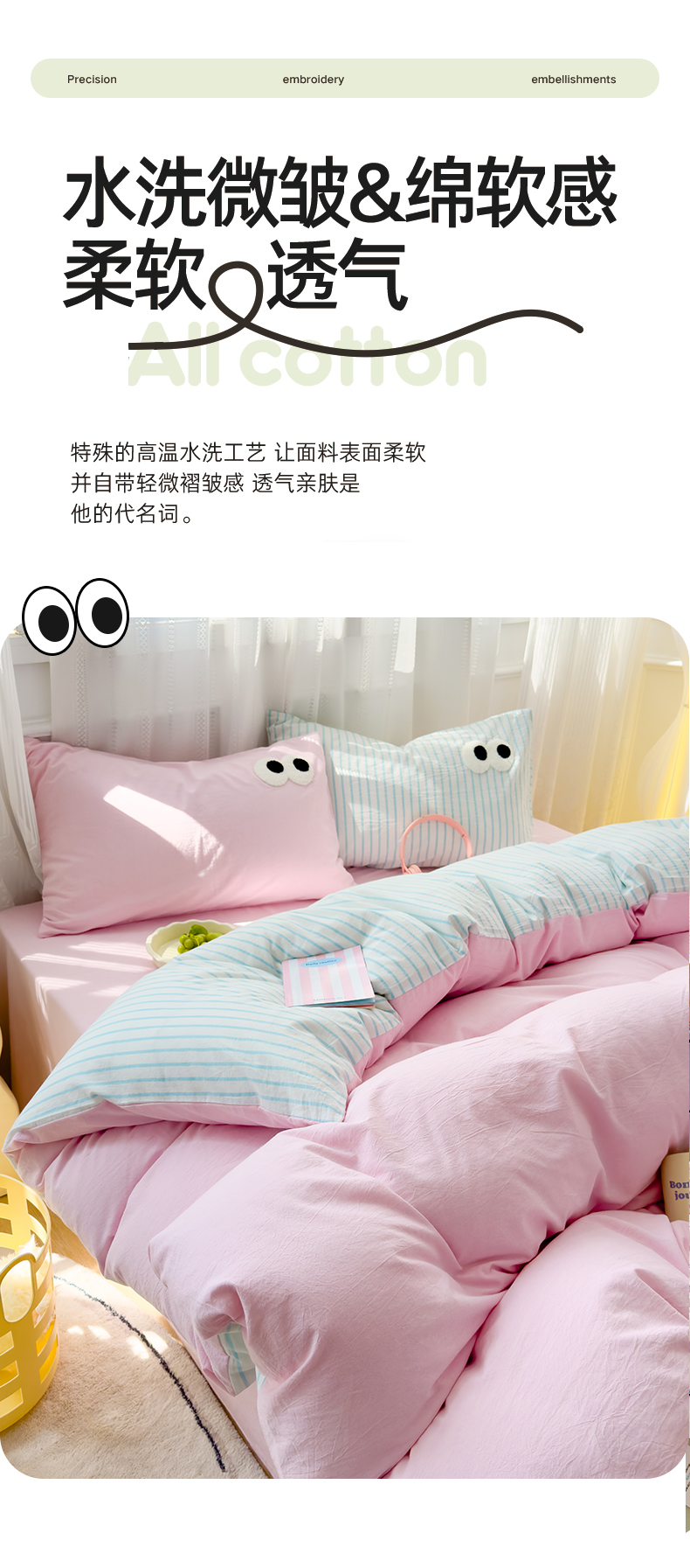 当前位置: 91家纺网 > 商品网购 > 床品套件 > 四件套 > 水洗棉四件套 > 颜选 2024新款亲肤舒适水洗棉四件套-大眼睛系列 绿条纹+玉