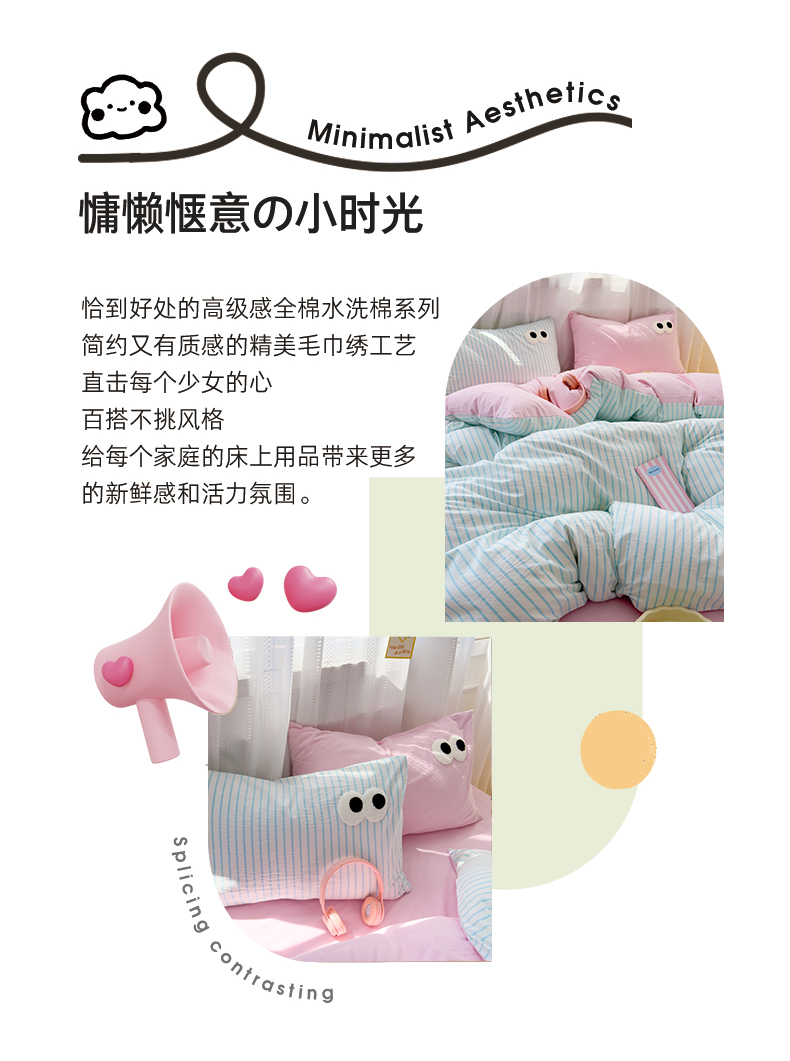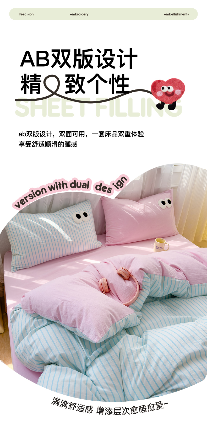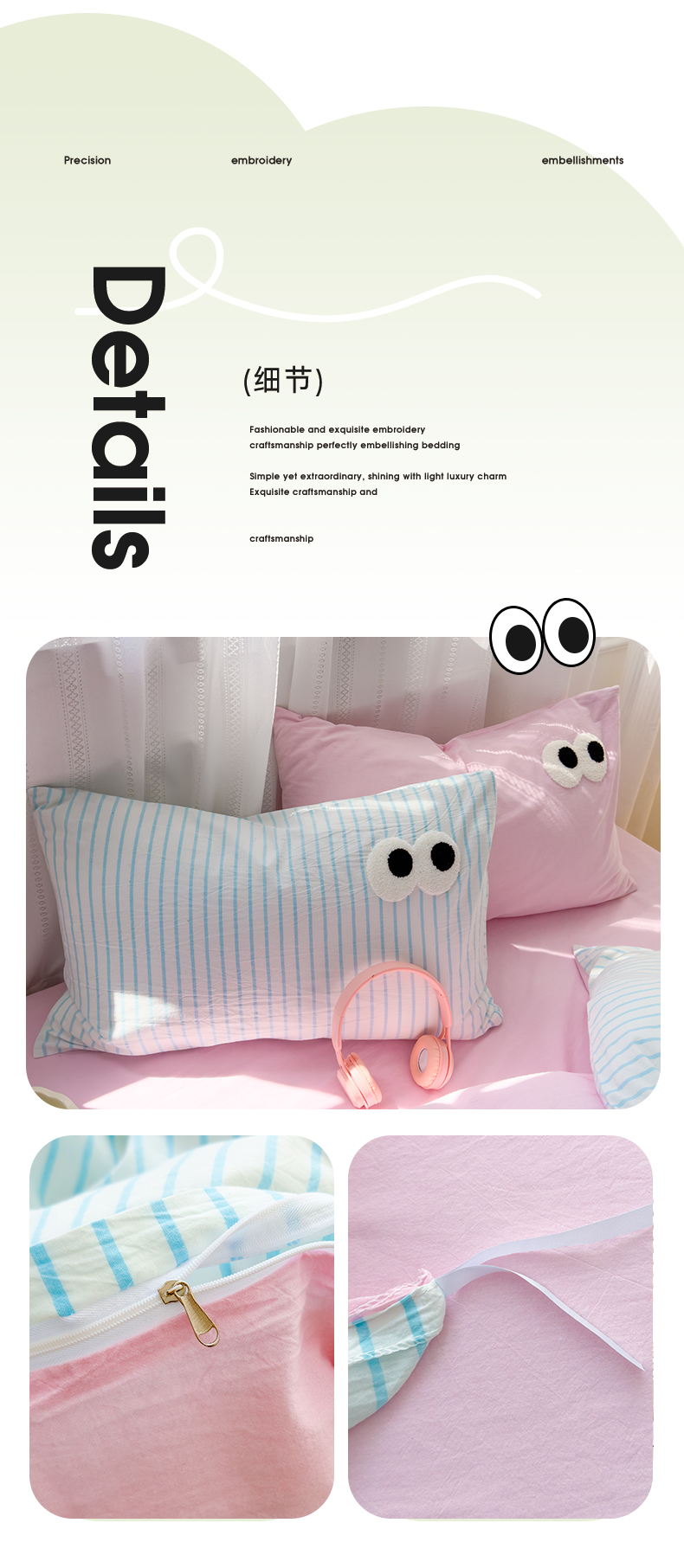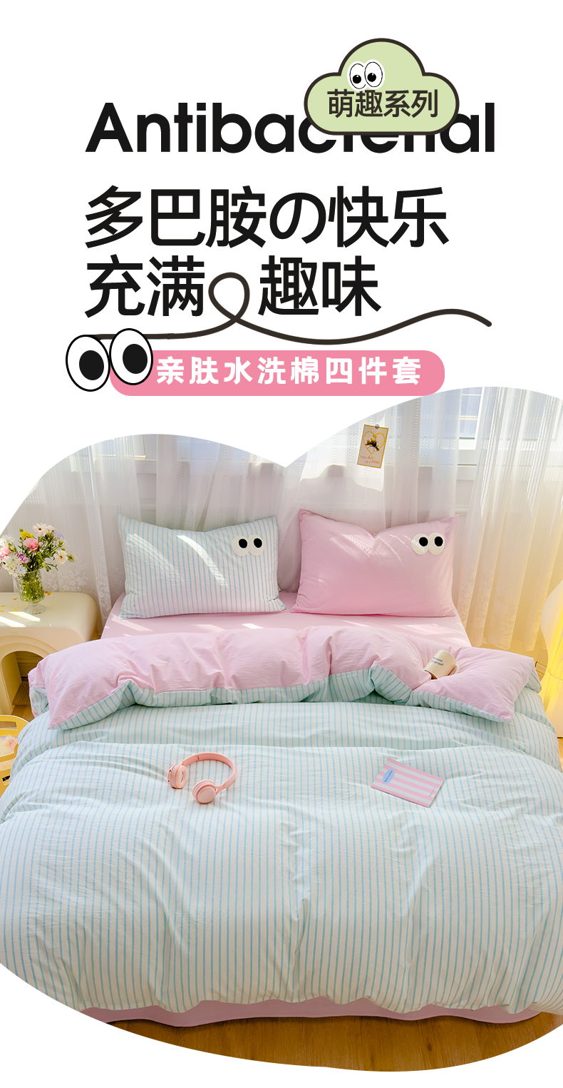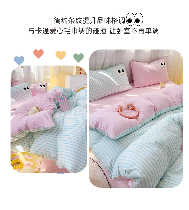 当前位置: 91家纺网 > 商品网购 > 床品套件 > 四件套 > 水洗棉四件套 > 颜选 2024新款亲肤舒适水洗棉四件套-大眼睛系列 绿条纹+玉