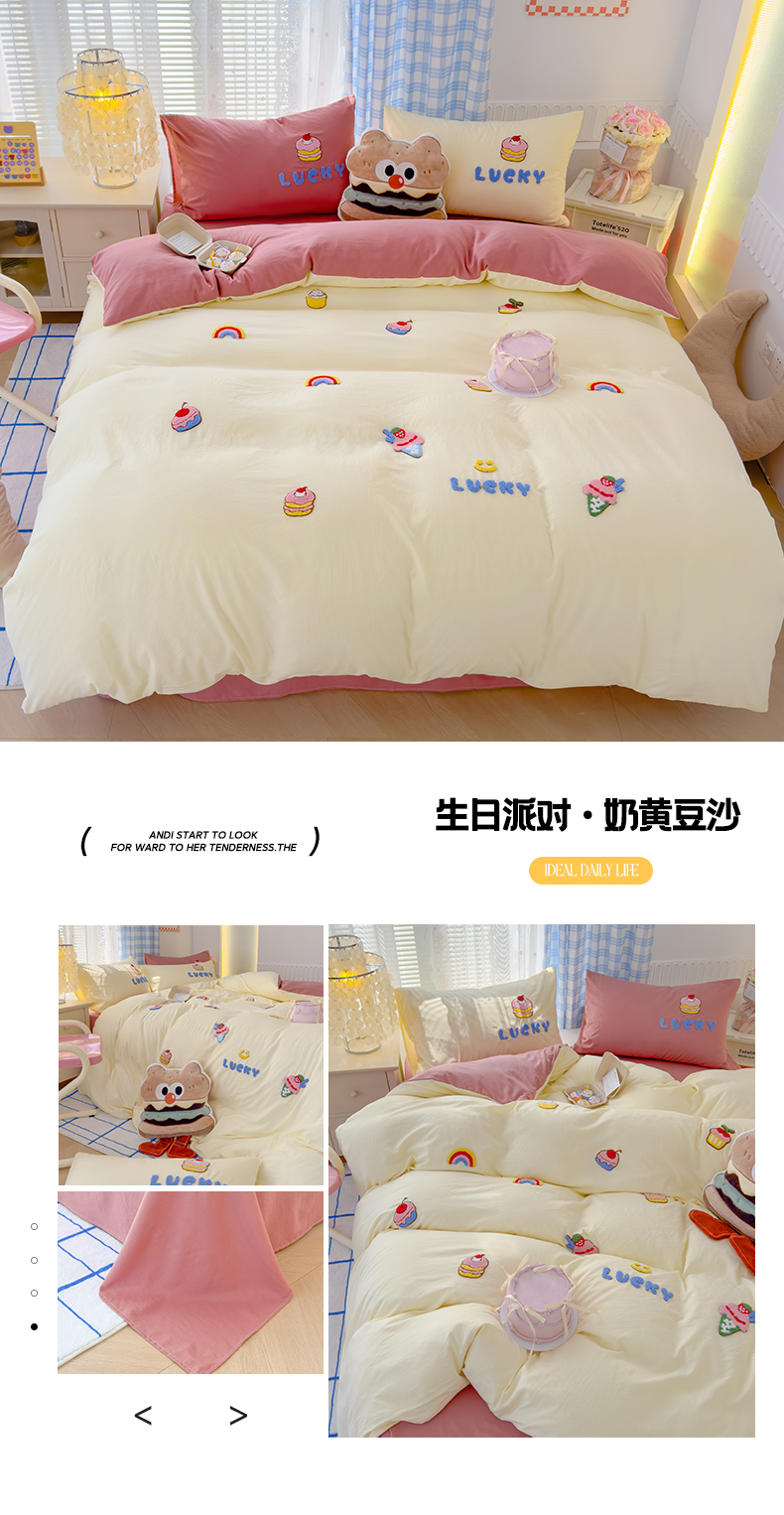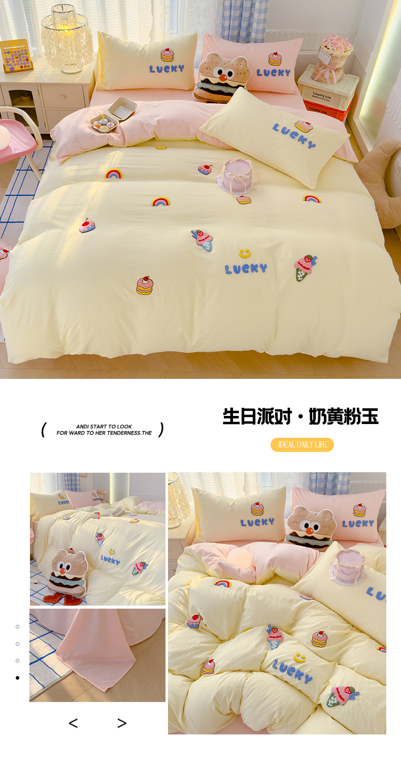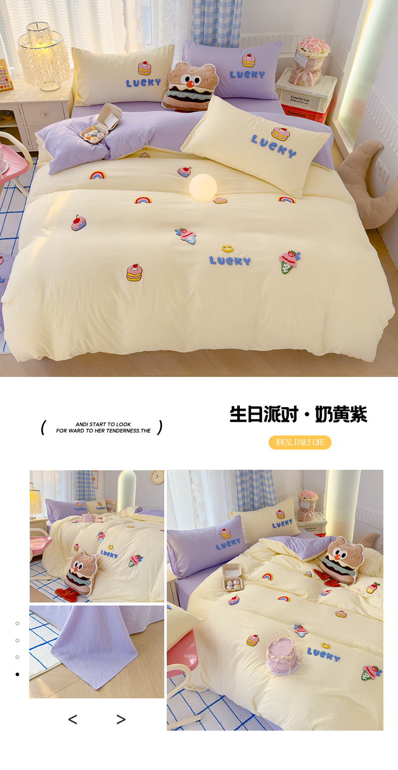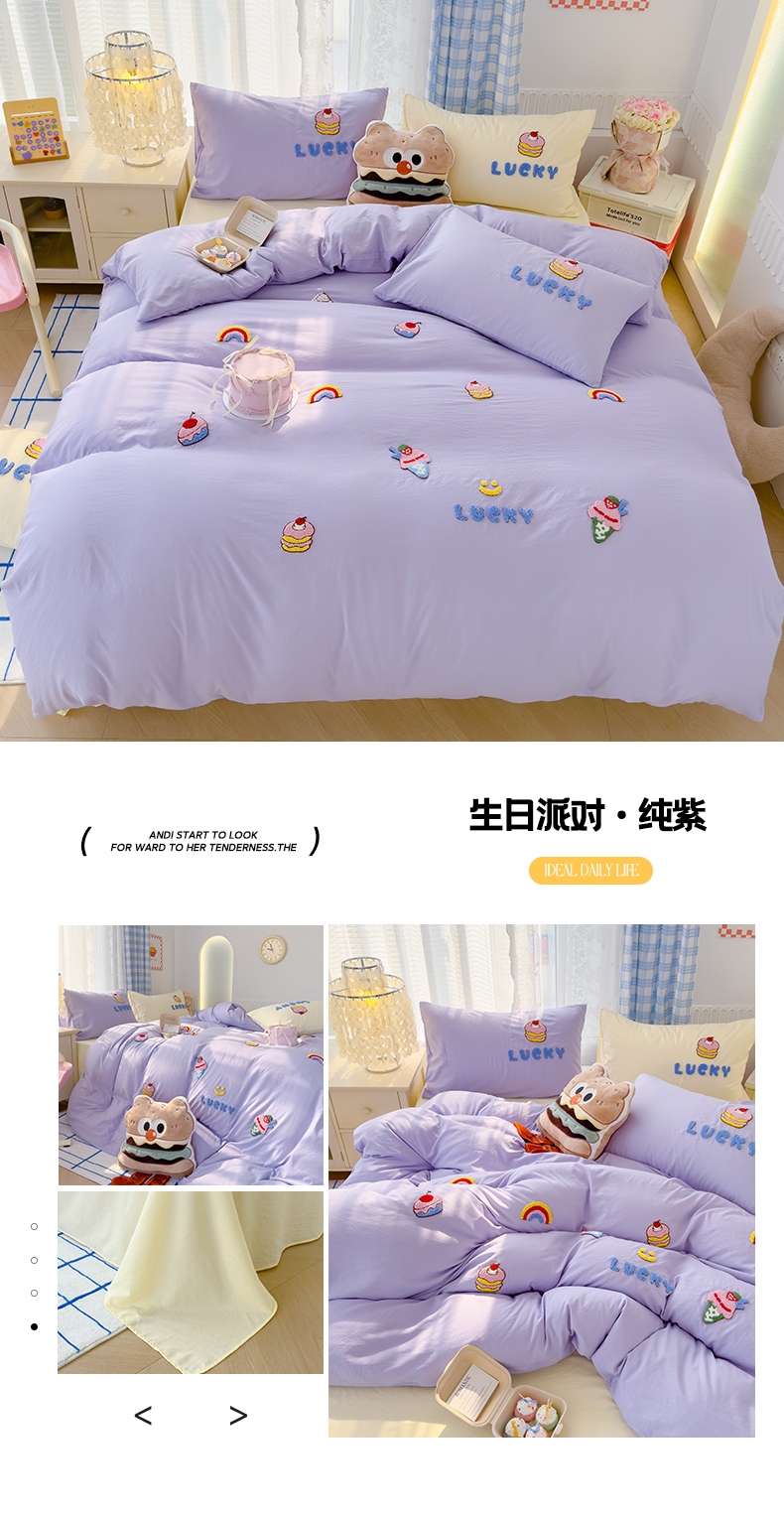 当前位置: 91家纺网 > 商品网购 > 床品套件 > 四件套 > 水洗棉四件套 > 颜选 2024新款小清新水洗棉立体毛巾绣四件套-生日派对 生日派对+奶黄紫
