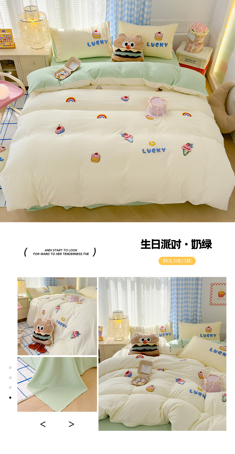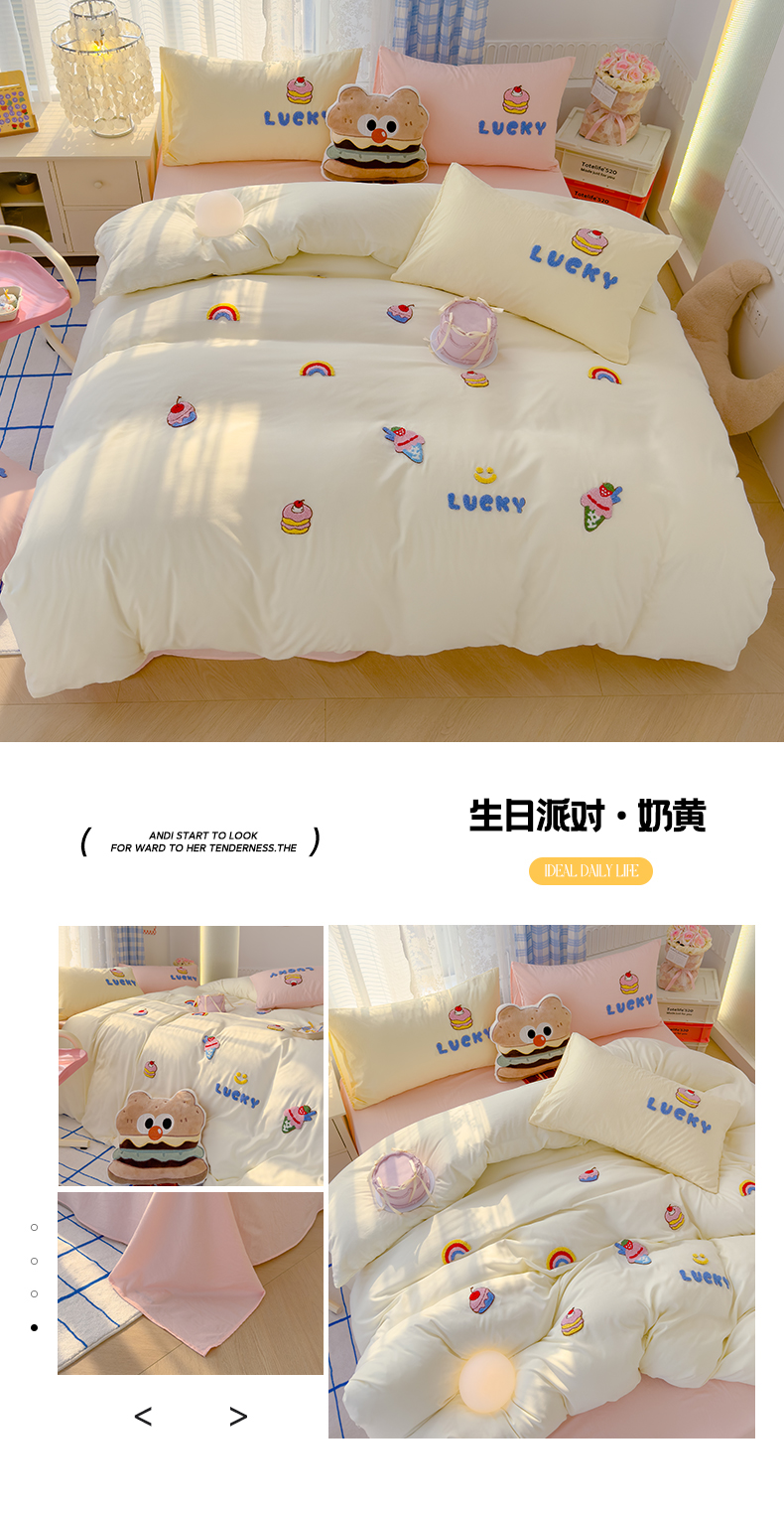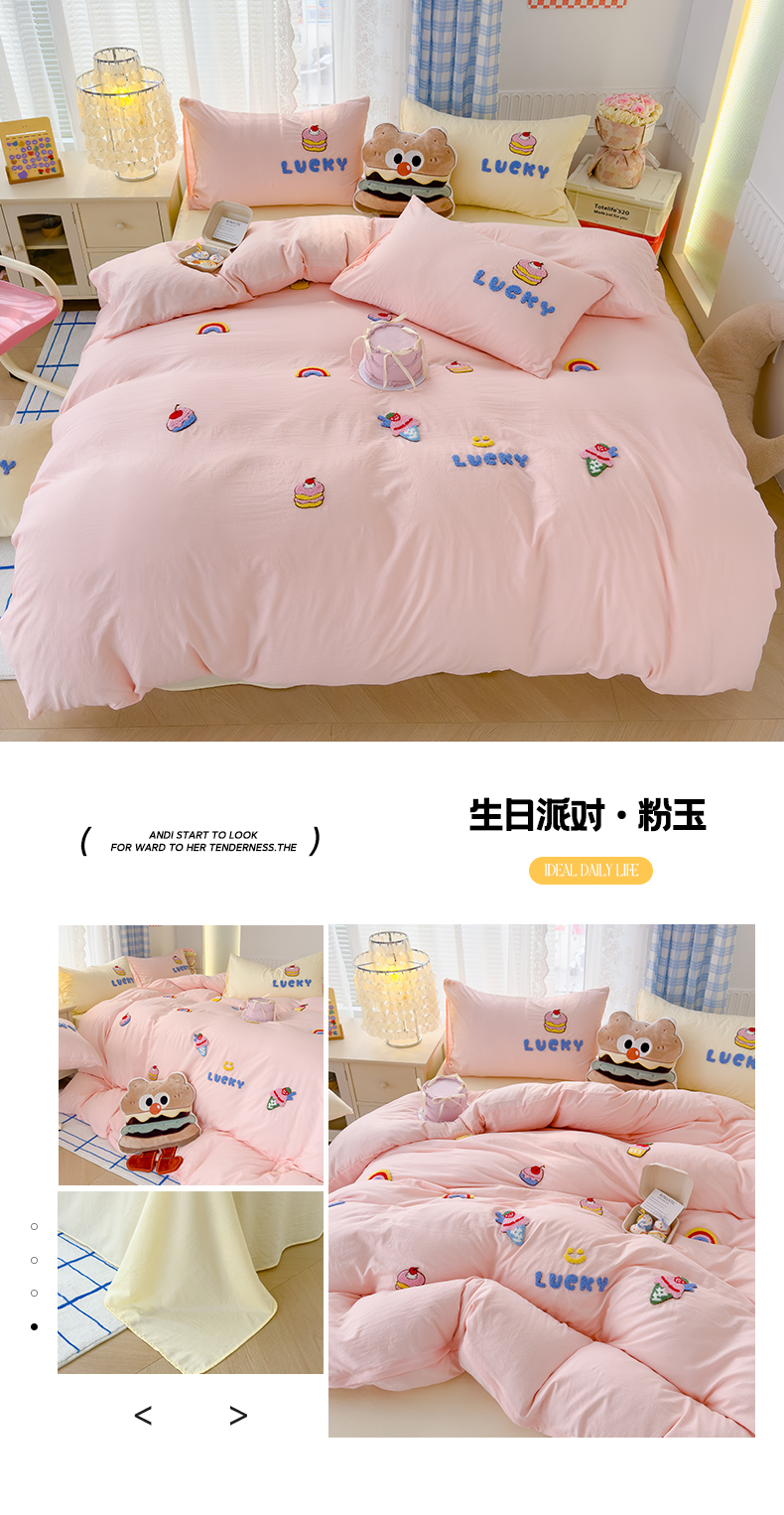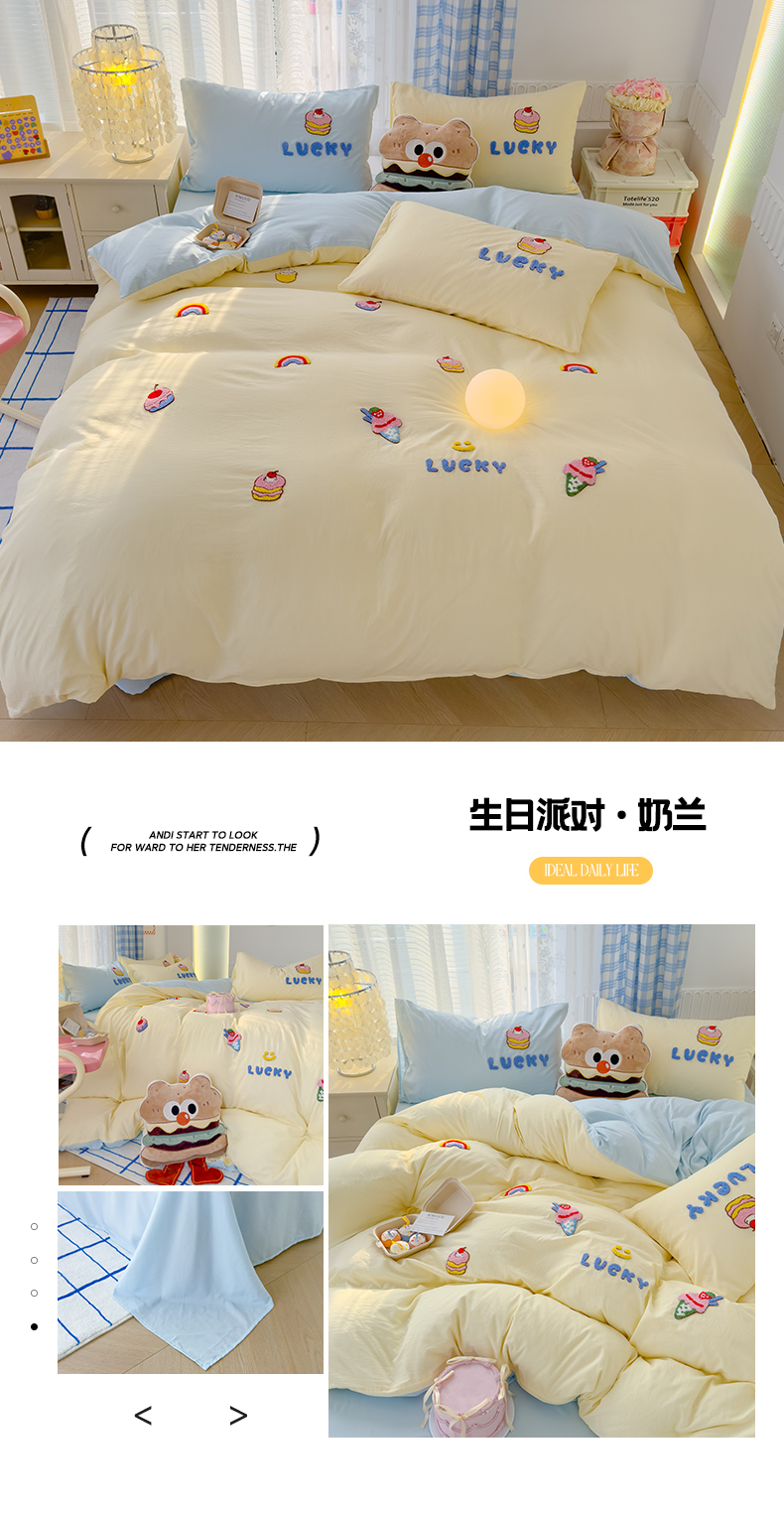 当前位置: 91家纺网 > 商品网购 > 床品套件 > 四件套 > 水洗棉四件套 > 颜选 2024新款小清新水洗棉立体毛巾绣四件套-生日派对 生日派对+奶黄紫