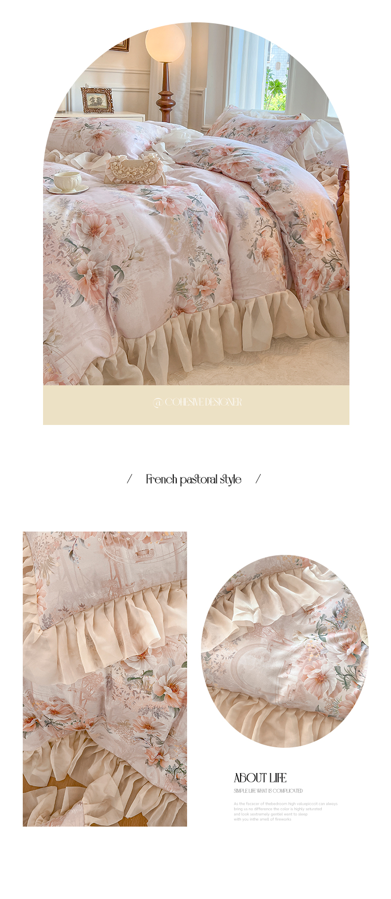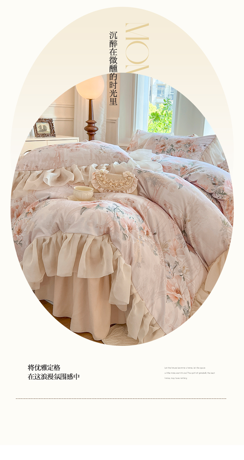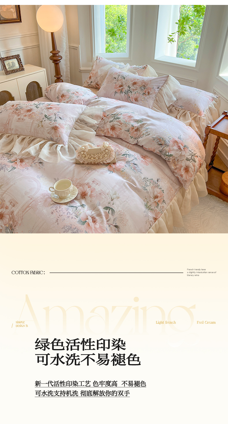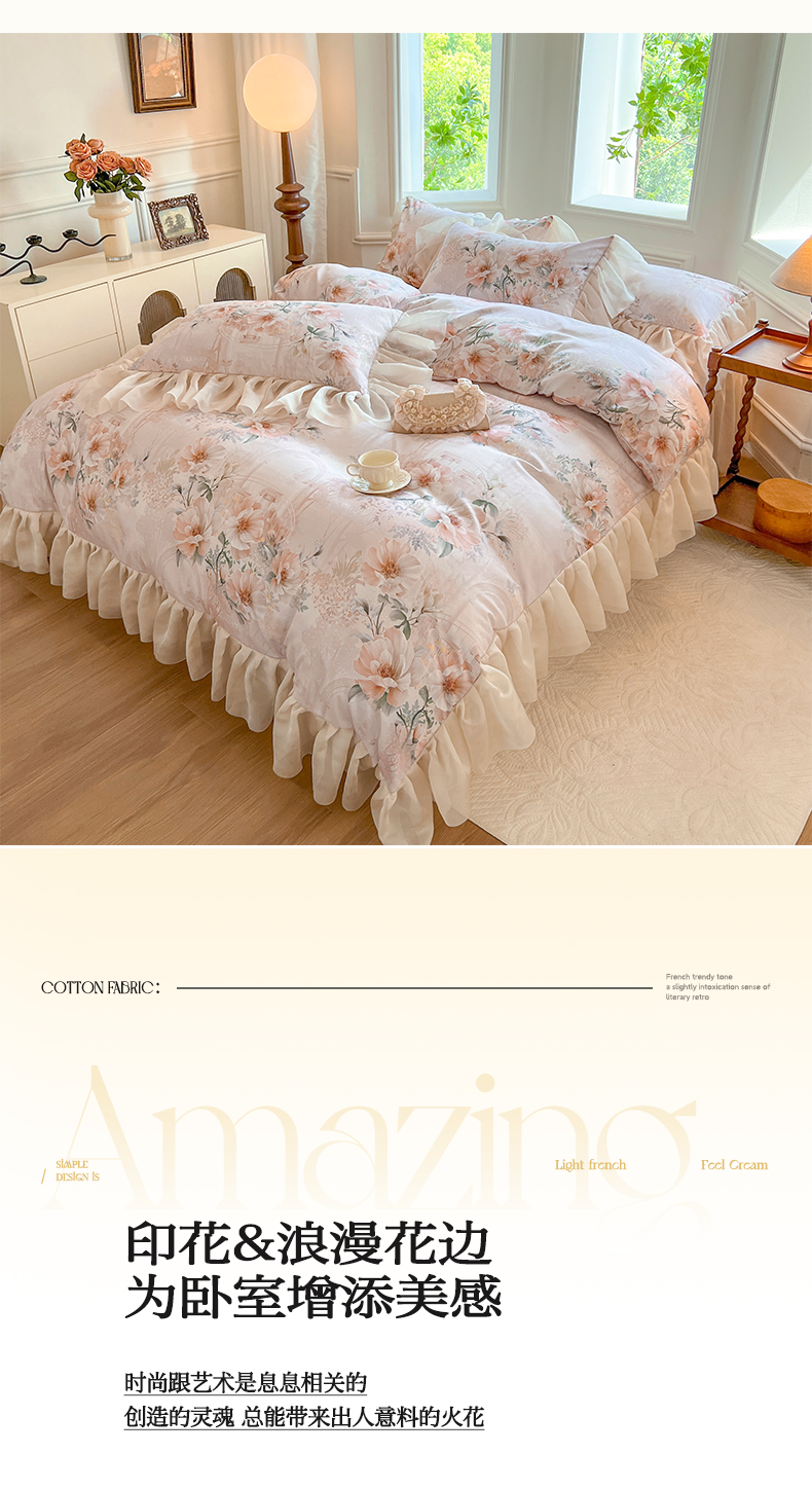 (总)网红馆(ck家纺) 2025新款全棉磨毛印花床裙款复古法式优雅四件套,花舞漫天-粉,玫瑰趣事-粉,玫瑰趣事-灰,梦语-桔