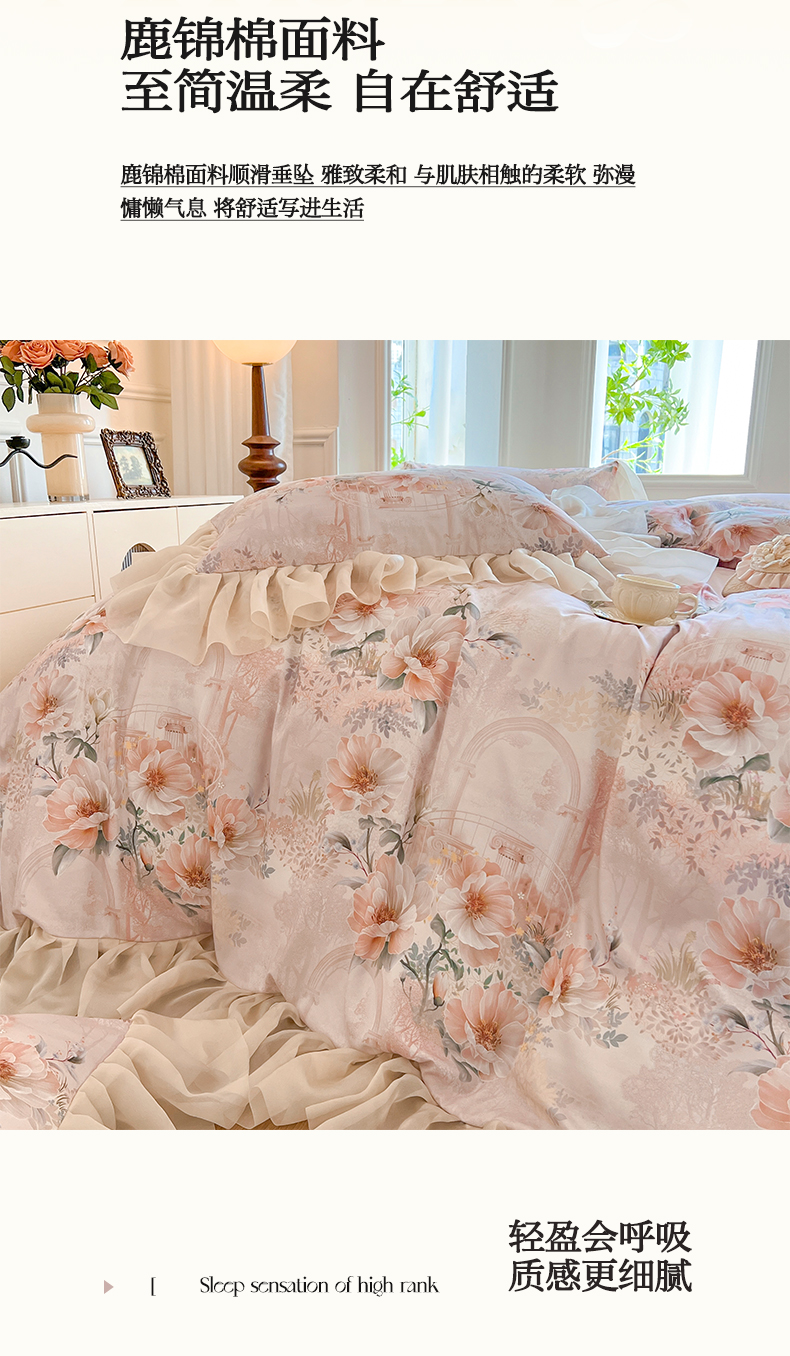 商品名称:网红馆(ck家纺)2025新款鹿锦棉印花床裙四件套 闭月羞花-玉