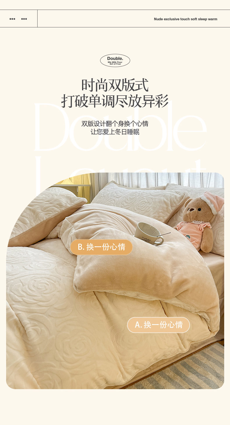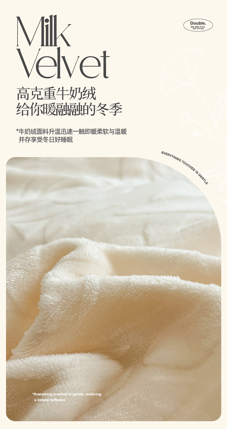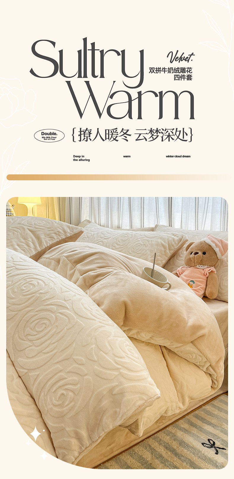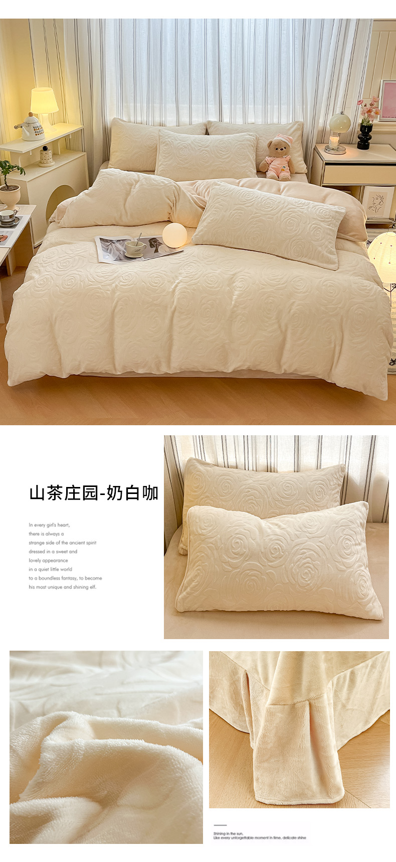 商品名称:绘萱家居 2025新款高克重雕花雕印纯色牛奶绒四件套双拼法莱绒珊瑚绒 山茶庄园-奶白咖
