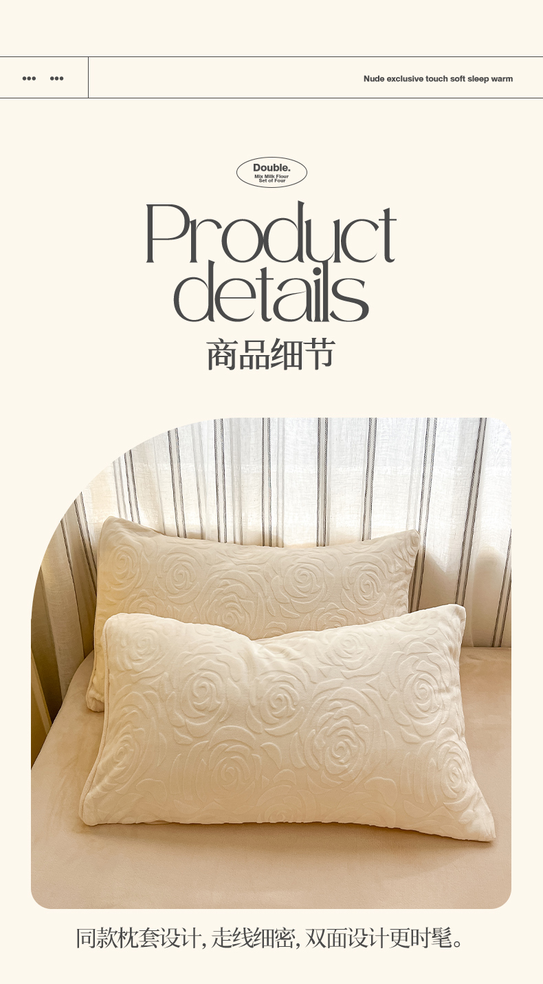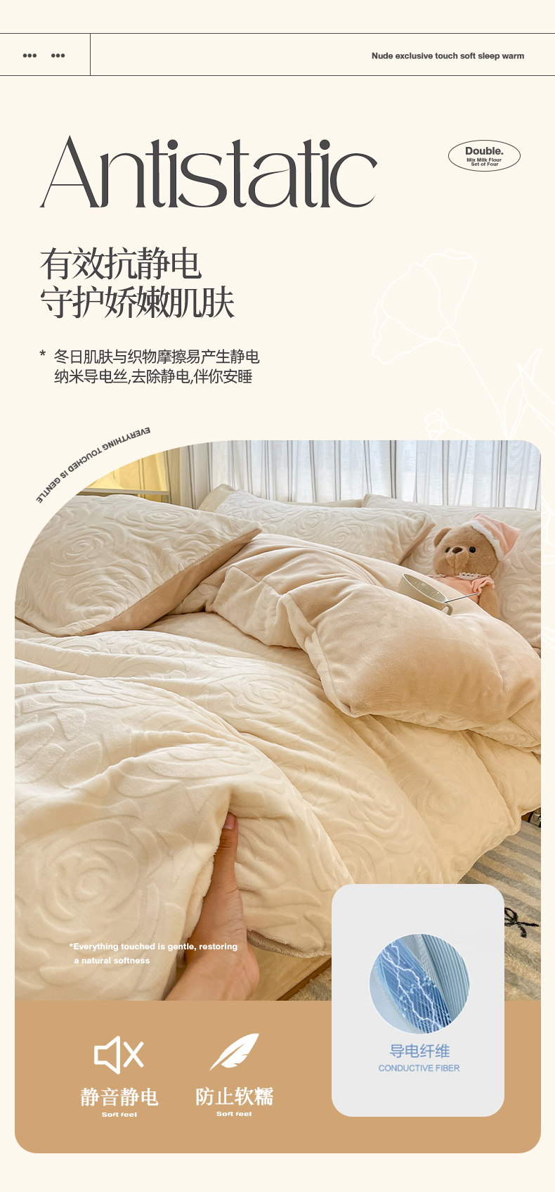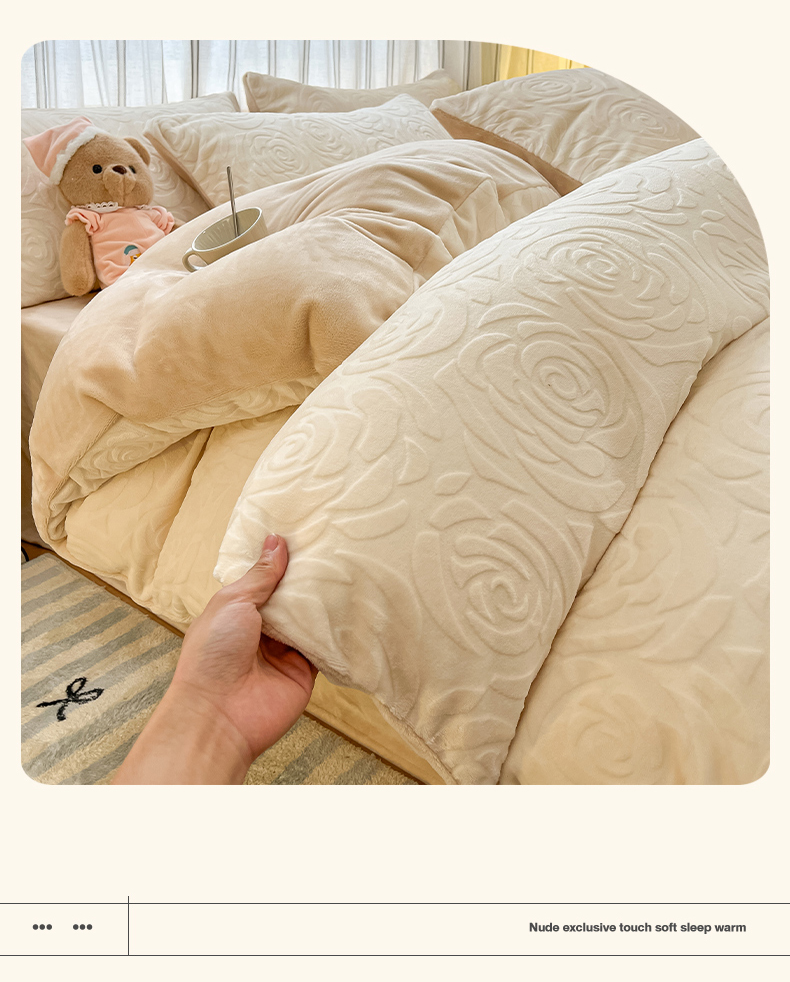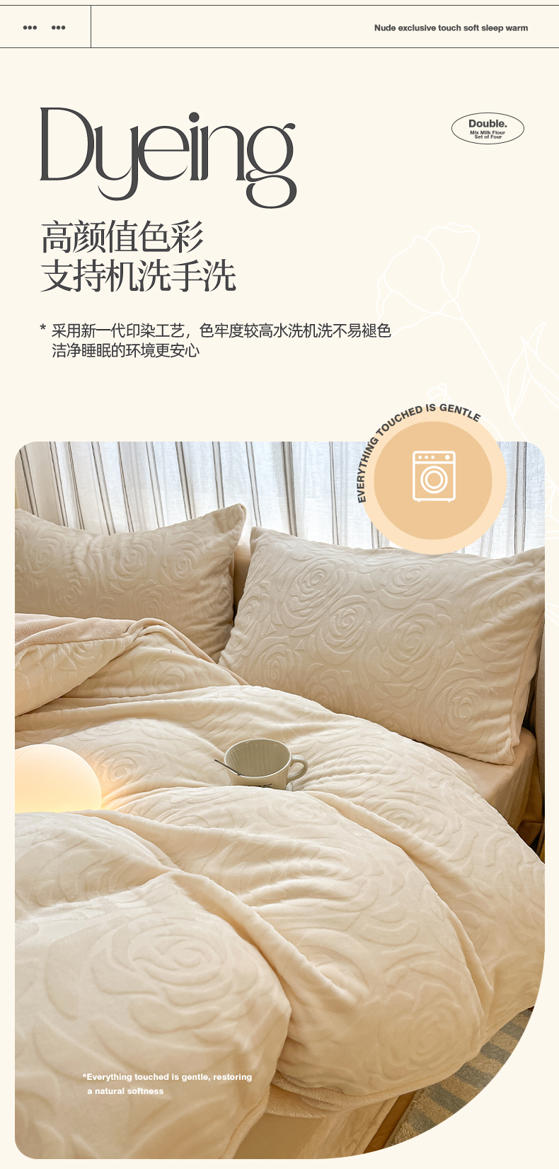 商品名称:绘萱家居 2025新款高克重雕花雕印纯色牛奶绒四件套双拼法莱绒珊瑚绒 山茶庄园-奶白咖
