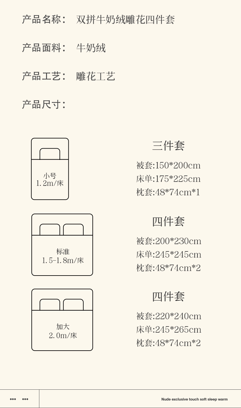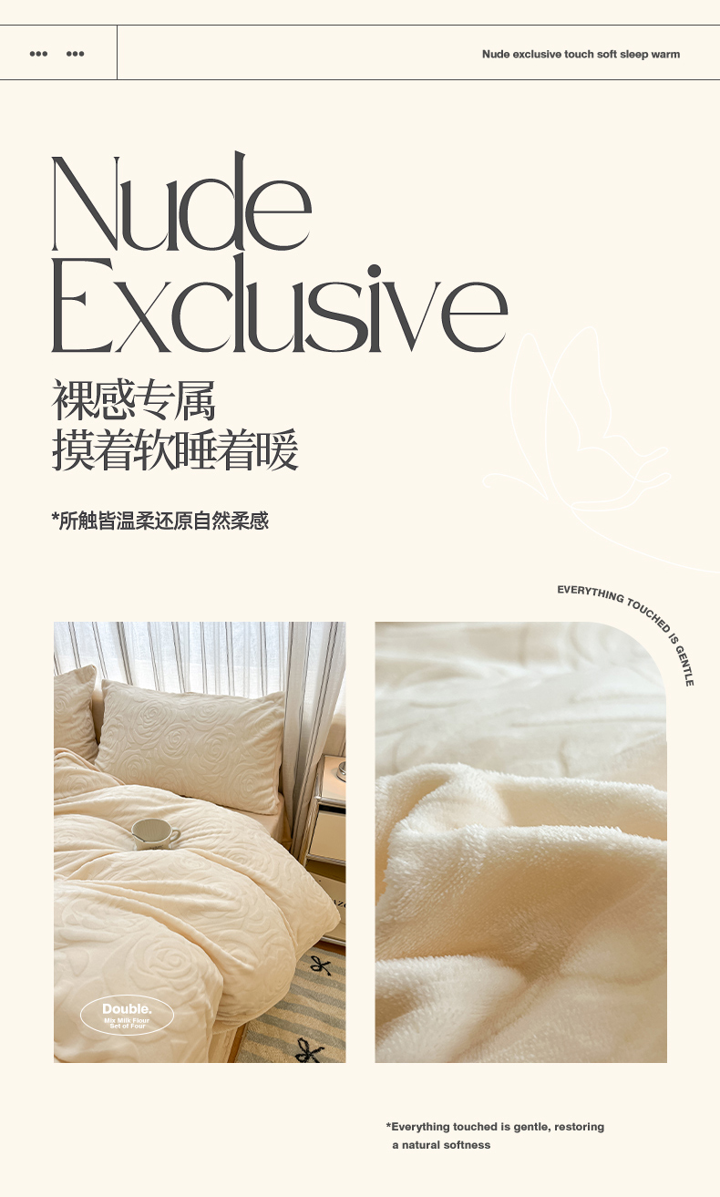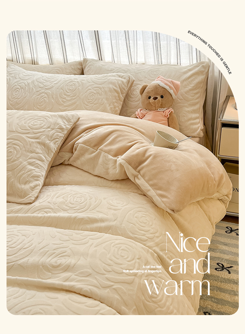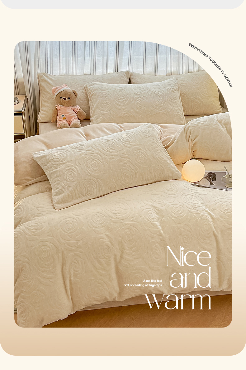 商品名称:绘萱家居 2025新款高克重雕花雕印纯色牛奶绒四件套双拼法莱绒珊瑚绒 山茶庄园-奶白咖