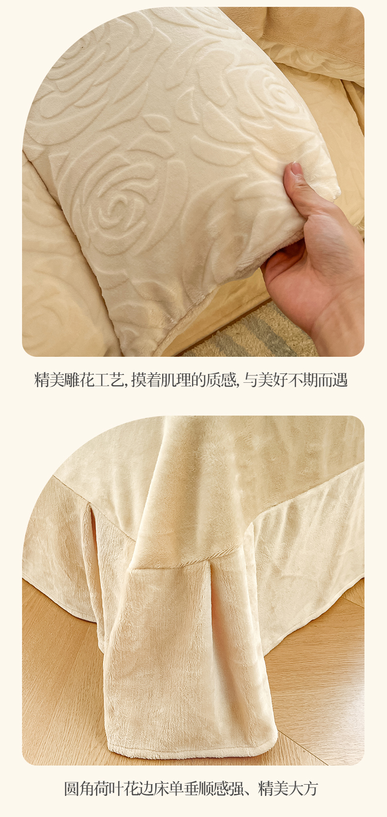绘萱家居 2025新款高克重雕花雕印纯色牛奶绒四件套双拼法莱绒珊瑚绒 山茶庄园-奶白咖