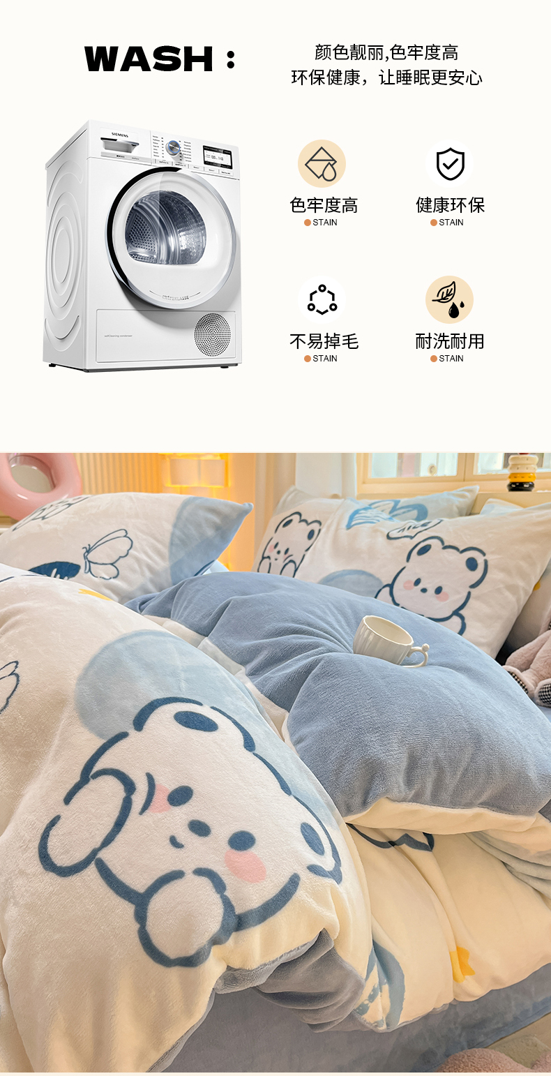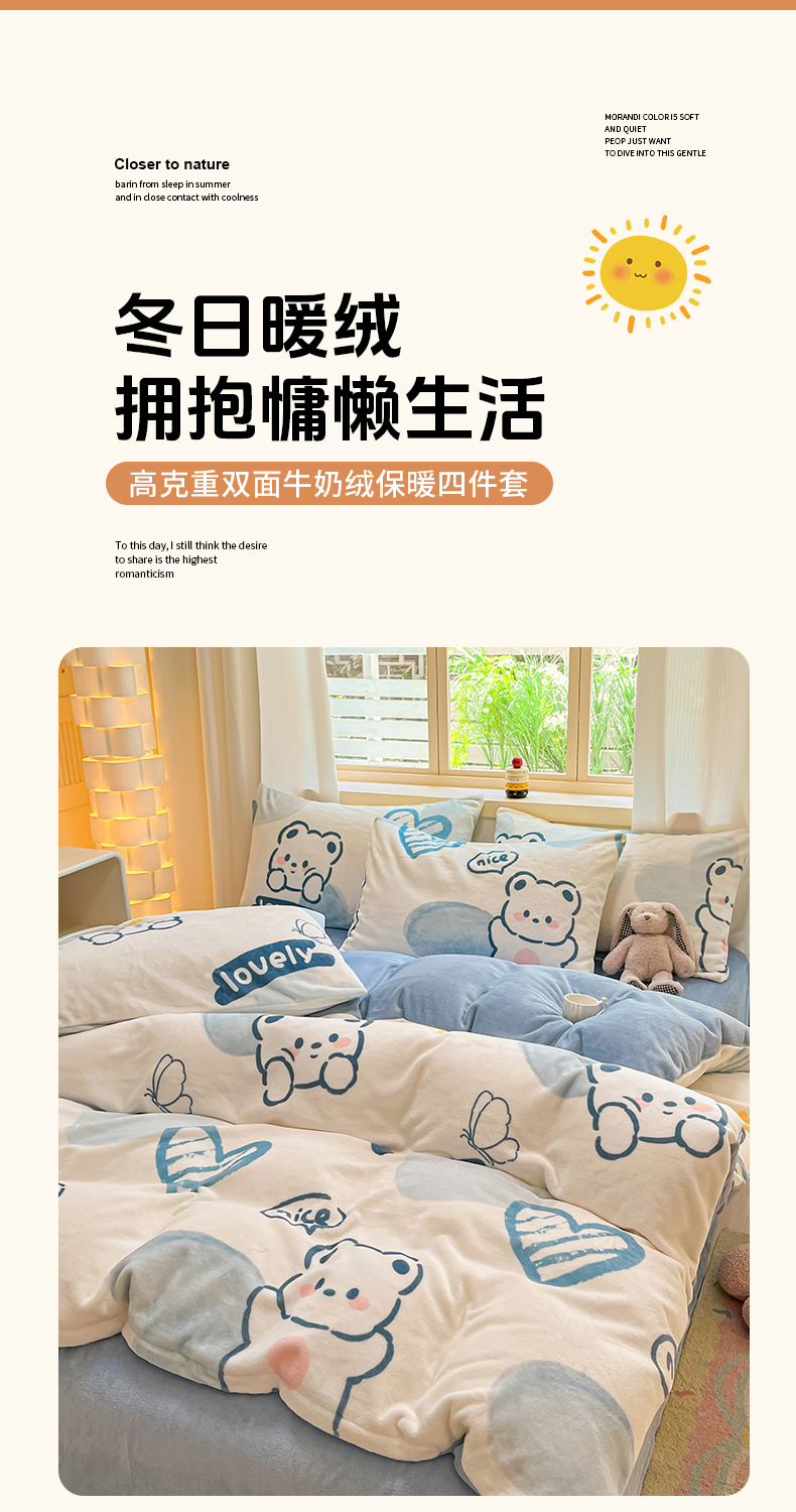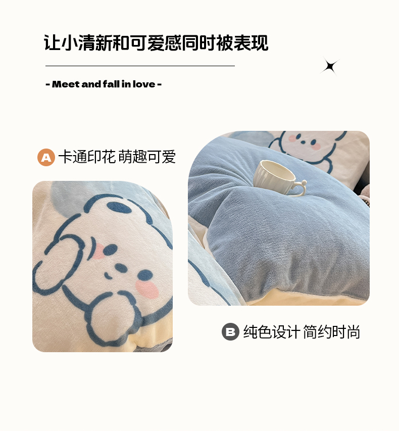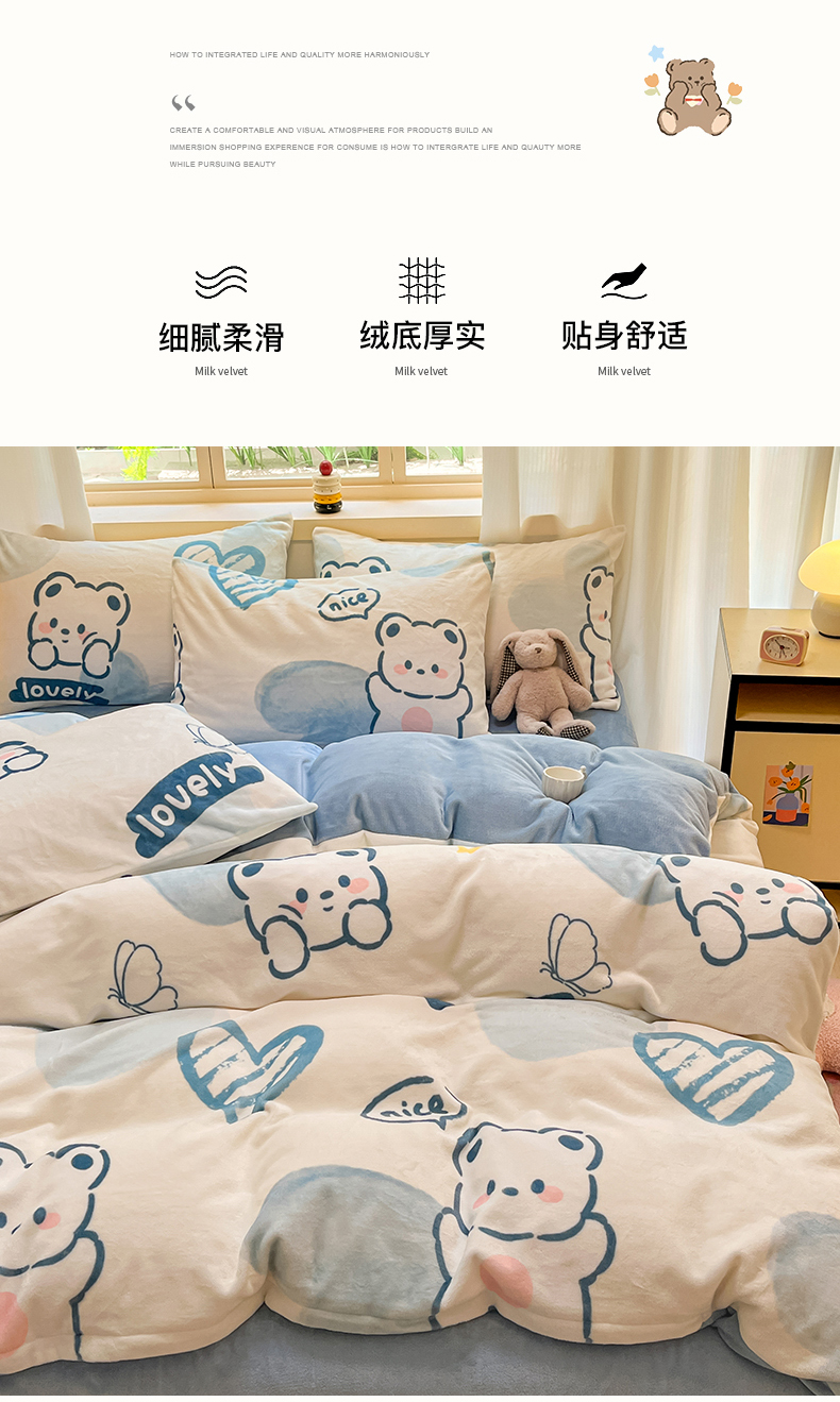 商品名称:铭宣家居 2024新款7斤小清新高克重牛奶绒印花四件套床单床笠款 爱心熊-蓝