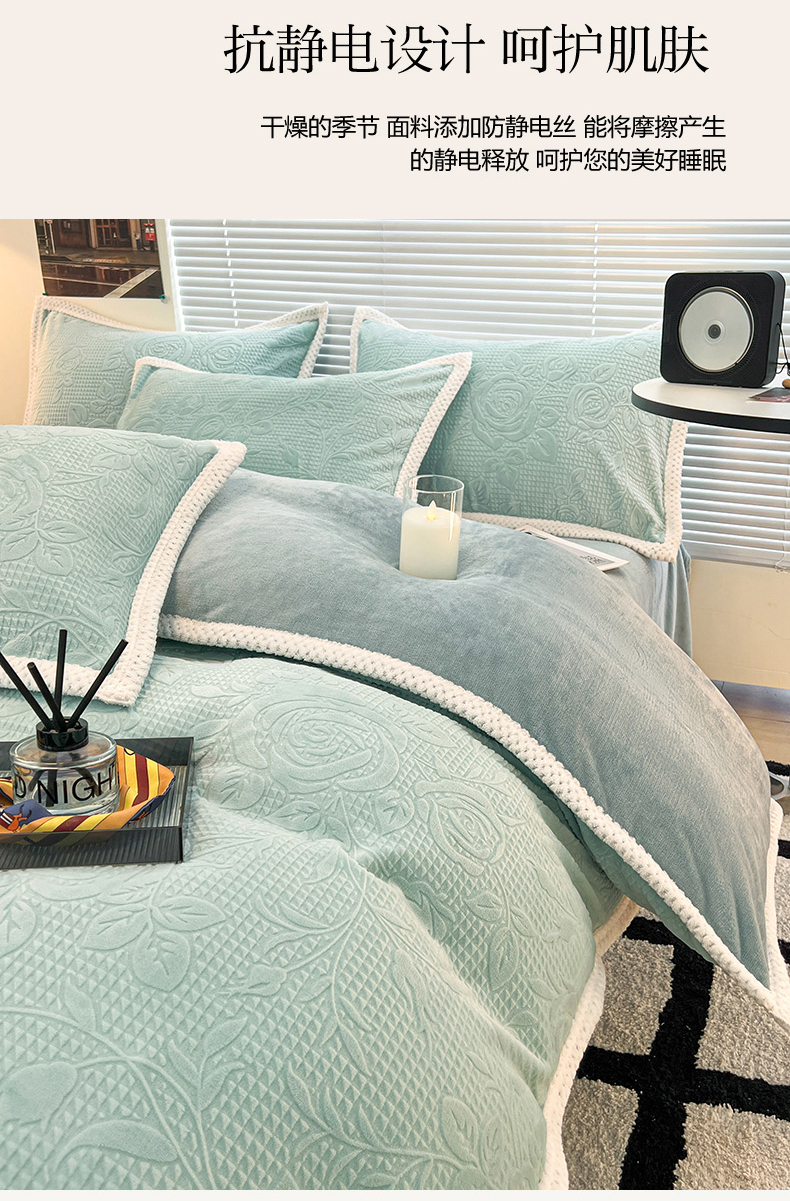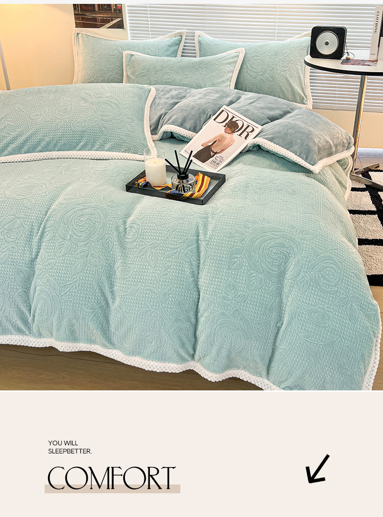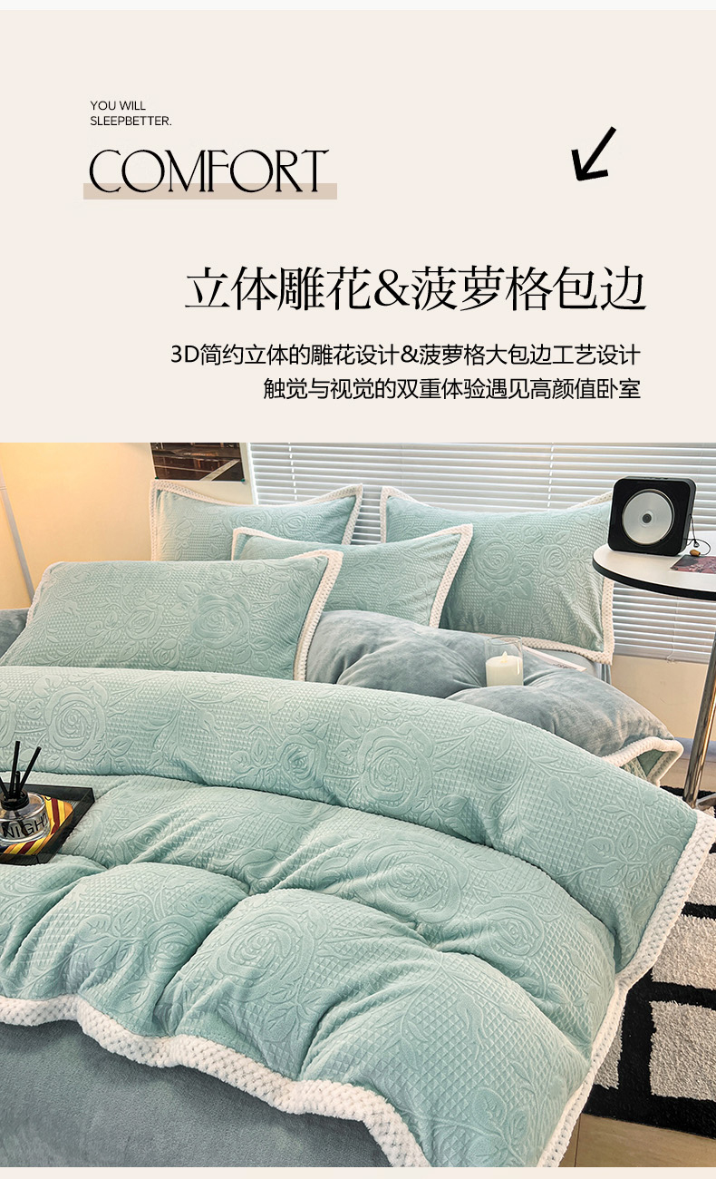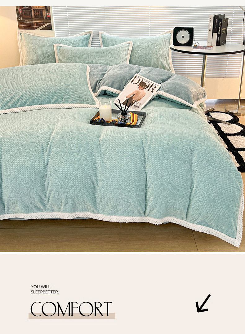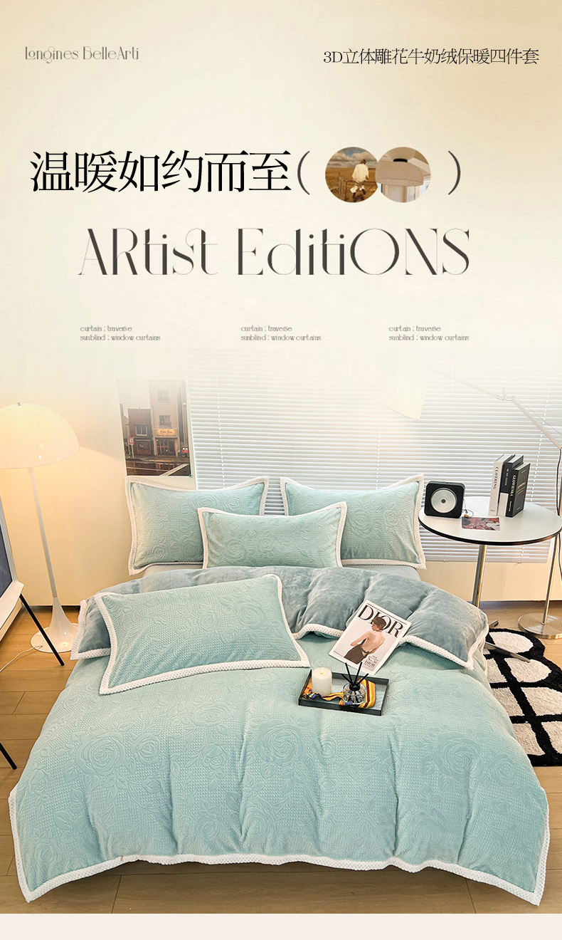当前位置: 91家纺网 > 商品网购 > 床品套件 > 四件套 > 牛奶绒四件套 > 2024新款A类高克重3D立体雕花牛奶绒保暖系列套件单品-四件套 玫瑰恋情蓝