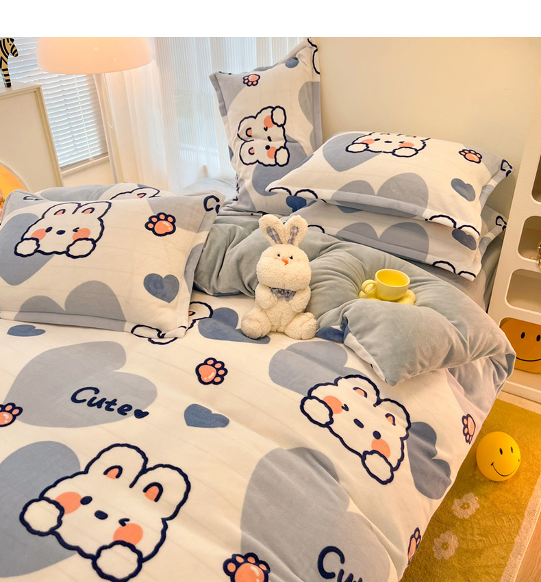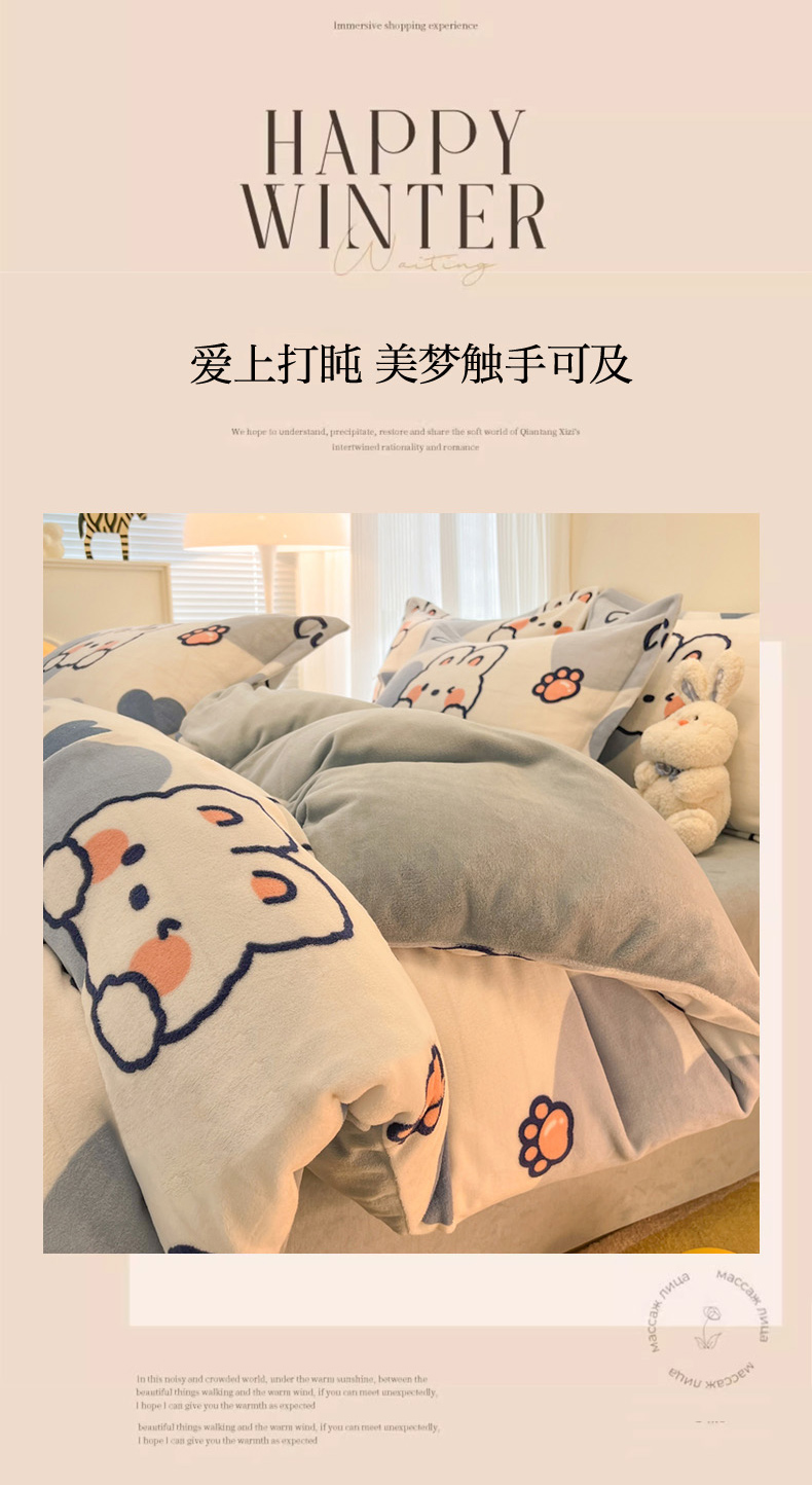 (总)倾慕家纺 2025新款卡通毛巾绣加厚保暖牛奶绒四件套,爱心女孩,咖啡小狗,猫咪熊兔,迷你小车,圣诞树熊,音乐企鹅
