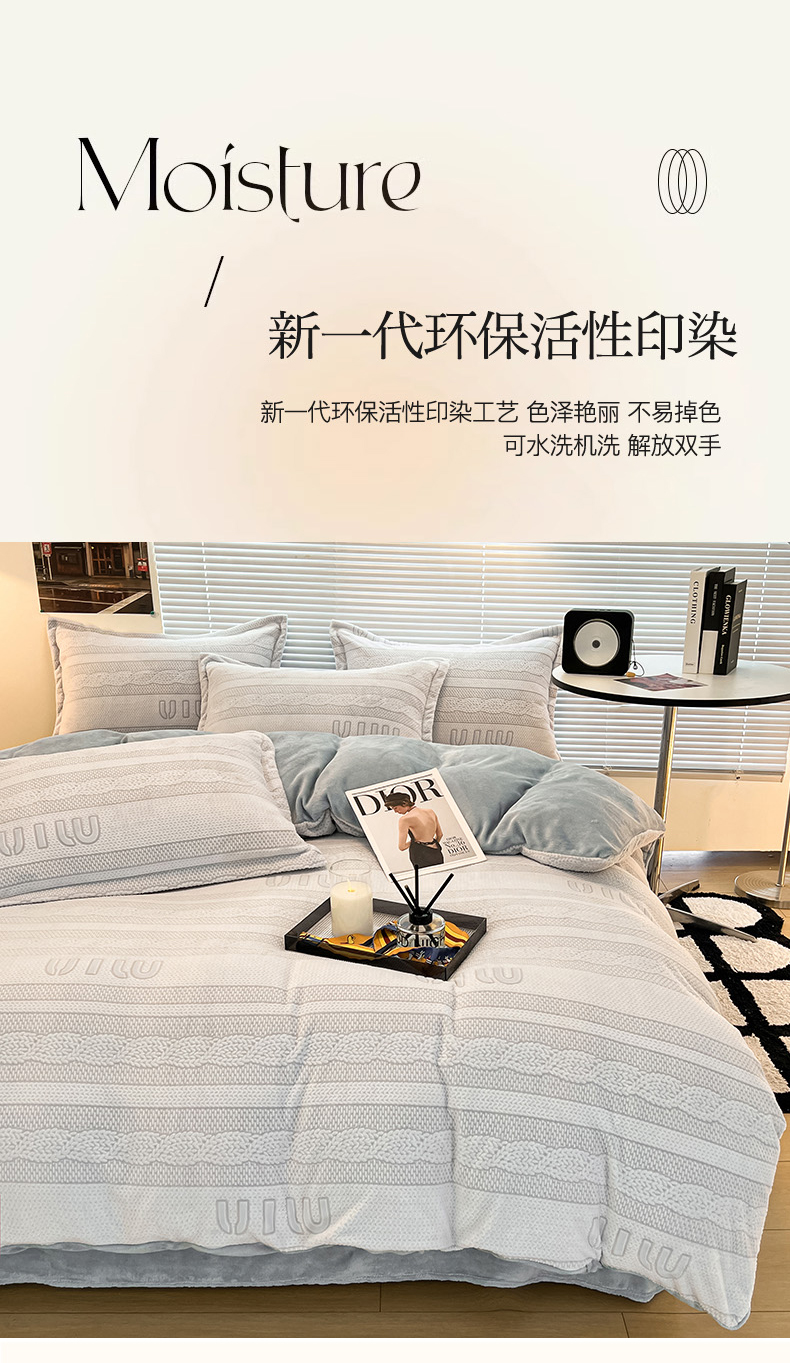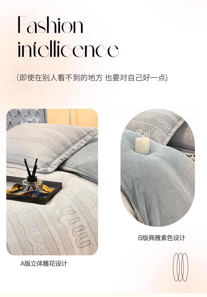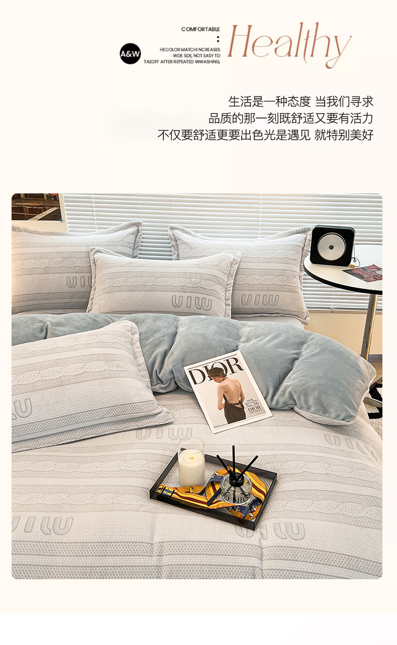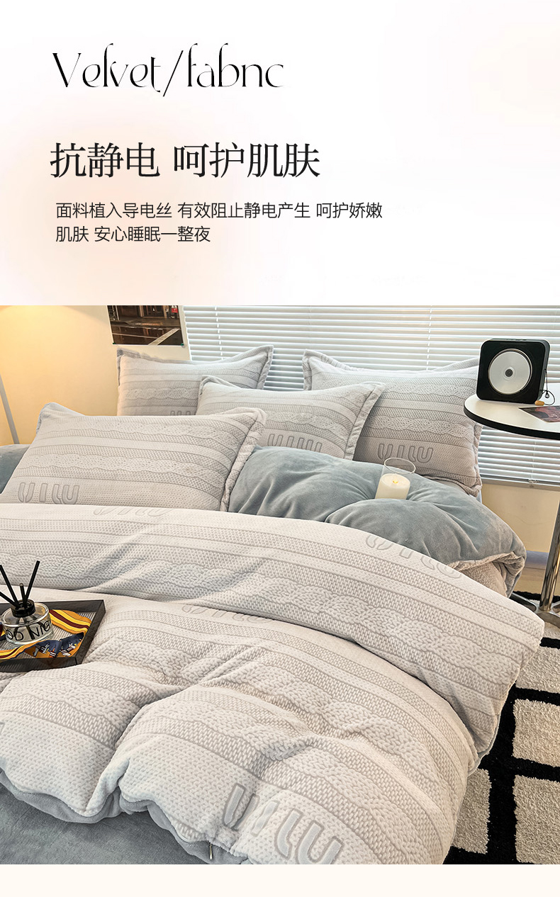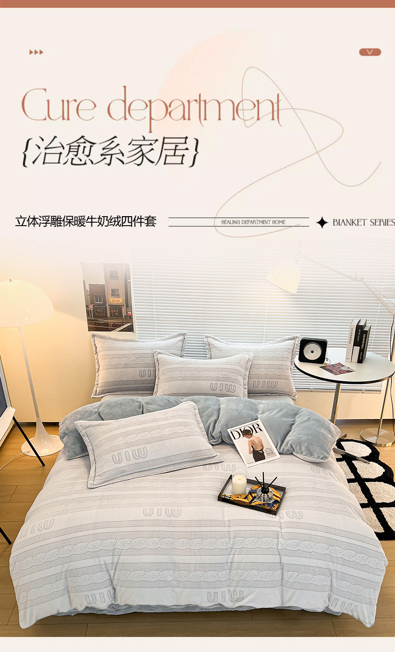 当前位置: 91家纺网 > 商品网购 > 床品套件 > 四件套 > 牛奶绒四件套 > 2024新款A类高克重立体浮雕牛奶绒加厚保暖简约风系列四件套 MIUMIU蓝