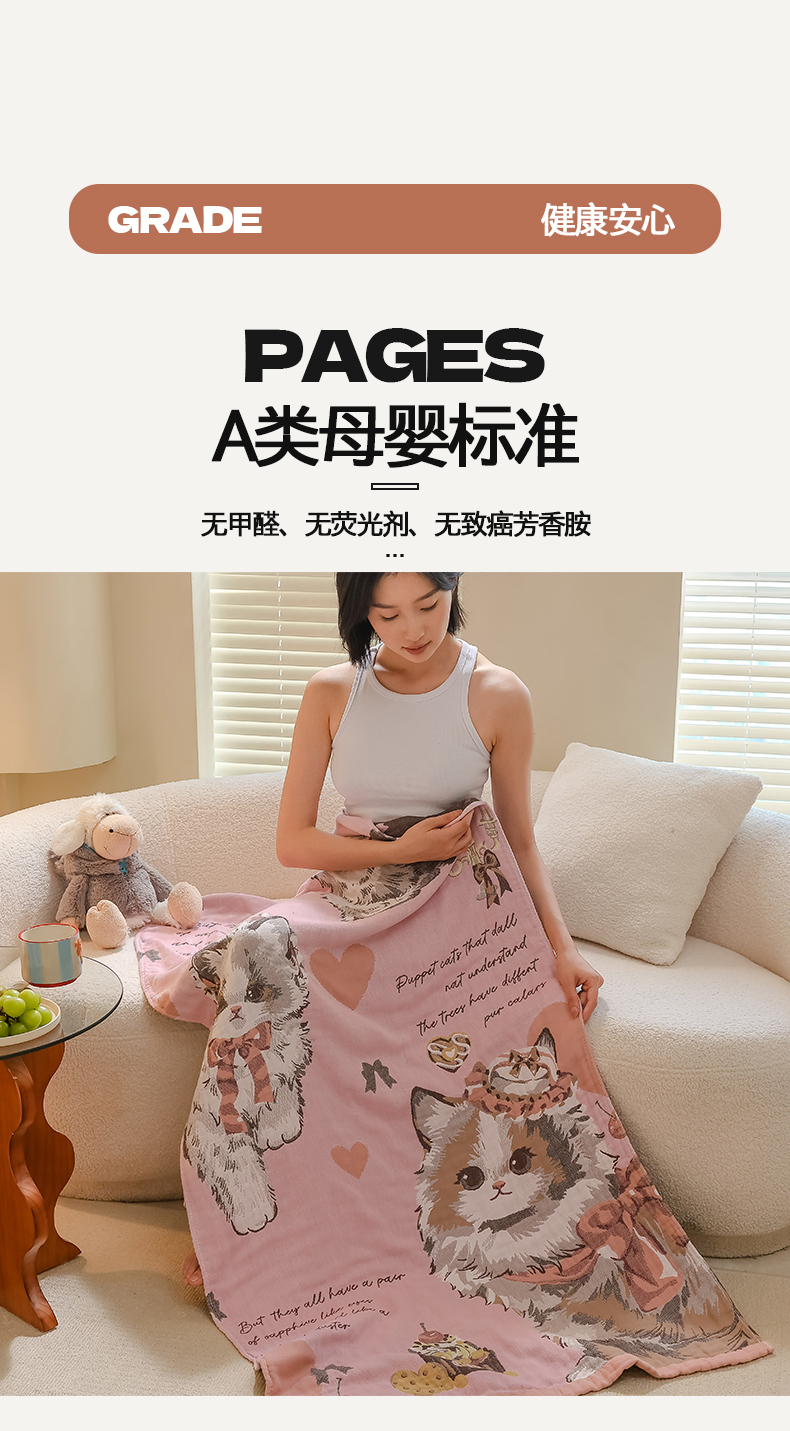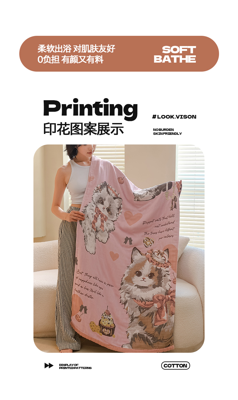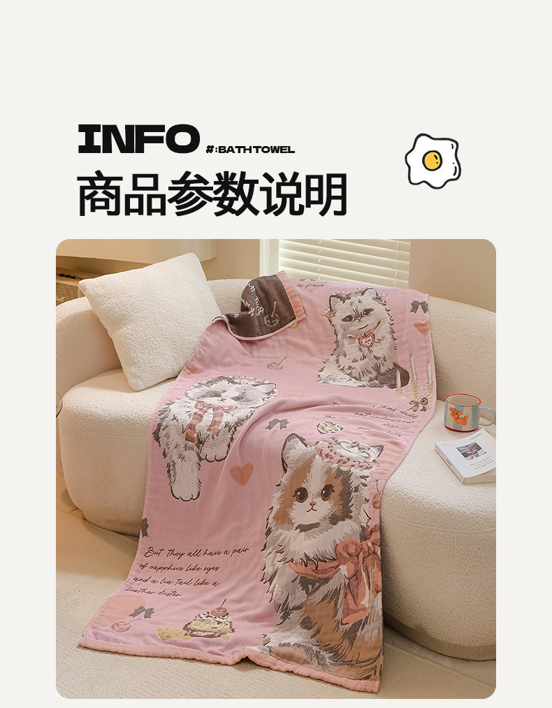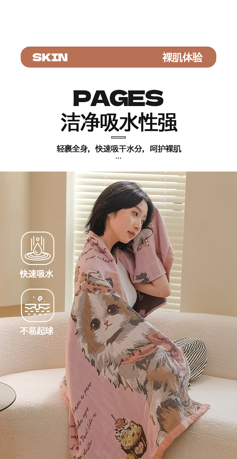当前位置: 91家纺网 > 商品网购 > 居家日用 > 毛巾/浴巾/浴袍 > 浴巾 > 雯雨家纺 2024新款四层全棉纱布浴巾加大毛巾80*160cm 公主猫