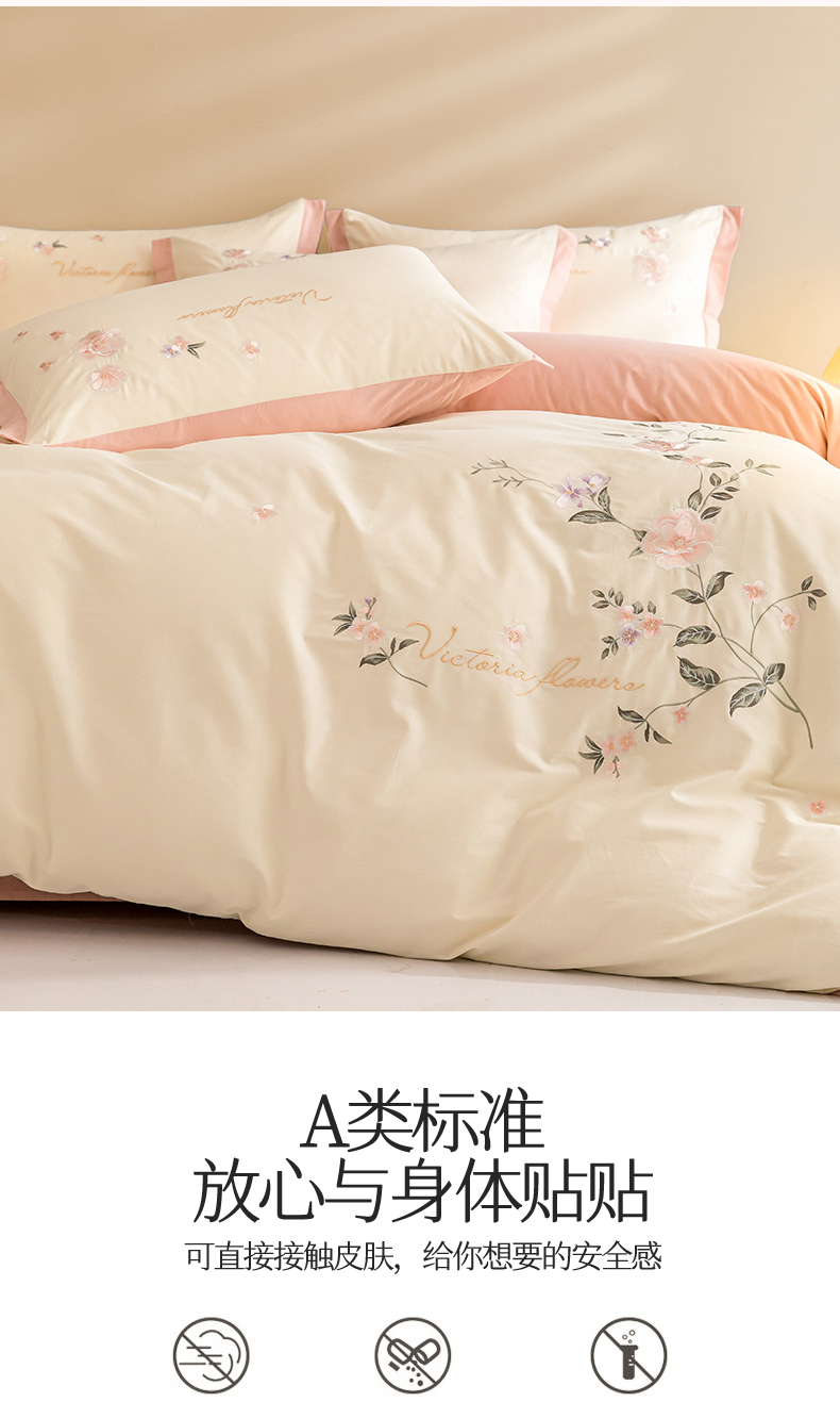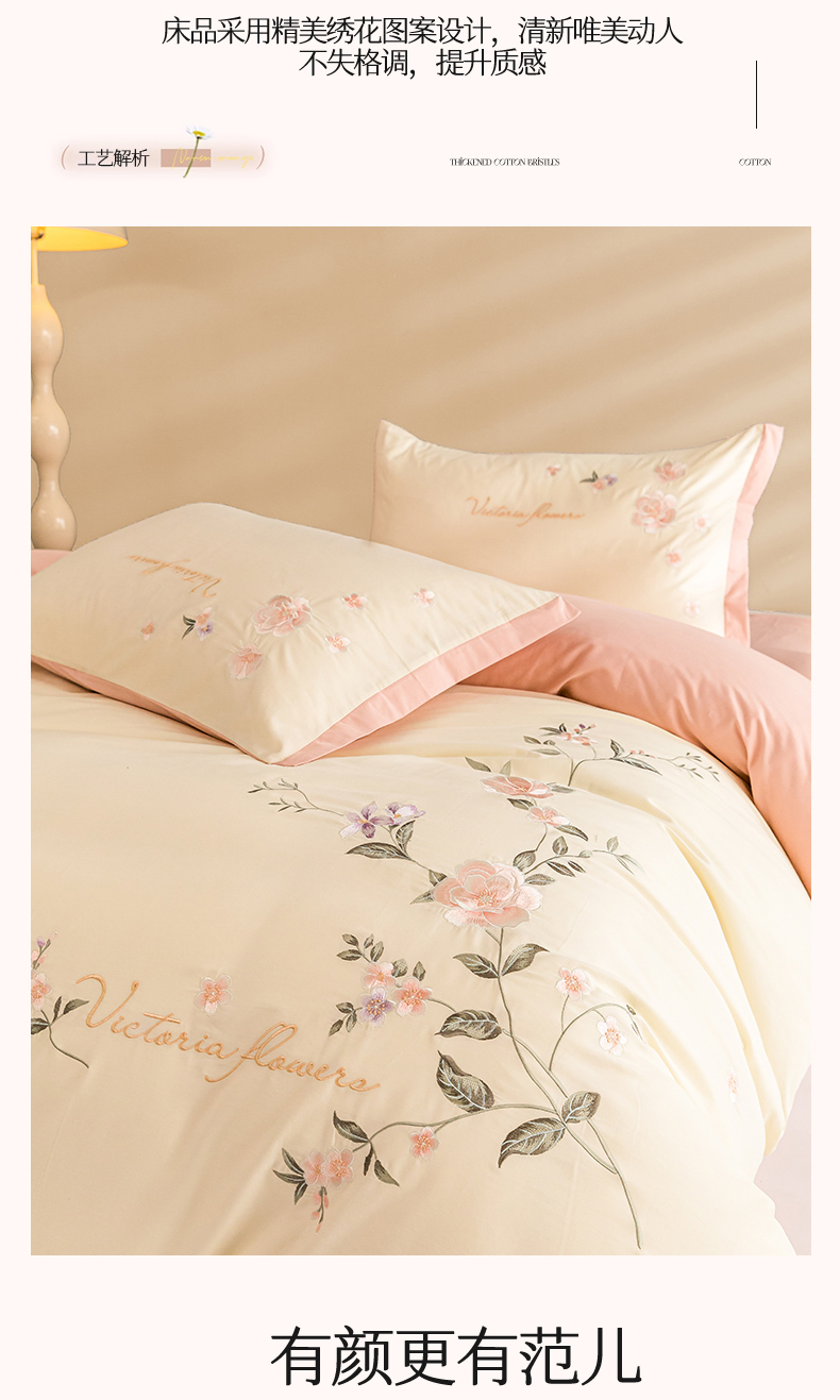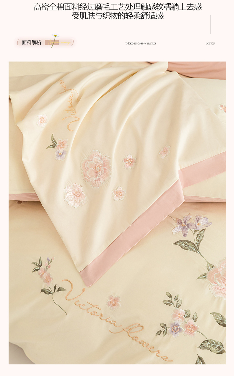商品名称:2024新保暖-秋冬A类100支全棉磨毛刺绣四件套-花语系列 花语-奶昔粉芋