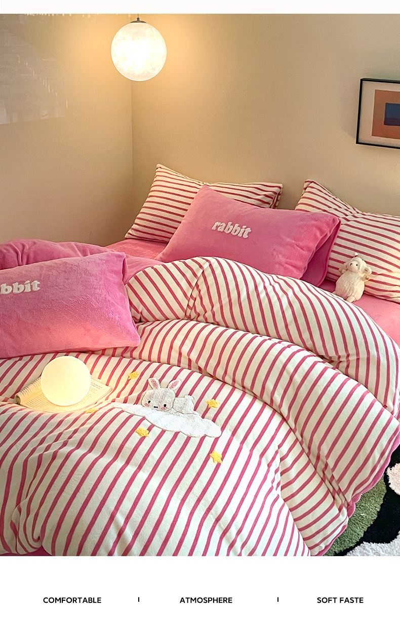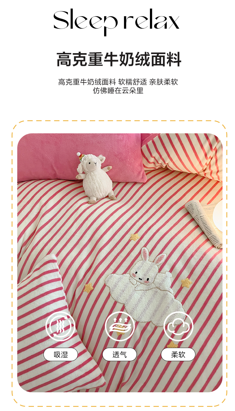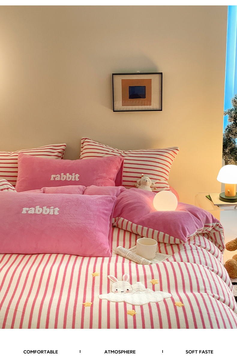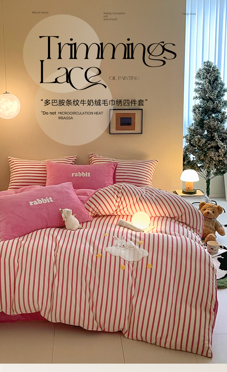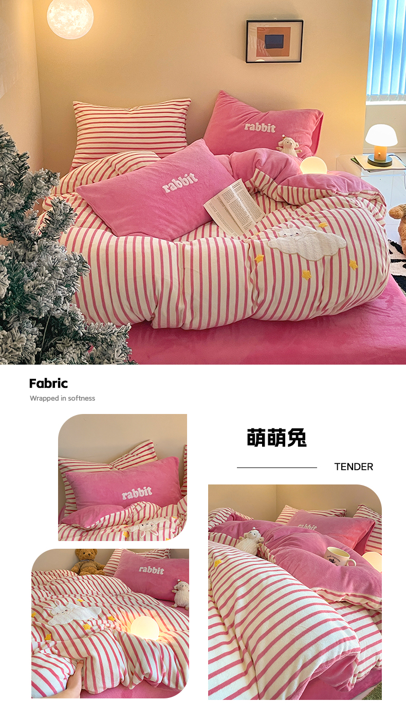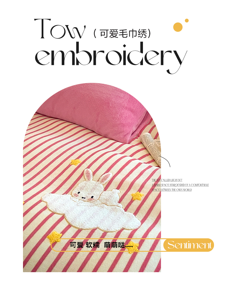 商品名称:如一 2024新款元素毛巾绣条纹牛奶绒四件套 萌萌兔