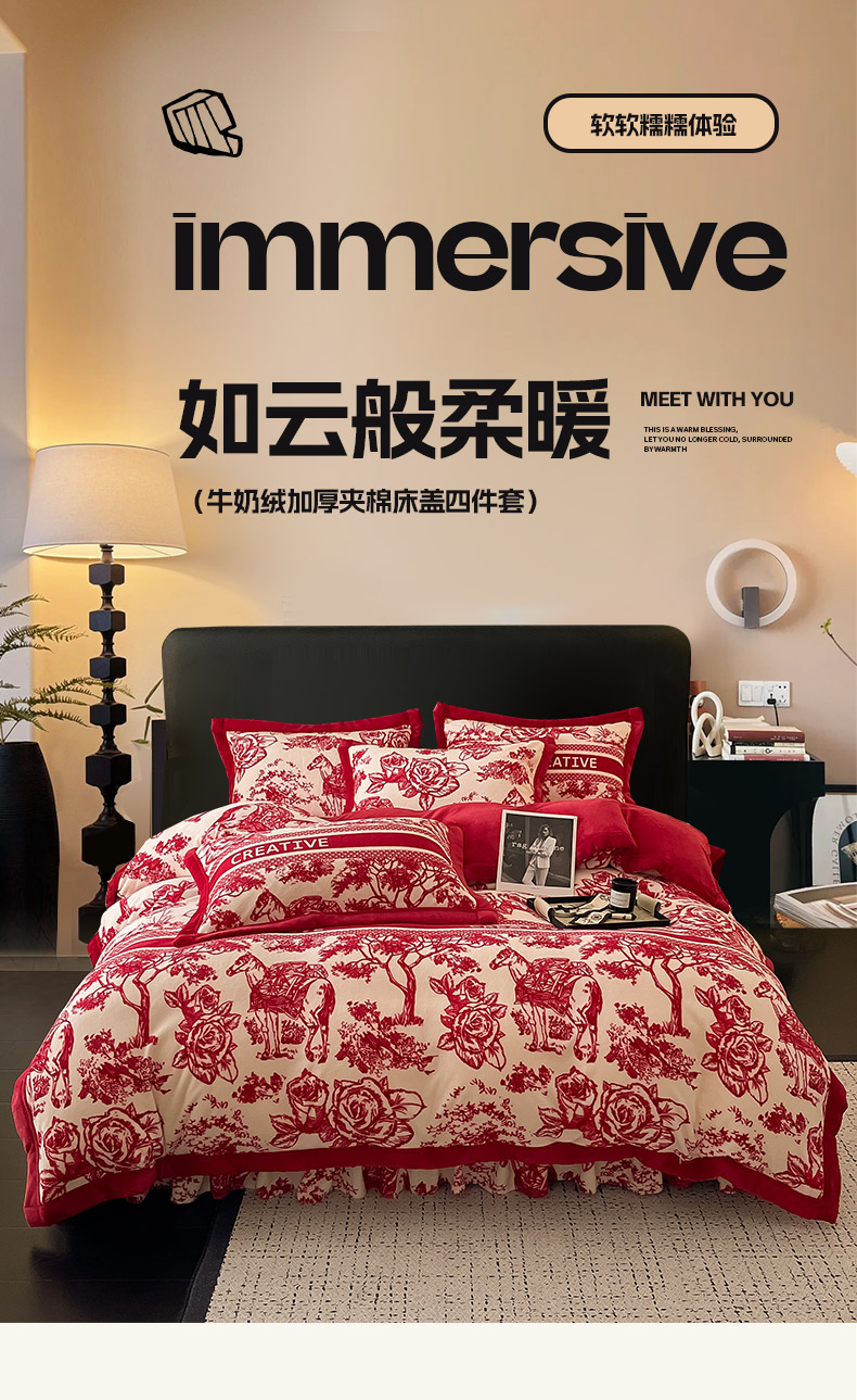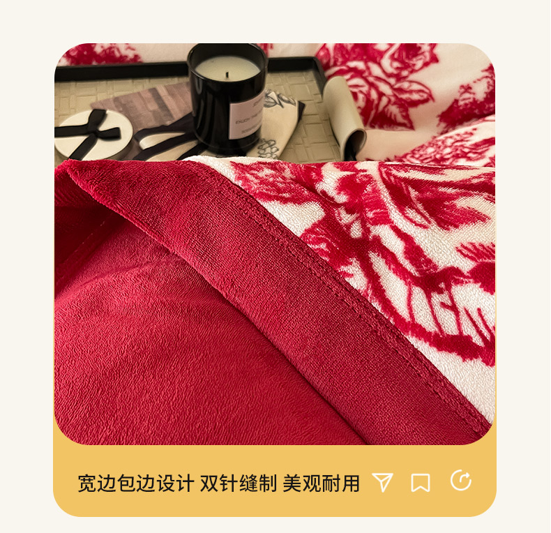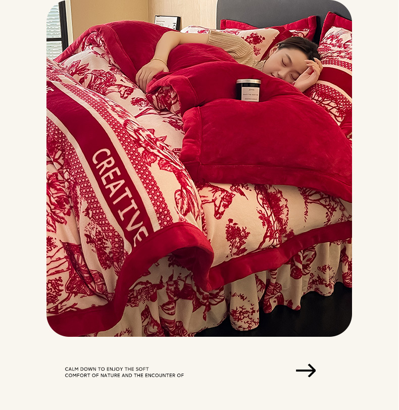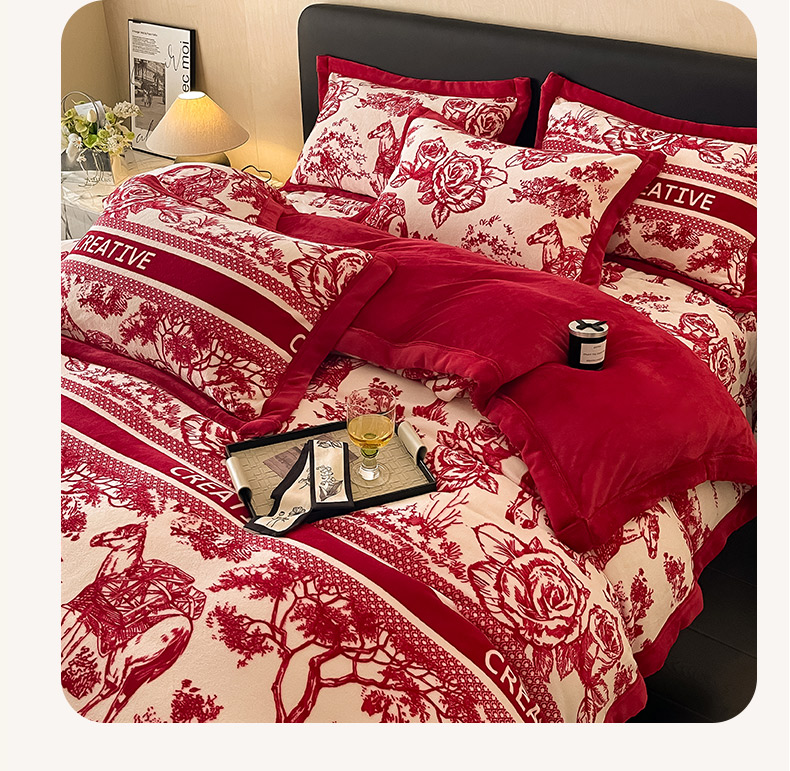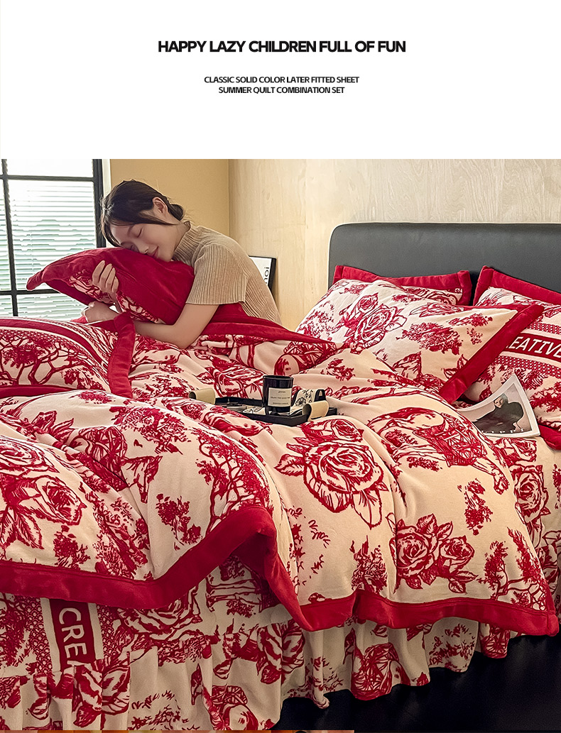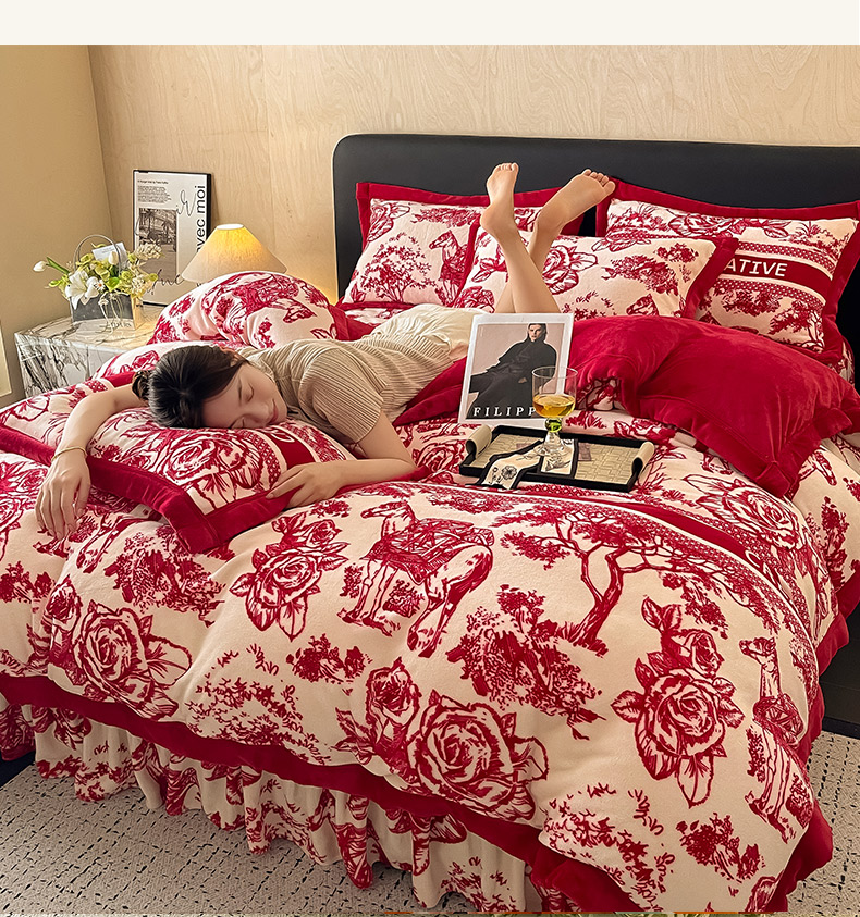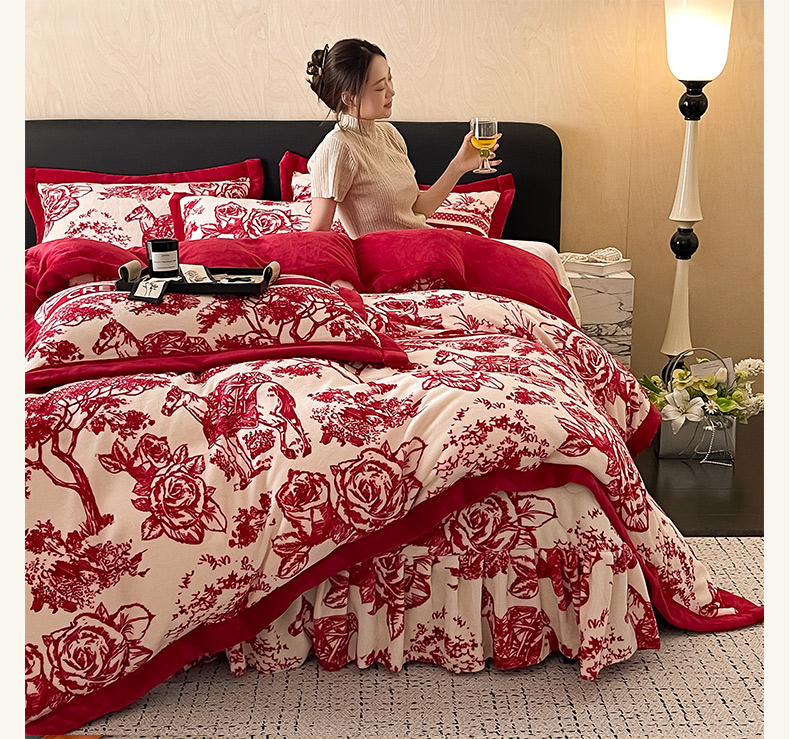商品名称:茉保家纺 2024新款包边款印花牛奶绒床盖四件套 北欧花季 -红