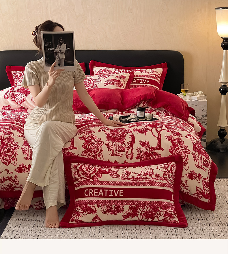 茉保家纺 2024新款包边款印花牛奶绒床盖四件套 北欧花季 -红