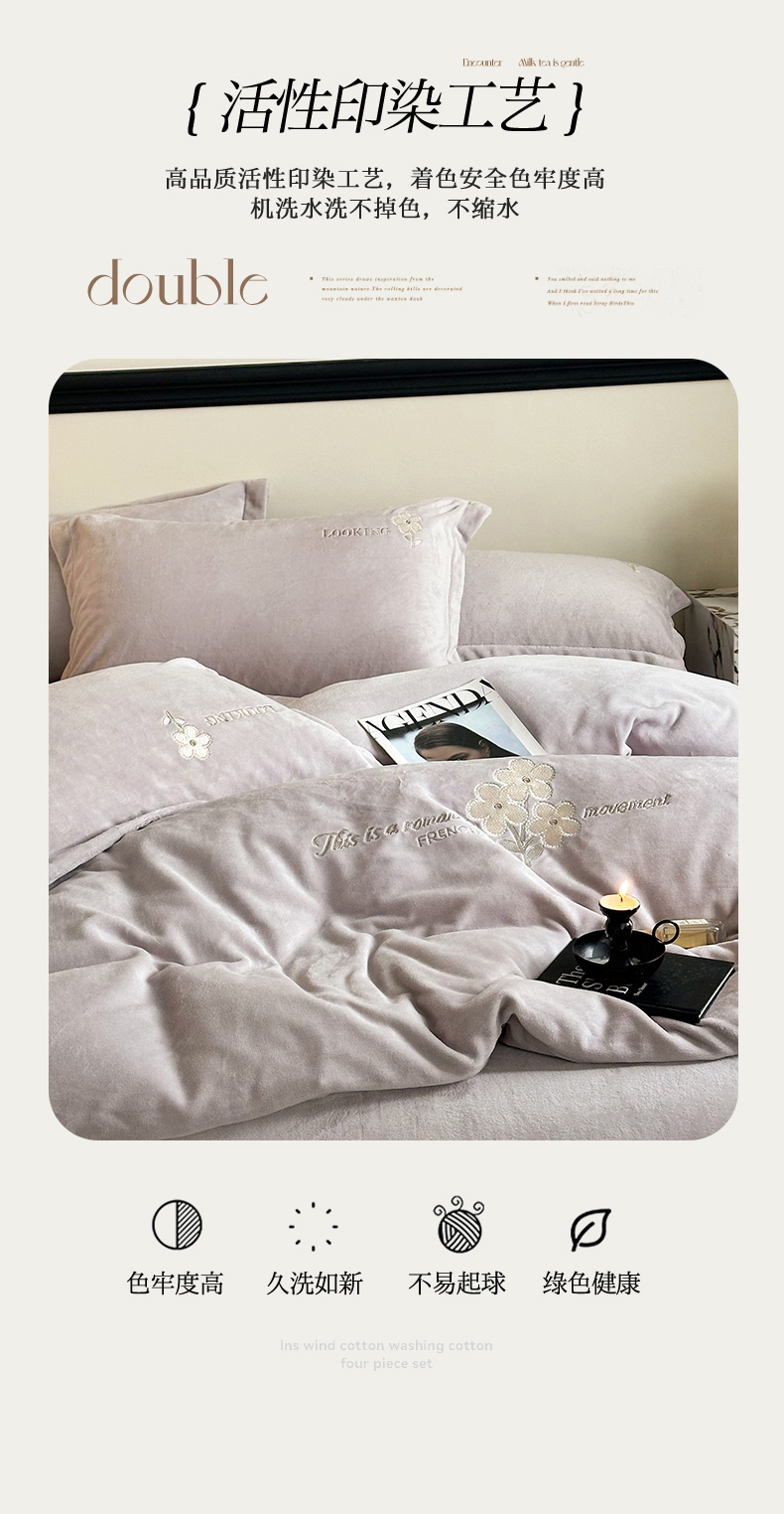 泽西家纺 2024秋冬新款加厚保暖A类小清新刺绣牛奶绒四件套-米娅 淡雅紫
