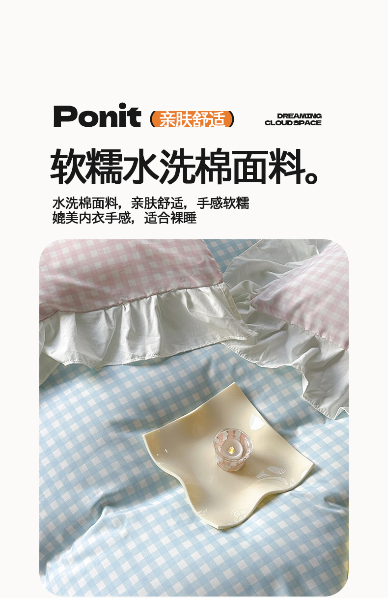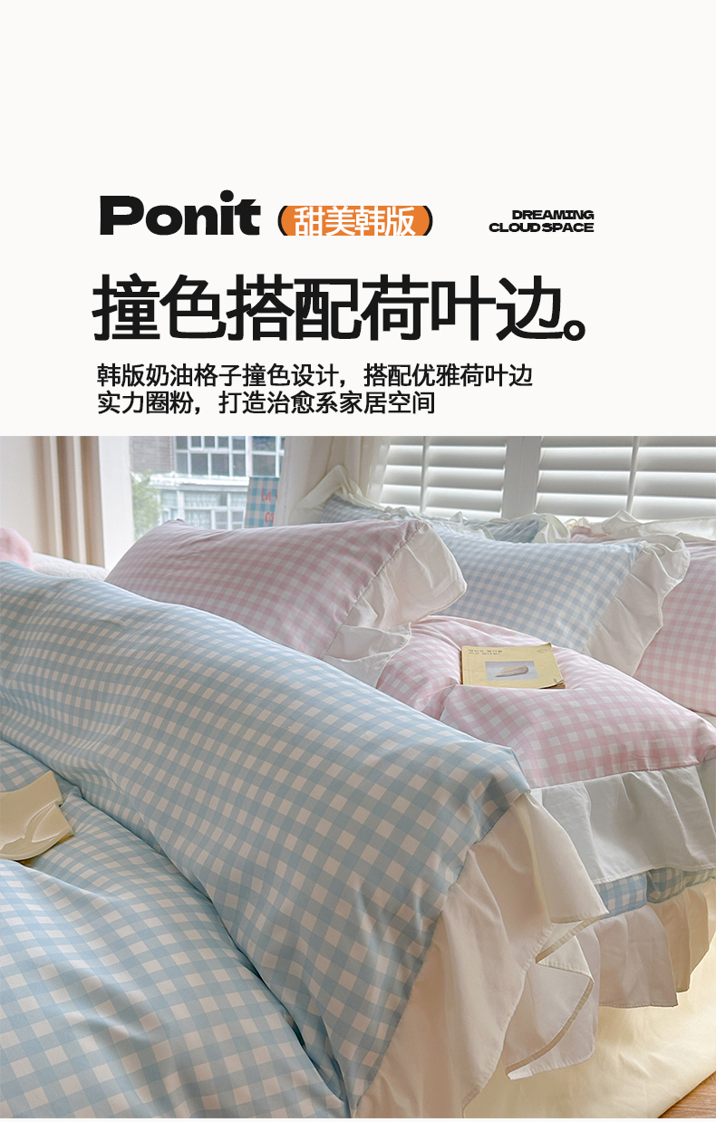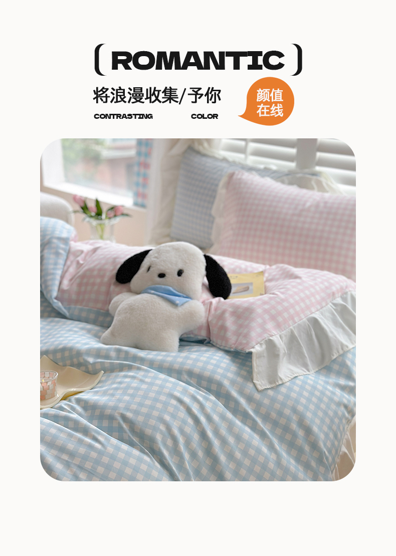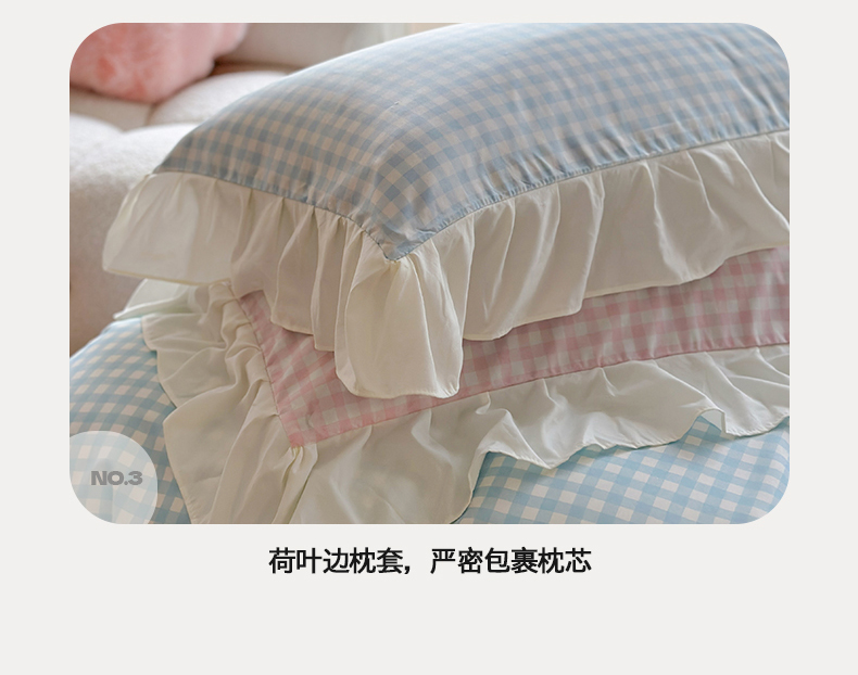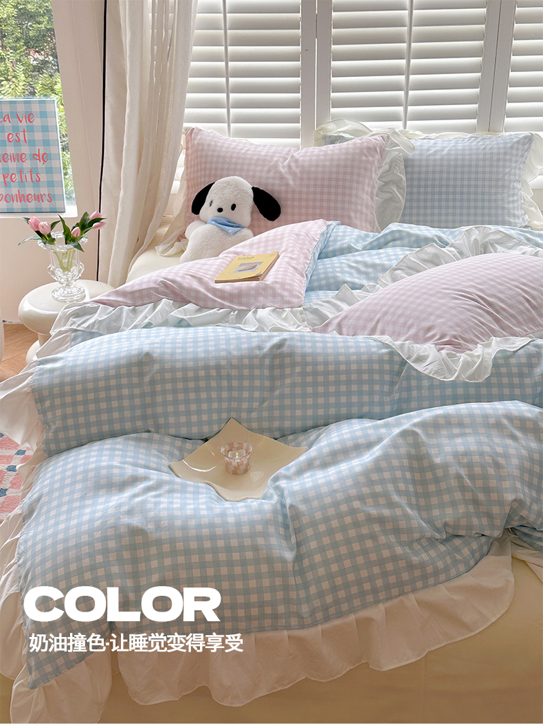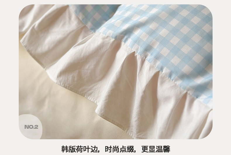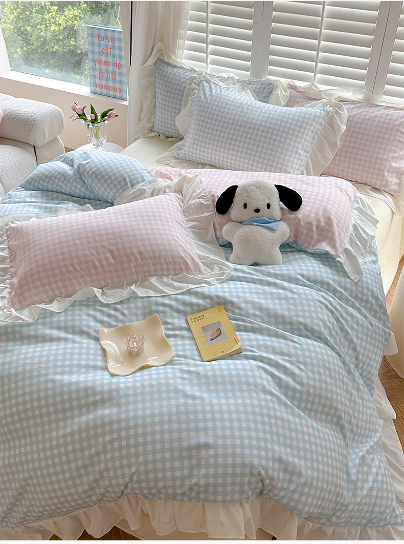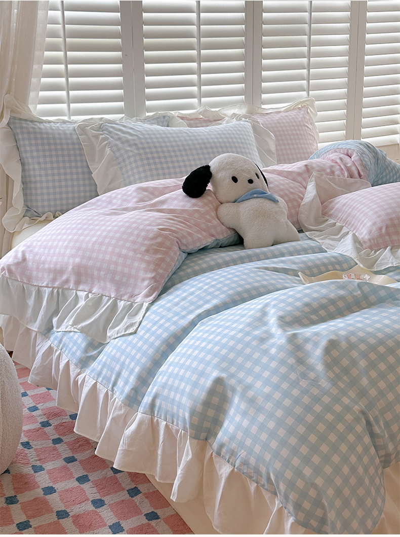 当前位置: 91家纺网 > 商品网购 > 床品套件 > 四件套 > 水洗棉四件套 > 桃心家居 2024新款A类亲肤舒适软糯云柔水洗棉化纤韩版奶油格子撞色水洗棉系列四件套 水洗棉花边-H蓝格粉格