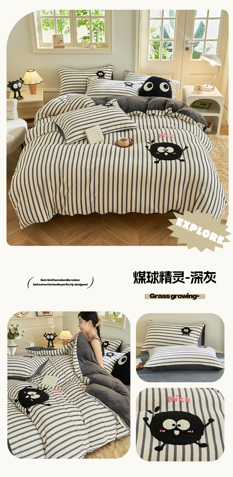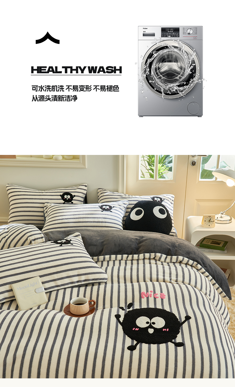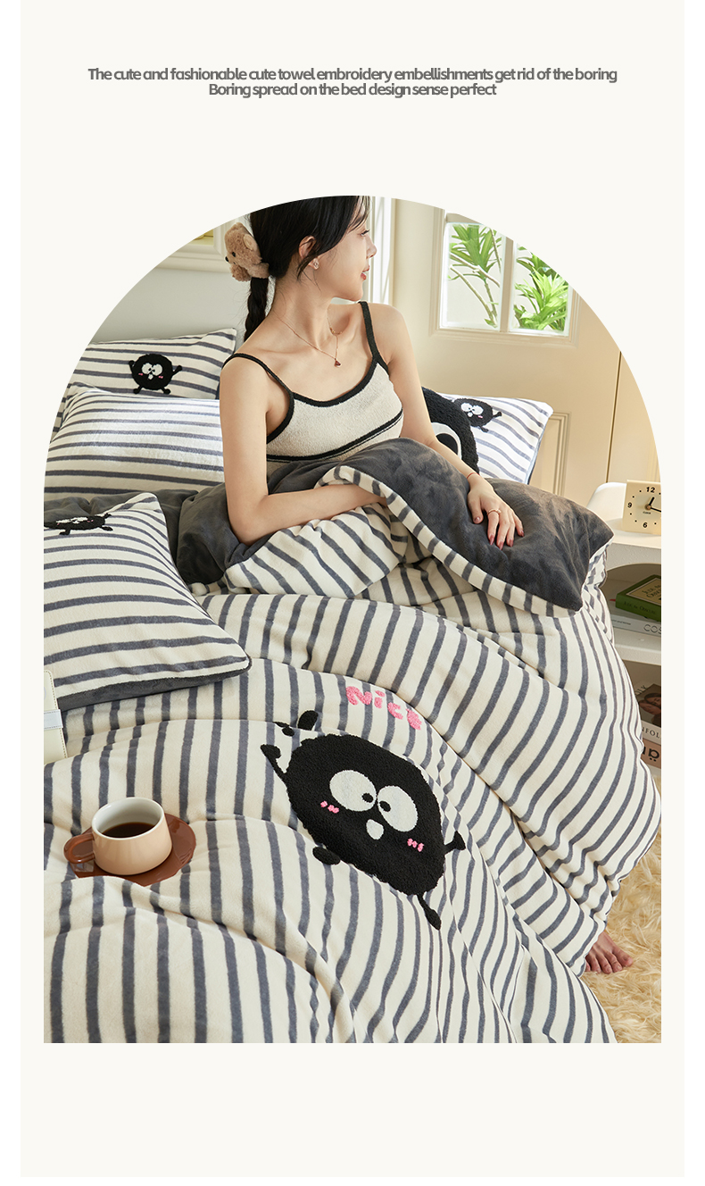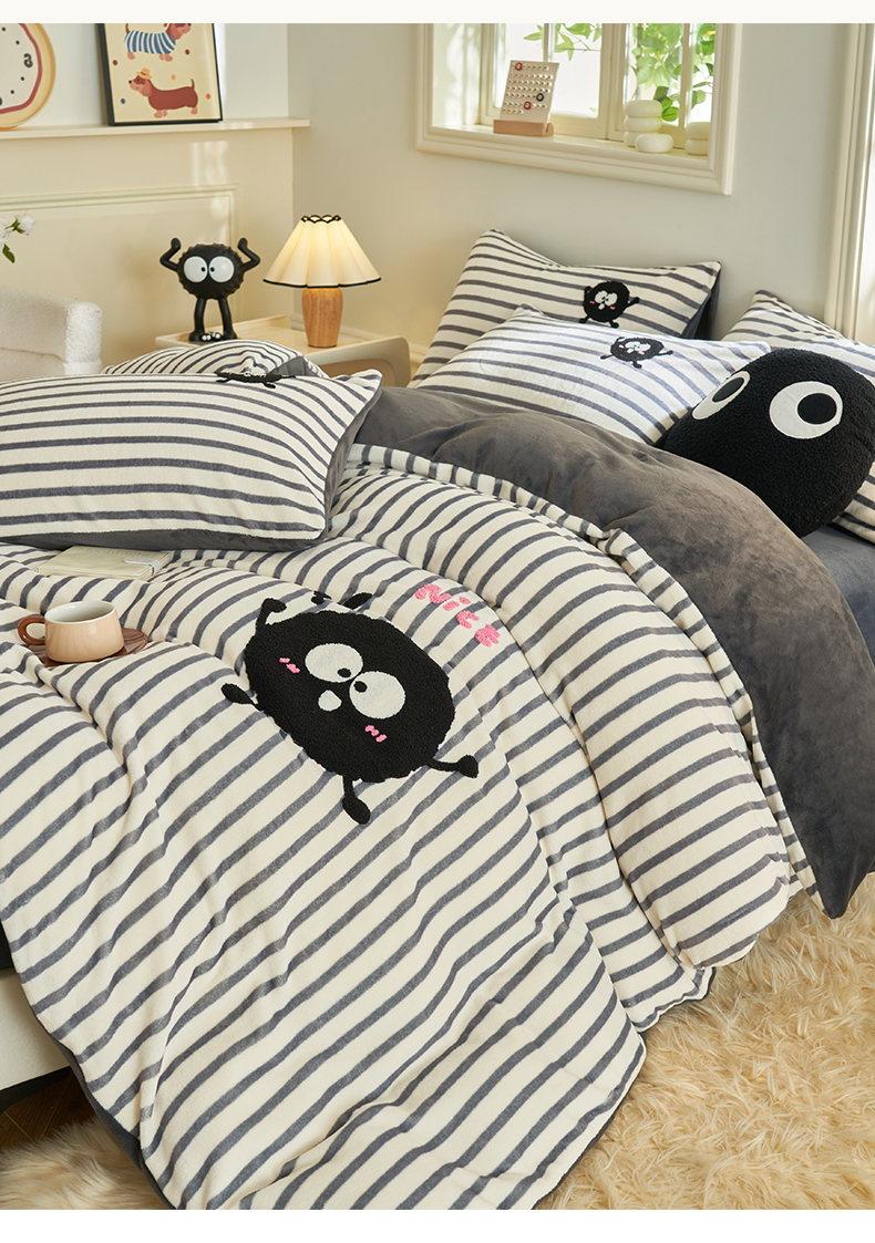 • 91家纺网 家纺一手货源 找家纺 晨曦家纺 2024新款毛巾绣牛奶绒卡通单被套 煤球精灵-深灰
