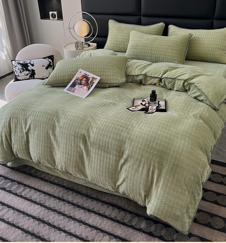 商品名称:菡宝 2024新款贝壳边无印风230g雕花绒单被套 菱形格-香草绿