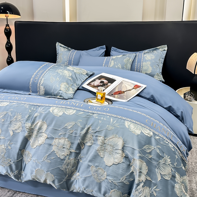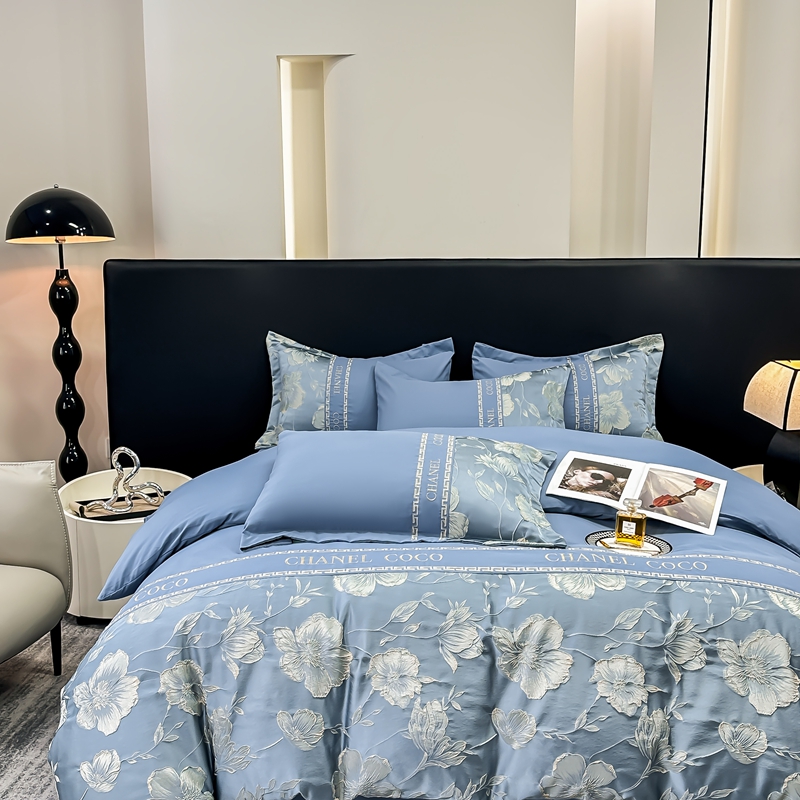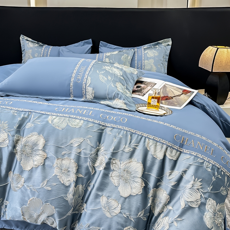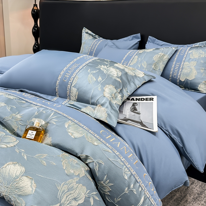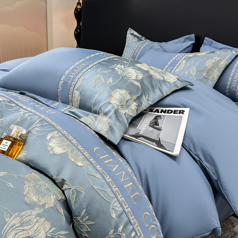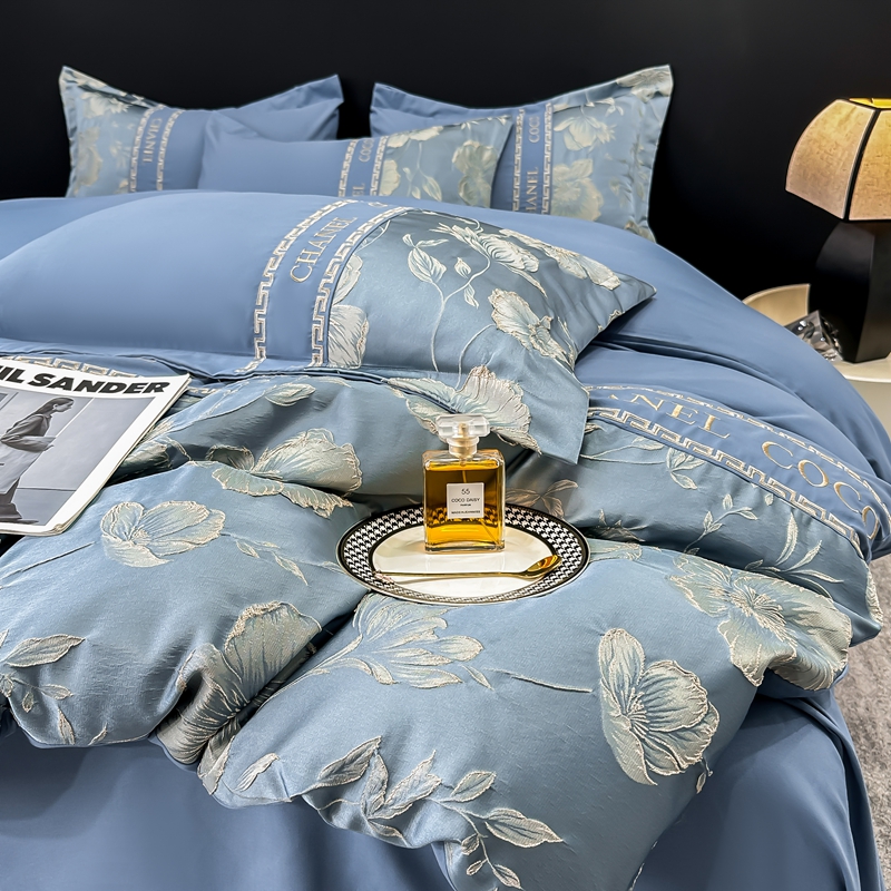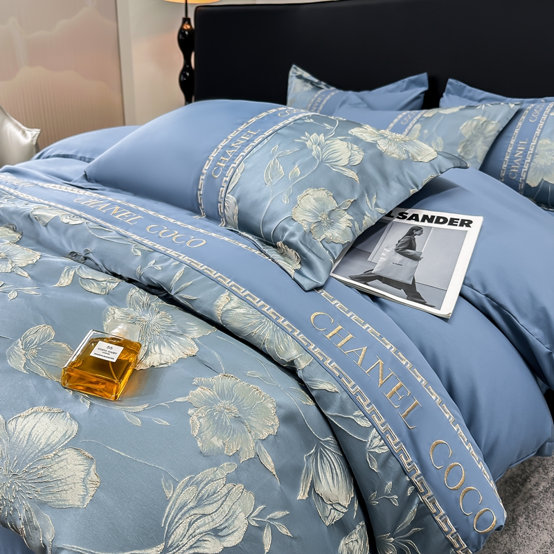 (总)宅家居 2023新款 设计款轻奢高精密贡缎提花臻品真丝四件套,迪奥-宾利蓝,迪奥-银灰,山茶花-粉玉,山茶花-蓝灰,山茶花-浅紫,香乃乃-米白