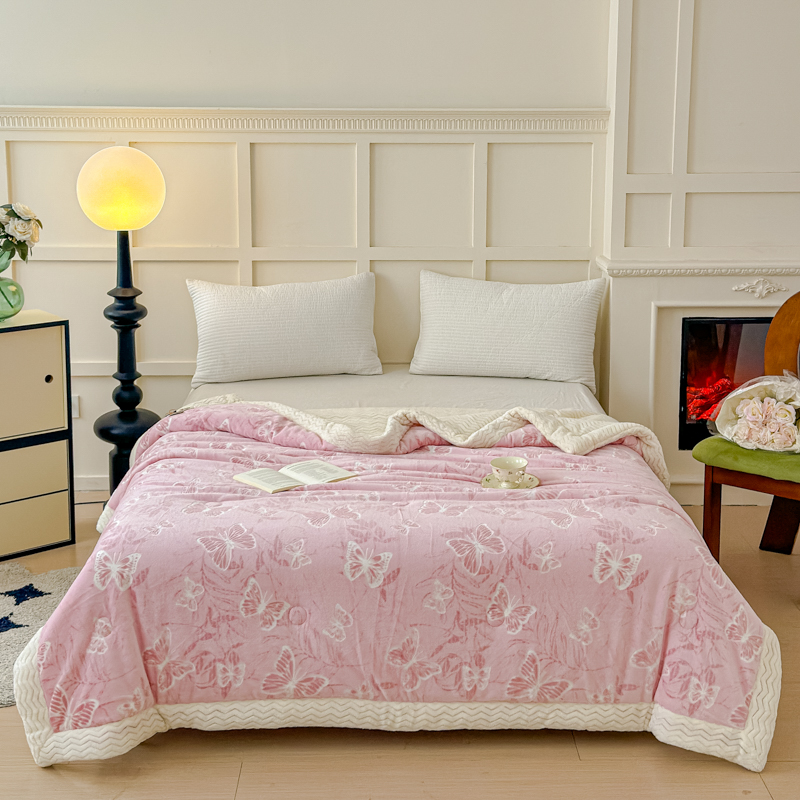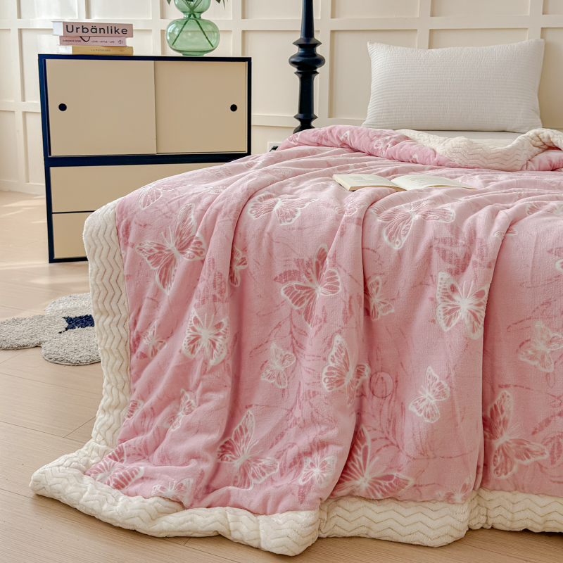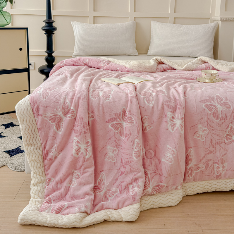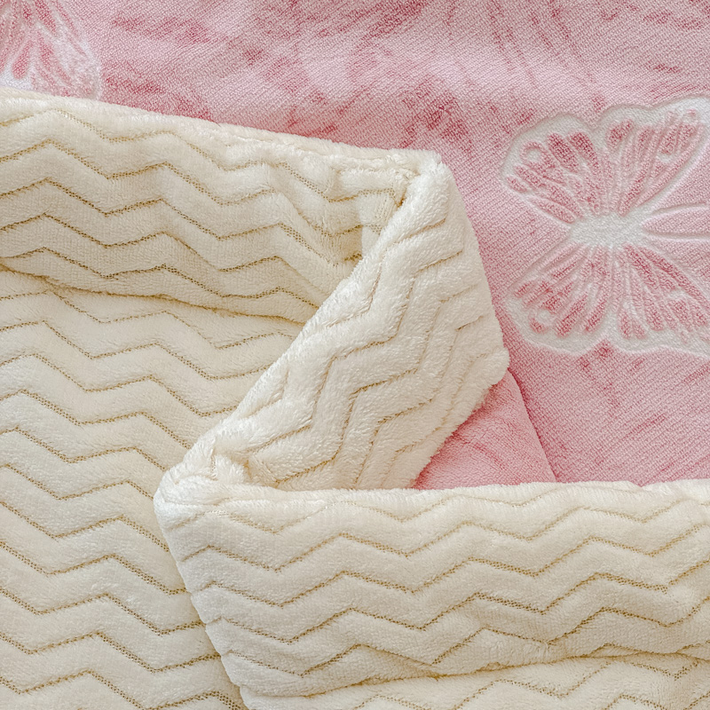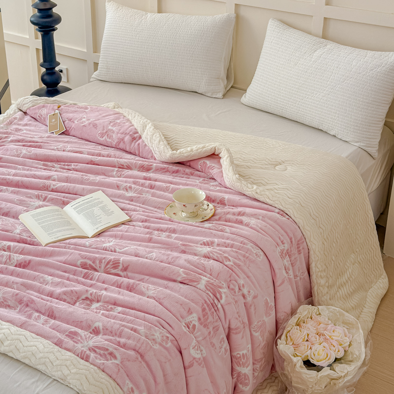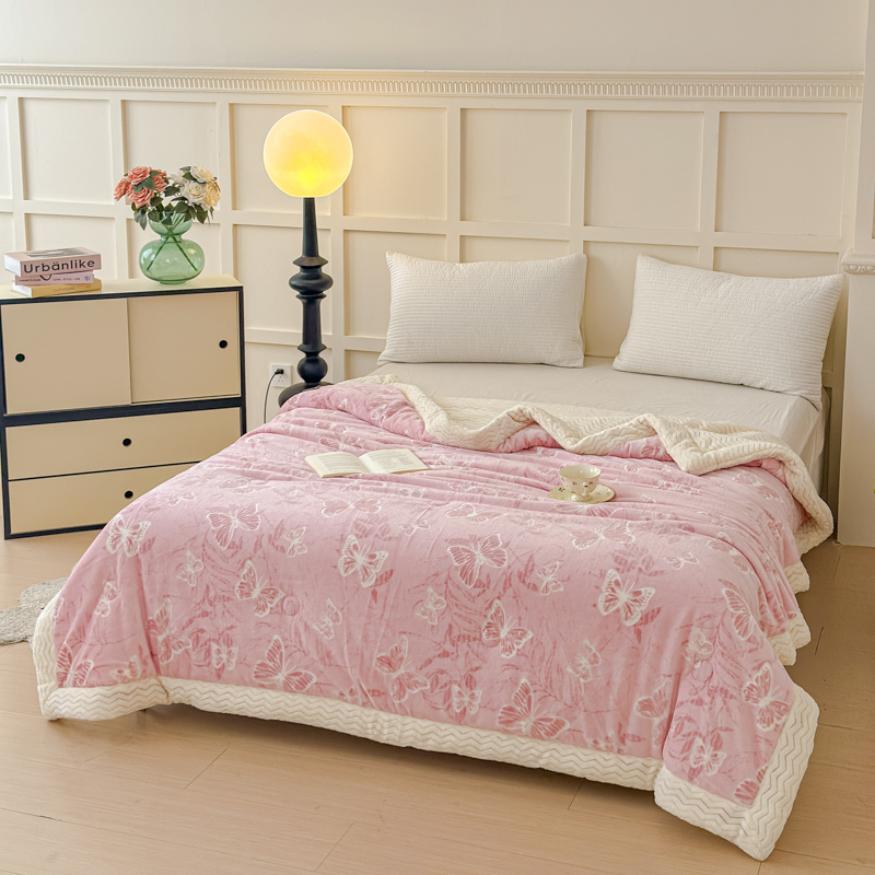 商品名称:金丝鸟 2024加厚240g立体雕花牛奶绒夹棉绗缝手包毛毯毯子 蝴蝶飞粉 手包毯