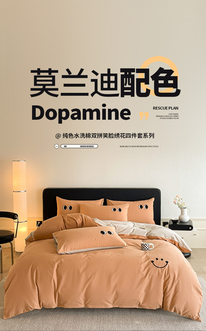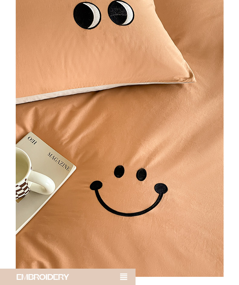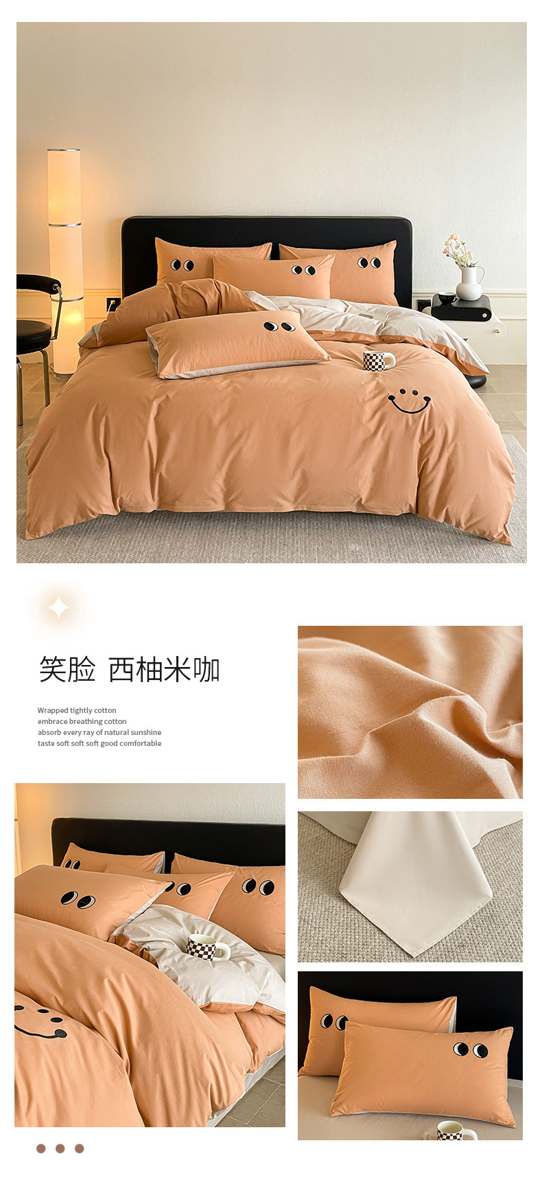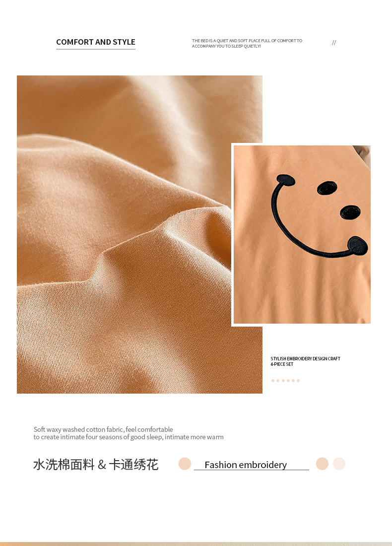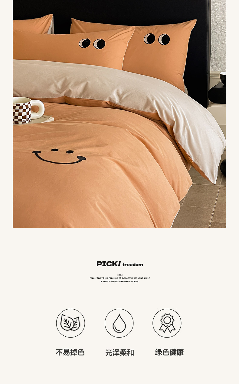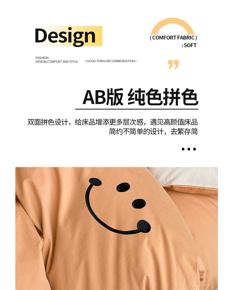 当前位置: 91家纺网 > 商品网购 > 床品套件 > 四件套 > 水洗棉四件套 > ab家纺 2025新款纯色水洗棉笑脸双拼绣花四件套 笑脸 西柚米咖