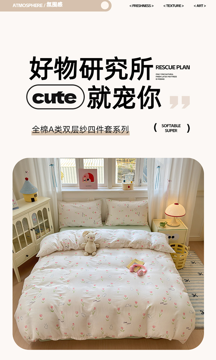 2025新款全棉A类双层纱四件套系列-叠拍 郁金香小兔