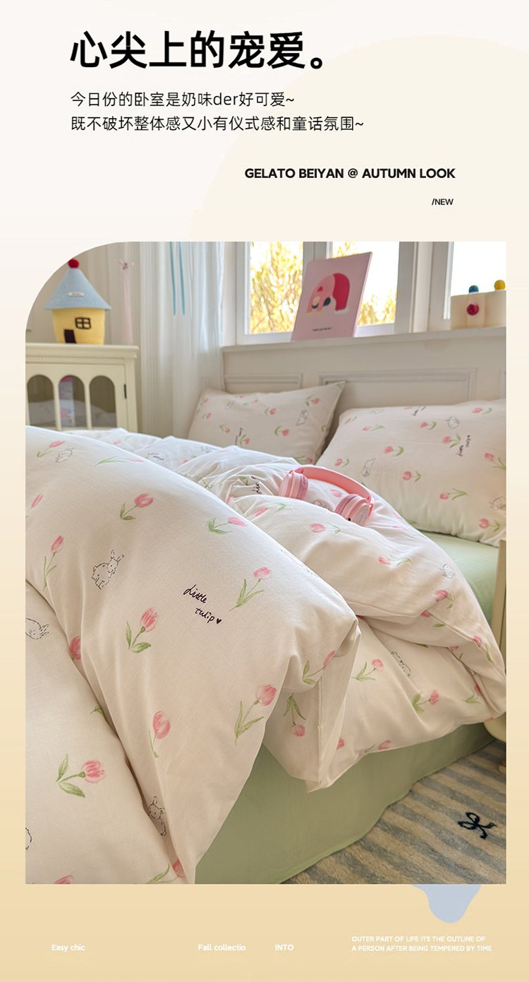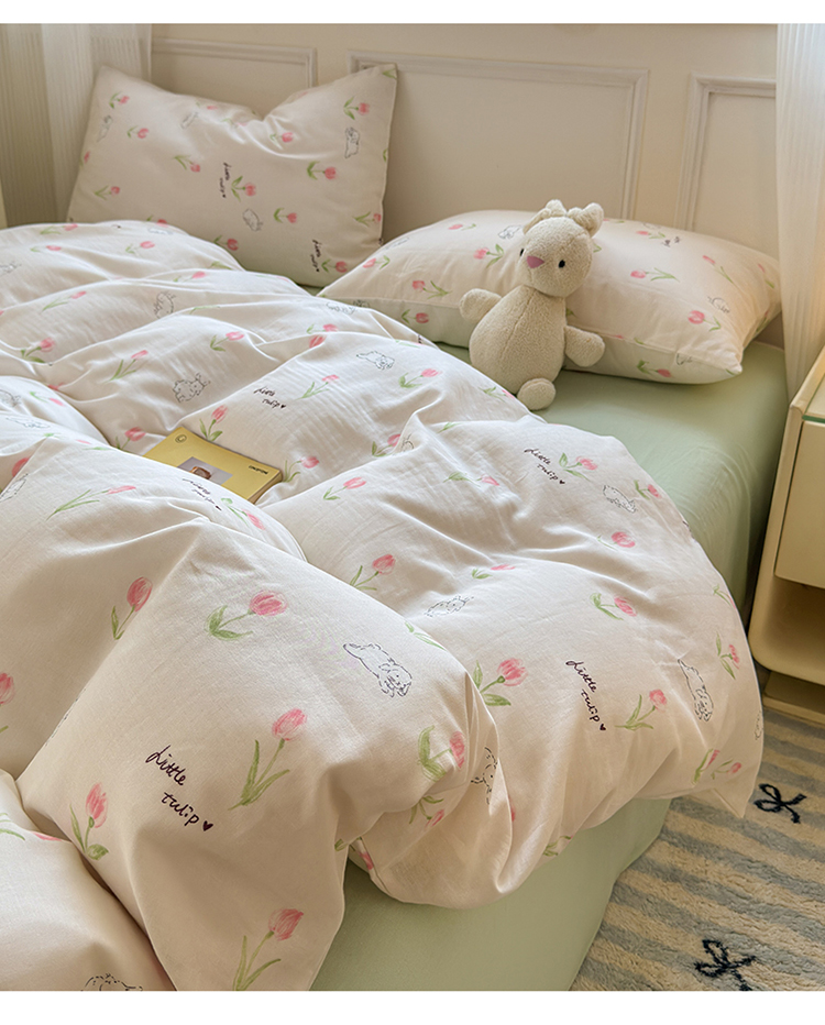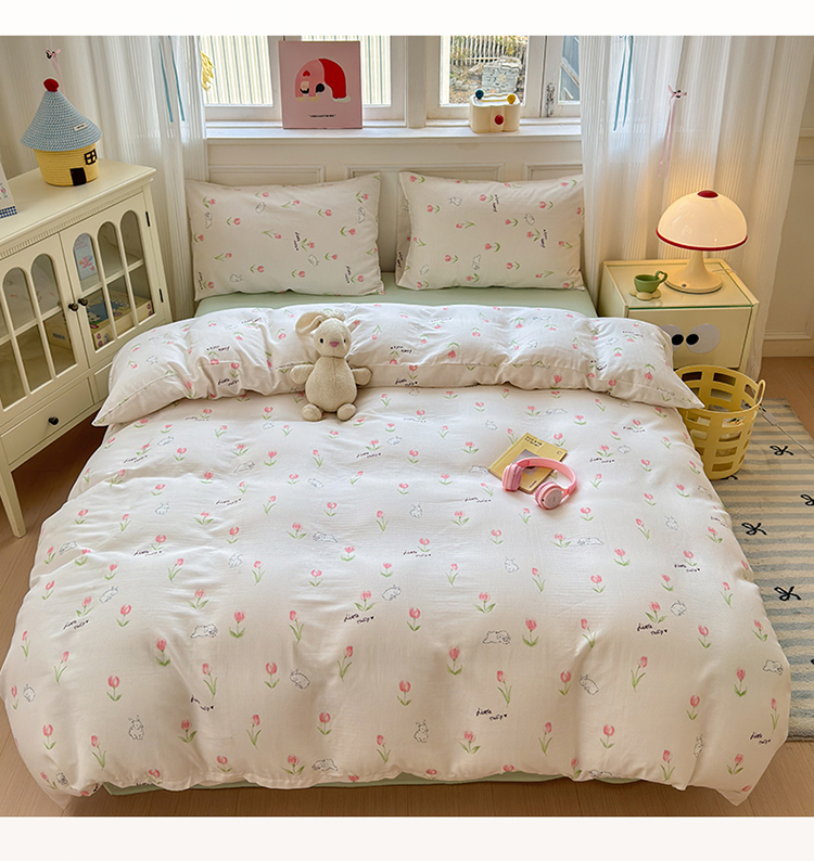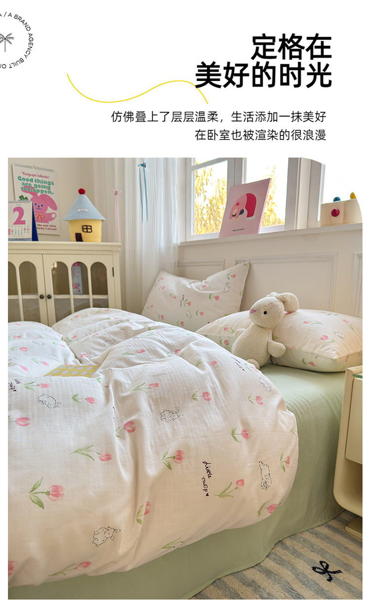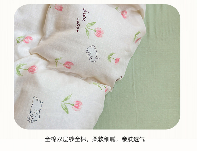 商品名称:2025新款全棉A类双层纱四件套系列-叠拍 郁金香小兔