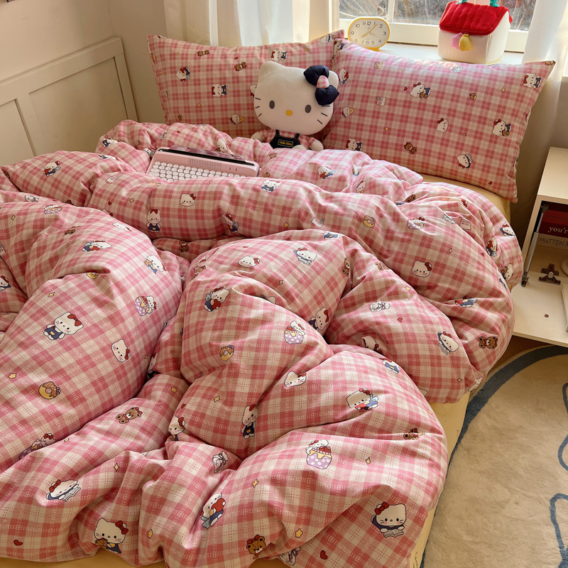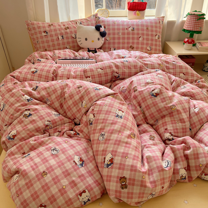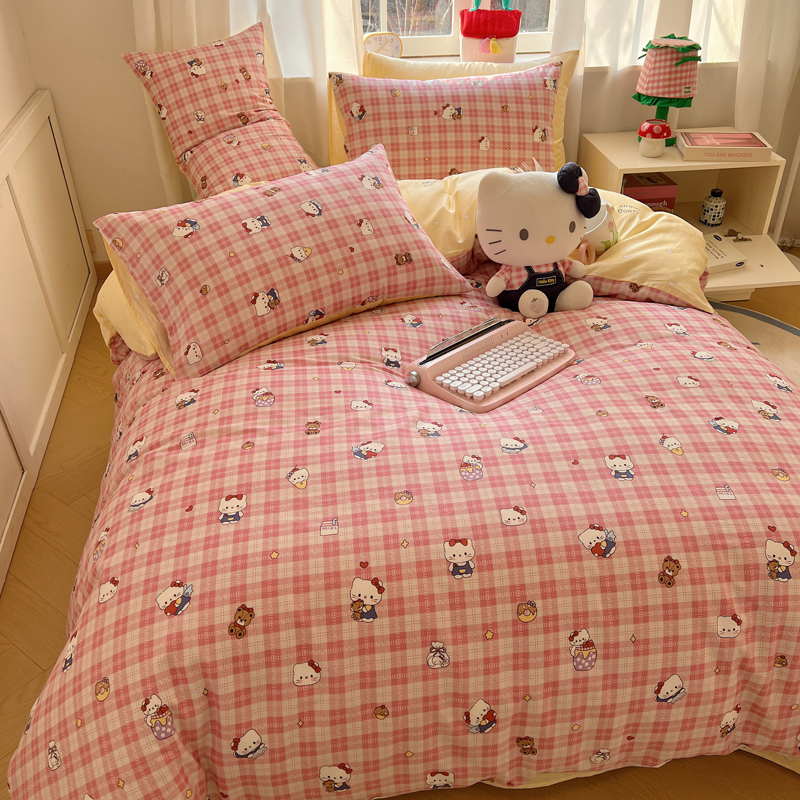 桃喜 2025新款春夏全棉卡通13070小清新四件套 粉格小猫
