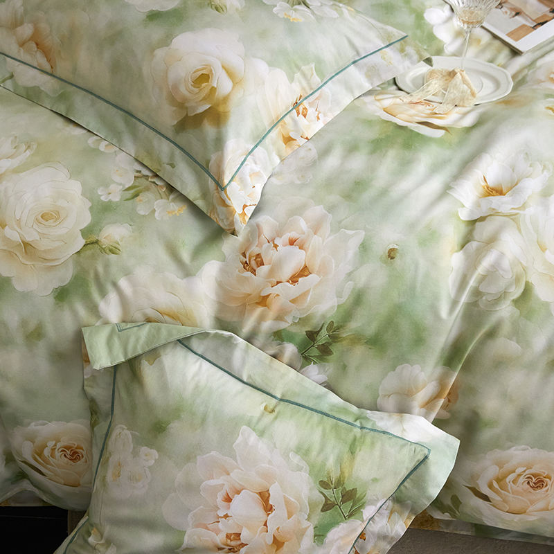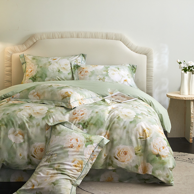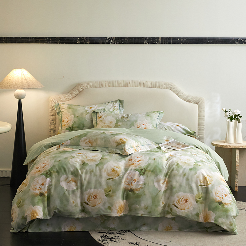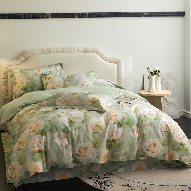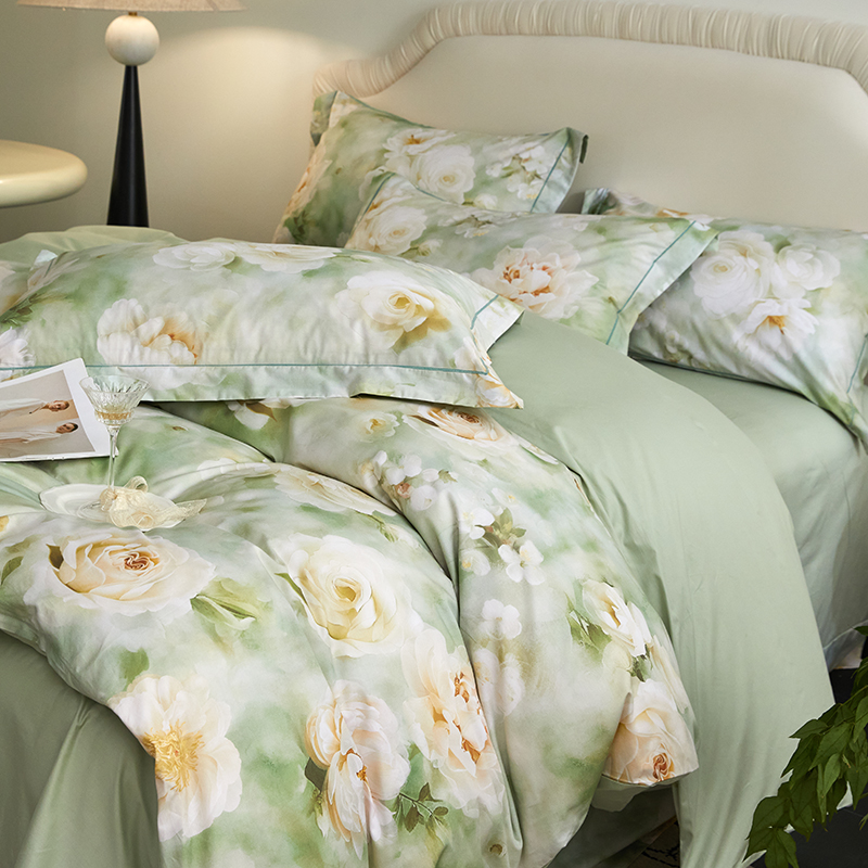 (总)薏思家纺 2025新款全棉100支数码印花生态磨毛轻奢款四件套-花边系列,橘子海,向云端,寻野-绿