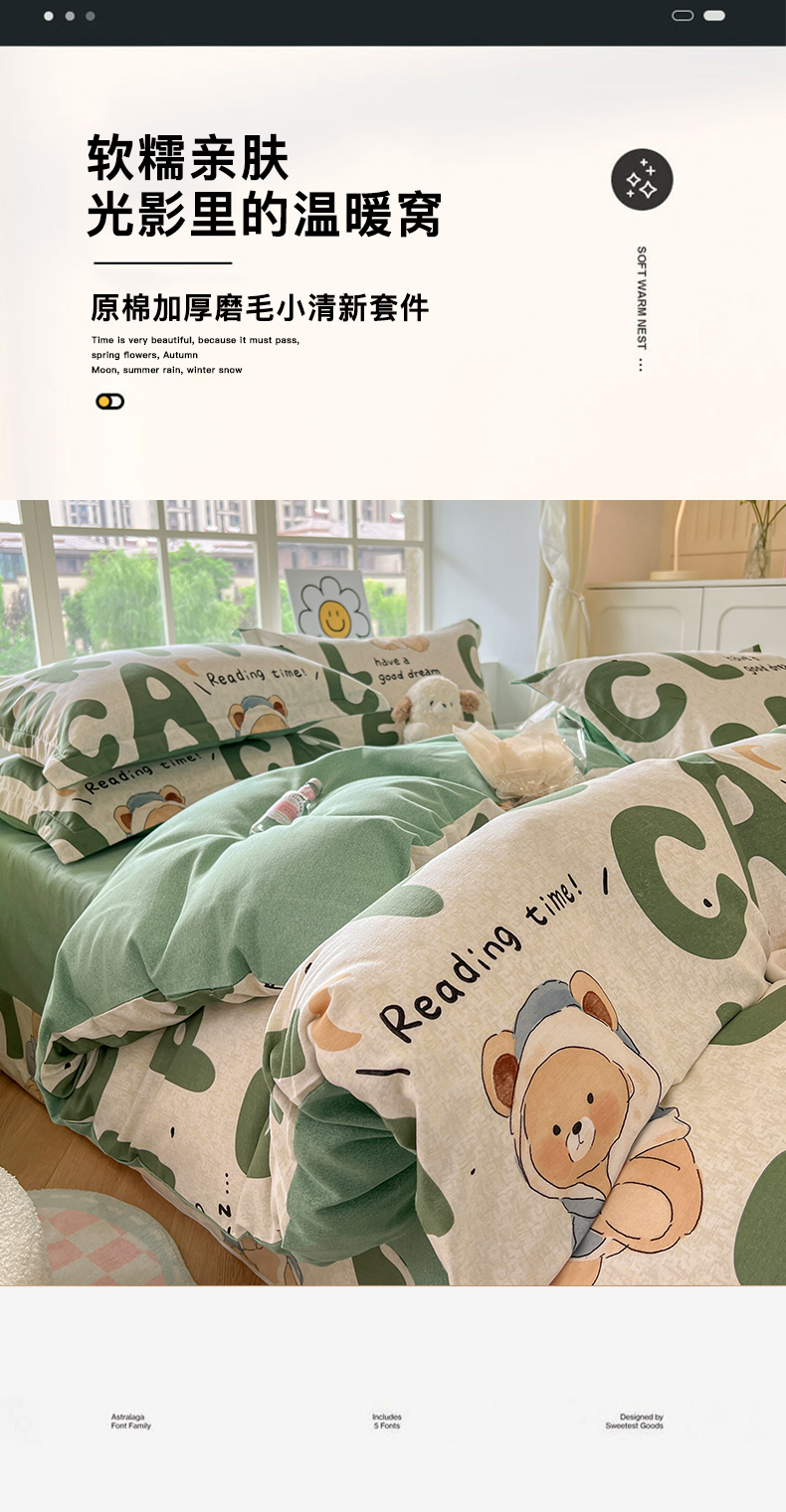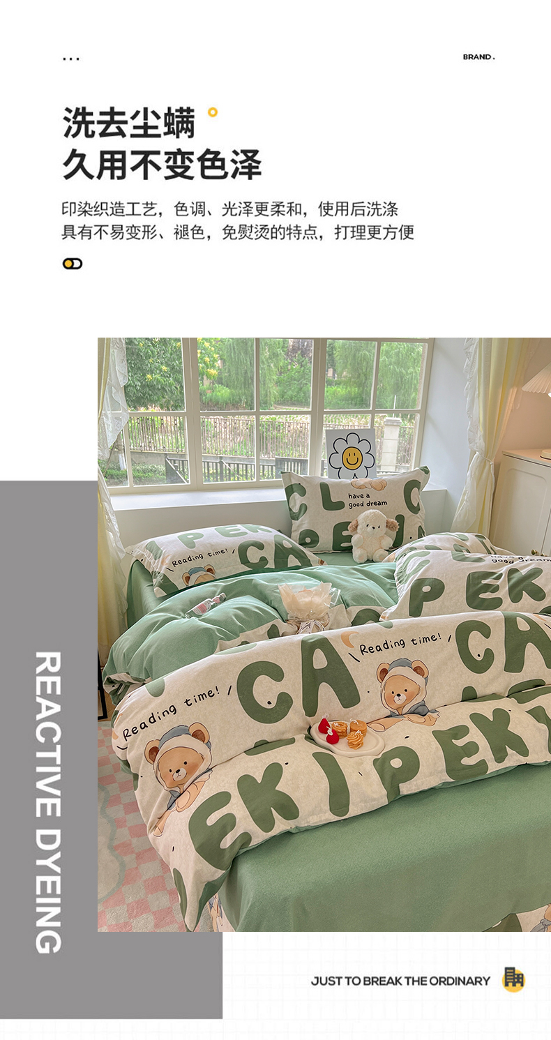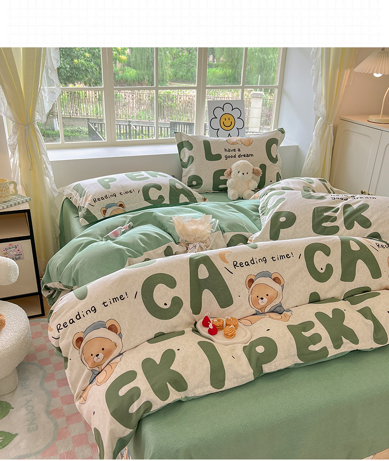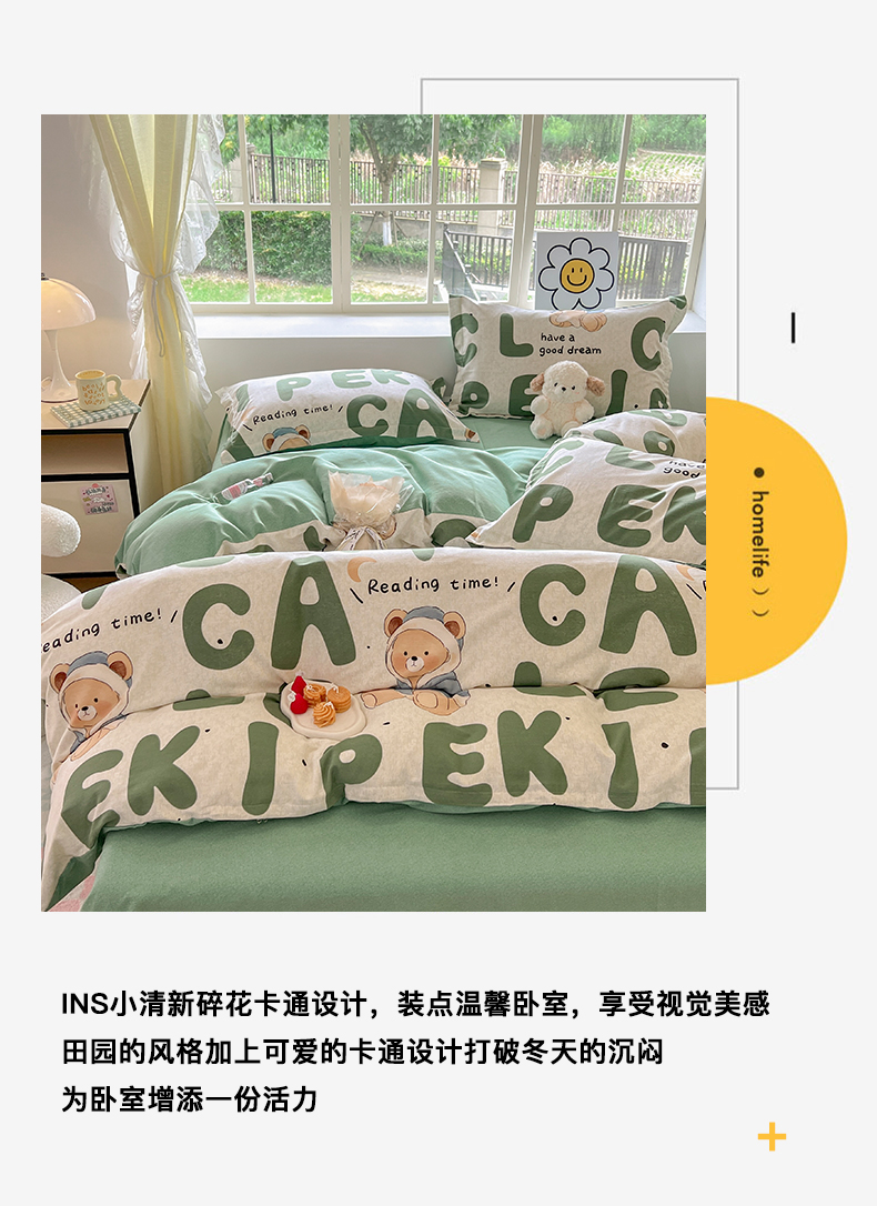 当前位置: 91家纺网 > 商品网购 > 床品套件 > 四件套 > 磨毛活性四件套 > (买家秀 爆款花色不断货)A类母婴级纯棉磨毛四件套简约可爱风纯棉四件套全棉四件套磨毛三件套 梦游记-绿
