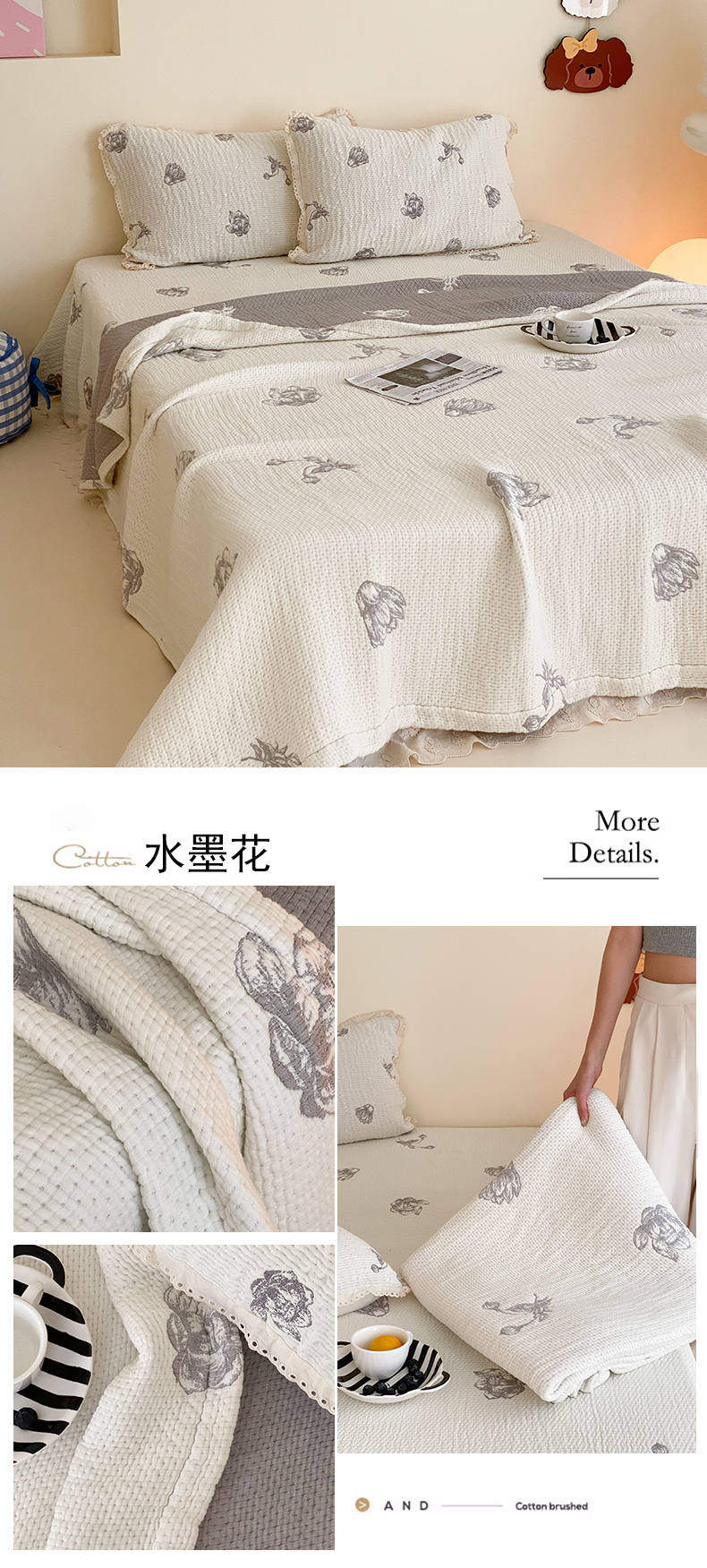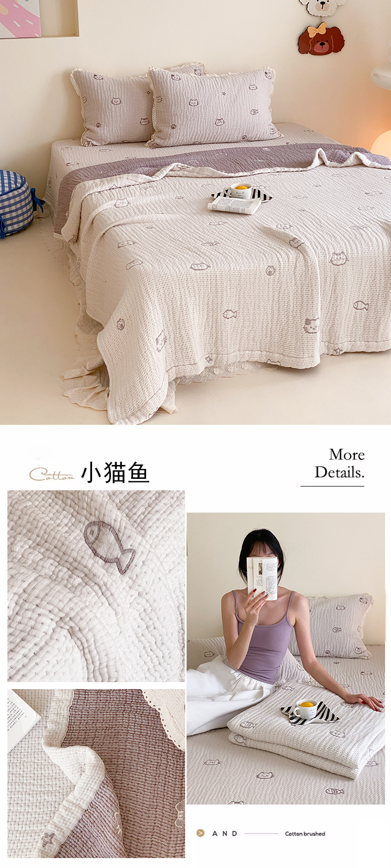 (总)麻依 2025新款韩国清新全棉纱布床盖三件套,憨憨熊,彩色南瓜,车厘子,两颗草莓,奶盖KT,奶油波点-灰,奶油彩点,水蓝KT,水墨花,丝带,桃心-米白,小猫鱼