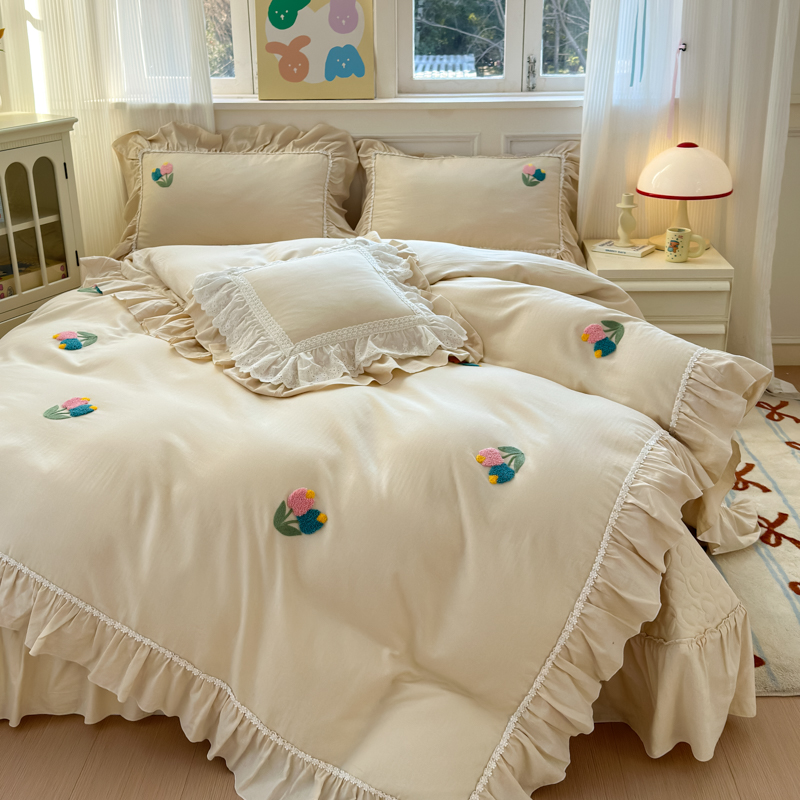 淑女公社家纺 2025春夏新款全棉人字纹毛巾绣床盖款四件套-郁金香 郁金香 嫩黄